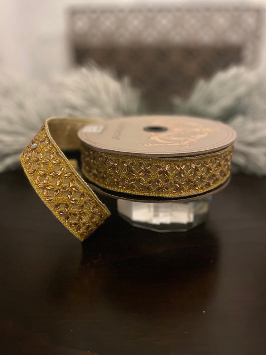 1.5” x 10 yds. Designer ribbon faux metallic dupion flower crystal trellis trim gold. D. Stevens.
