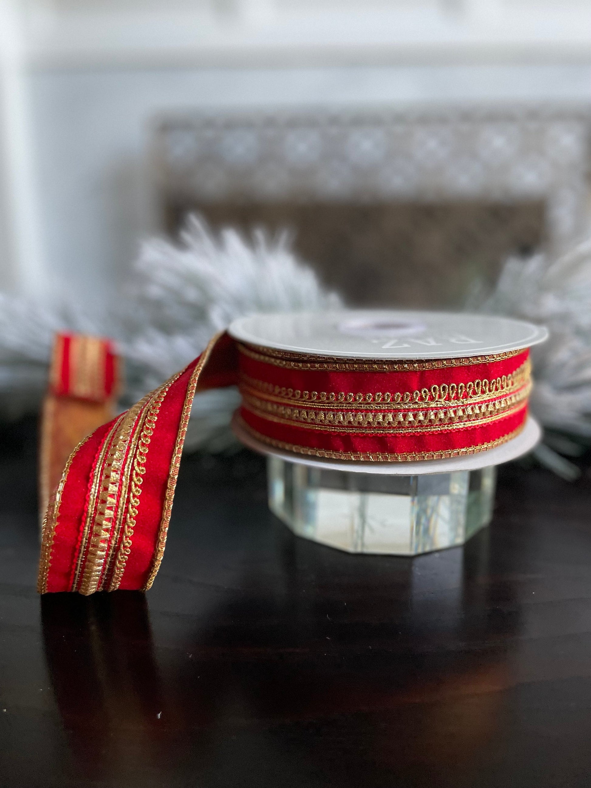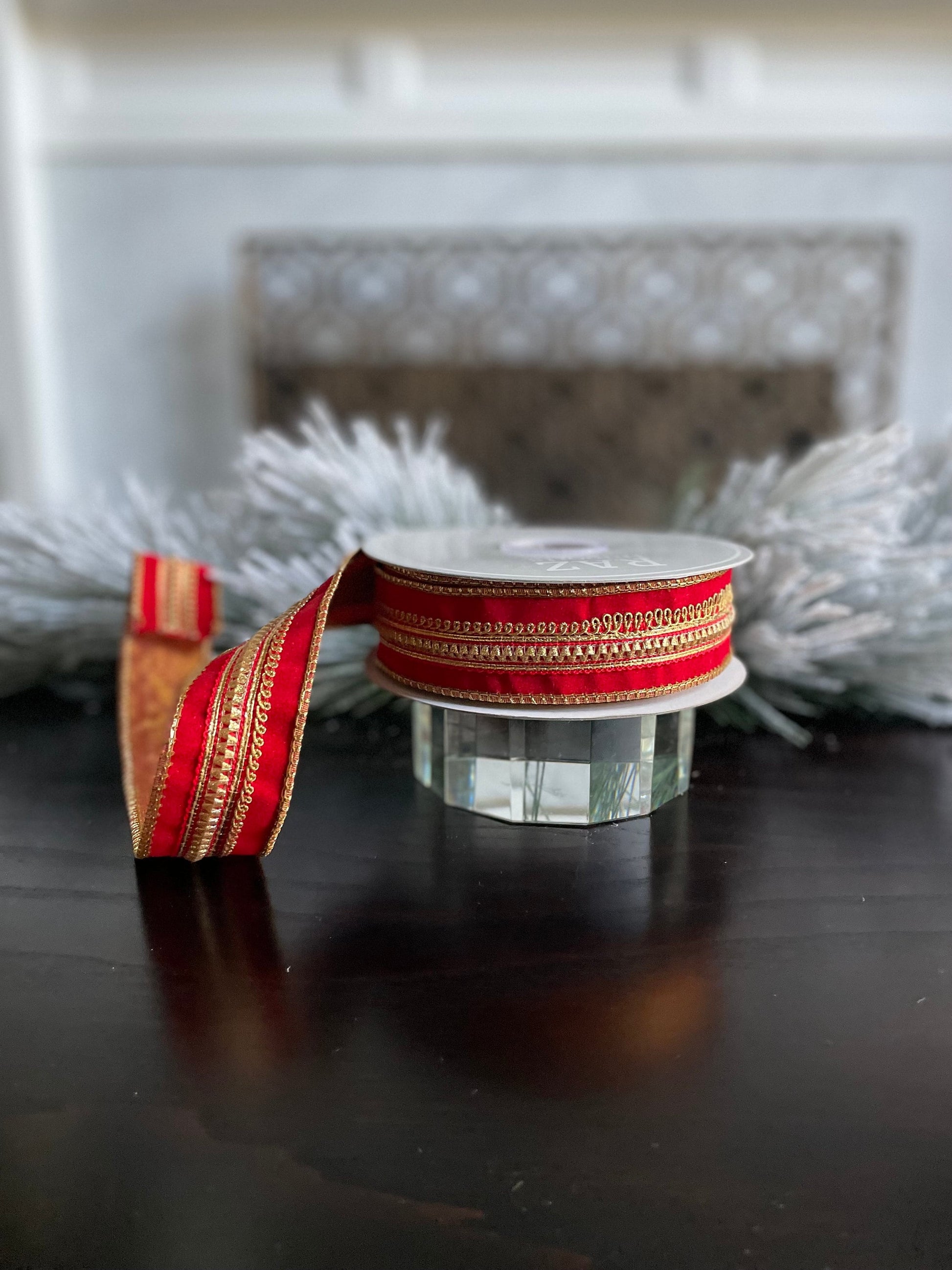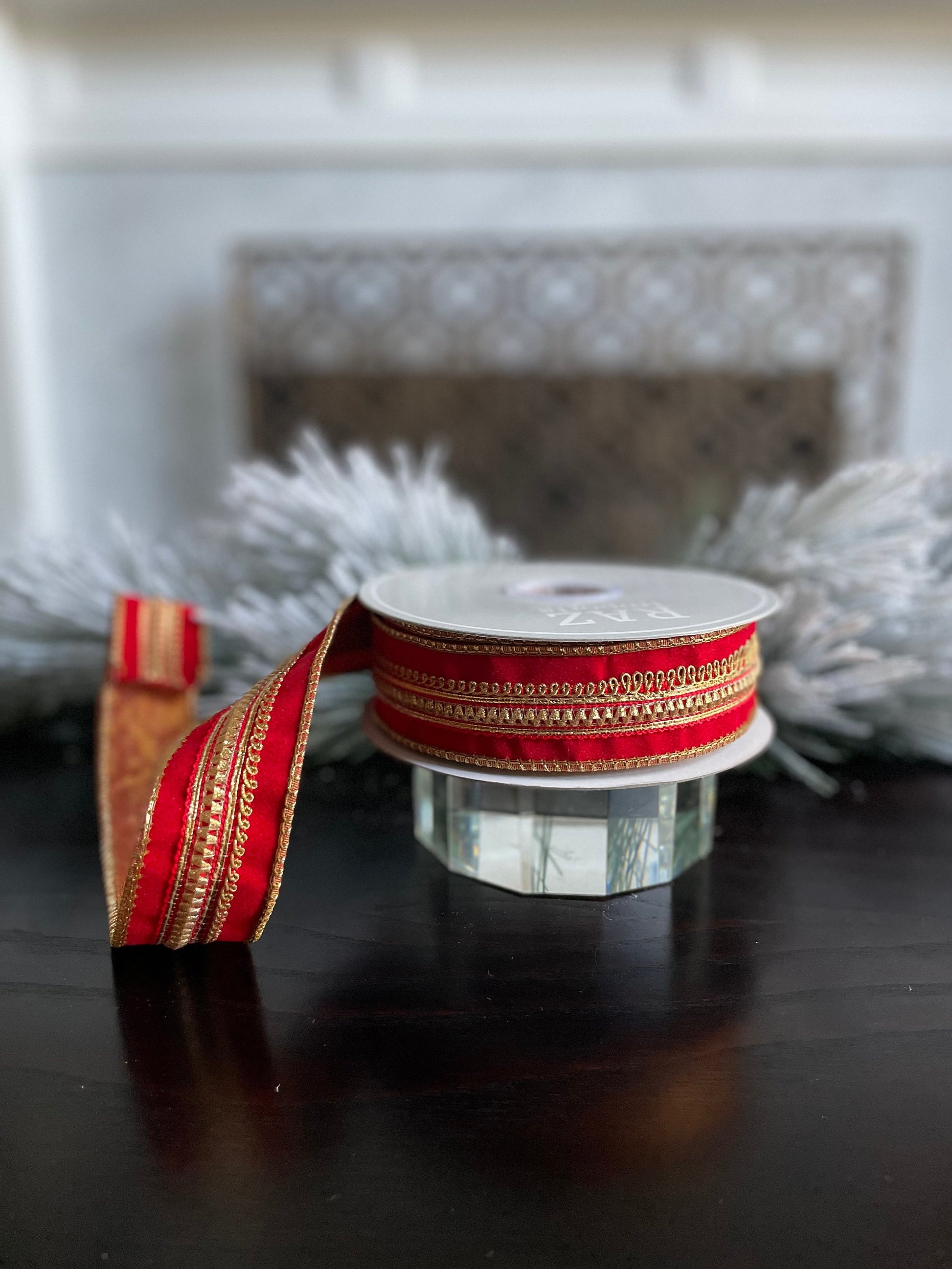1.5” x 10 yds. Designer jeweled red velvet wired ribbon. Raz.