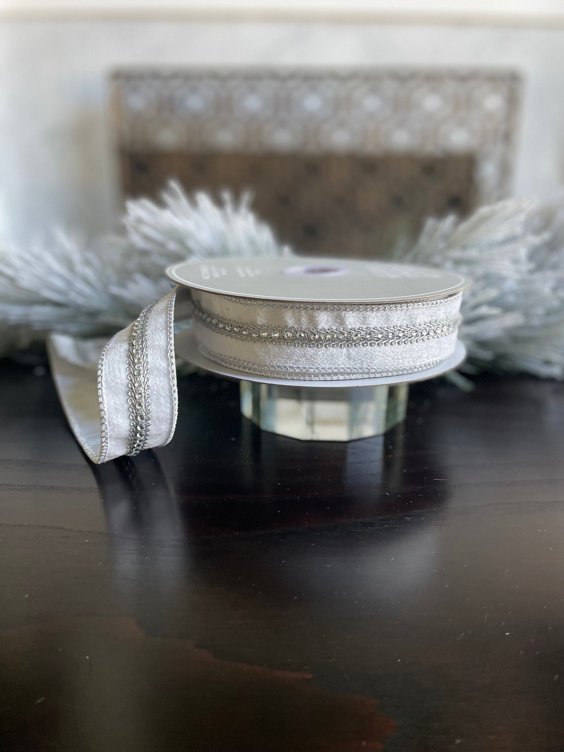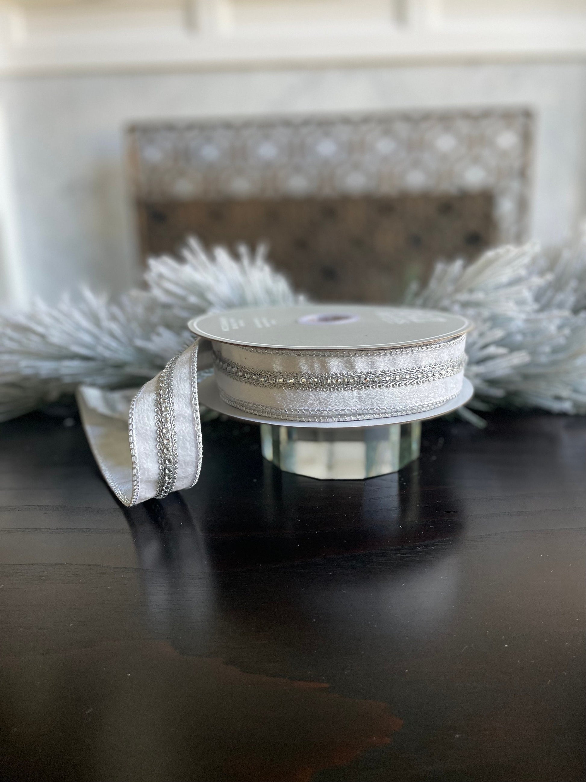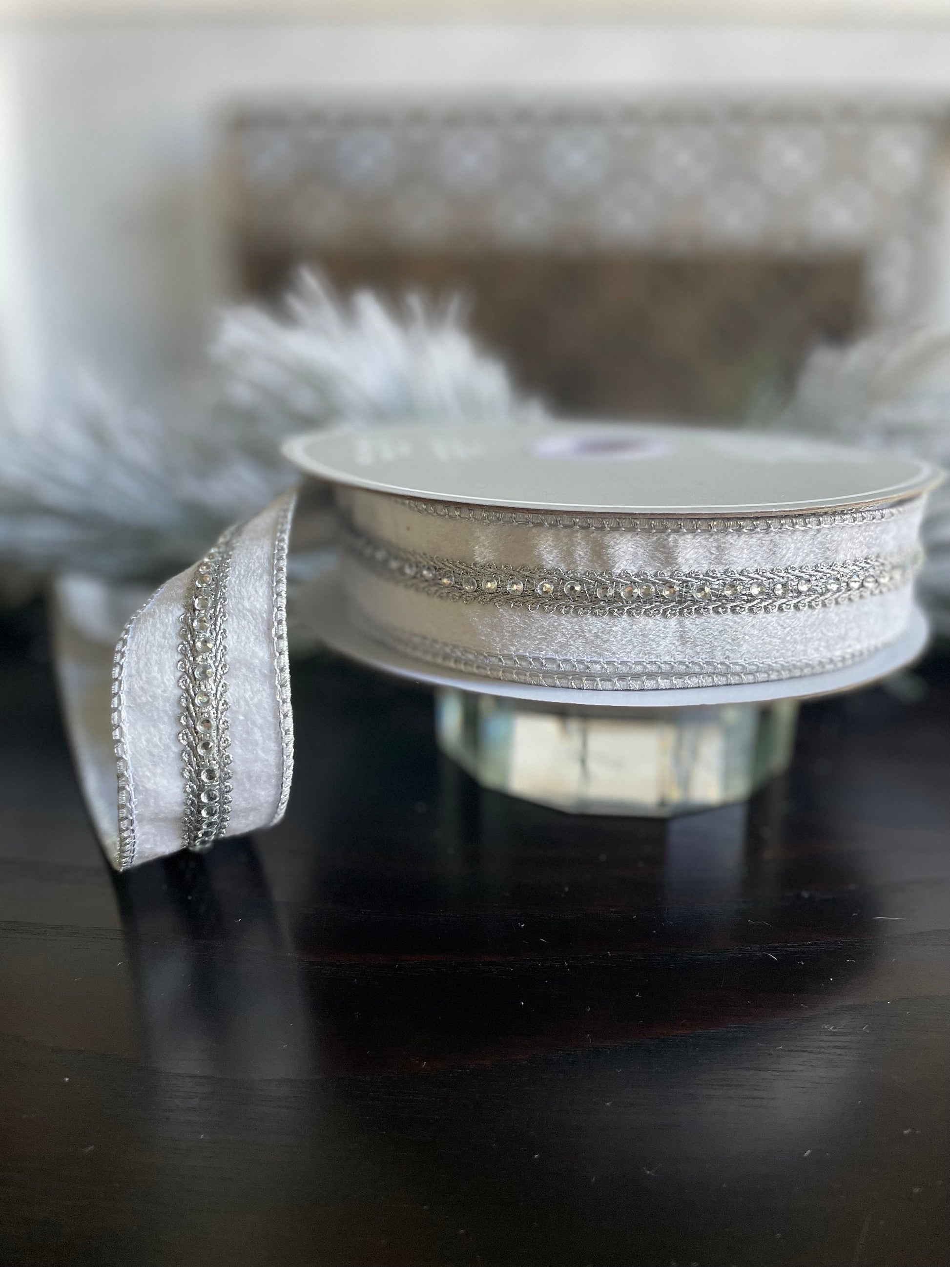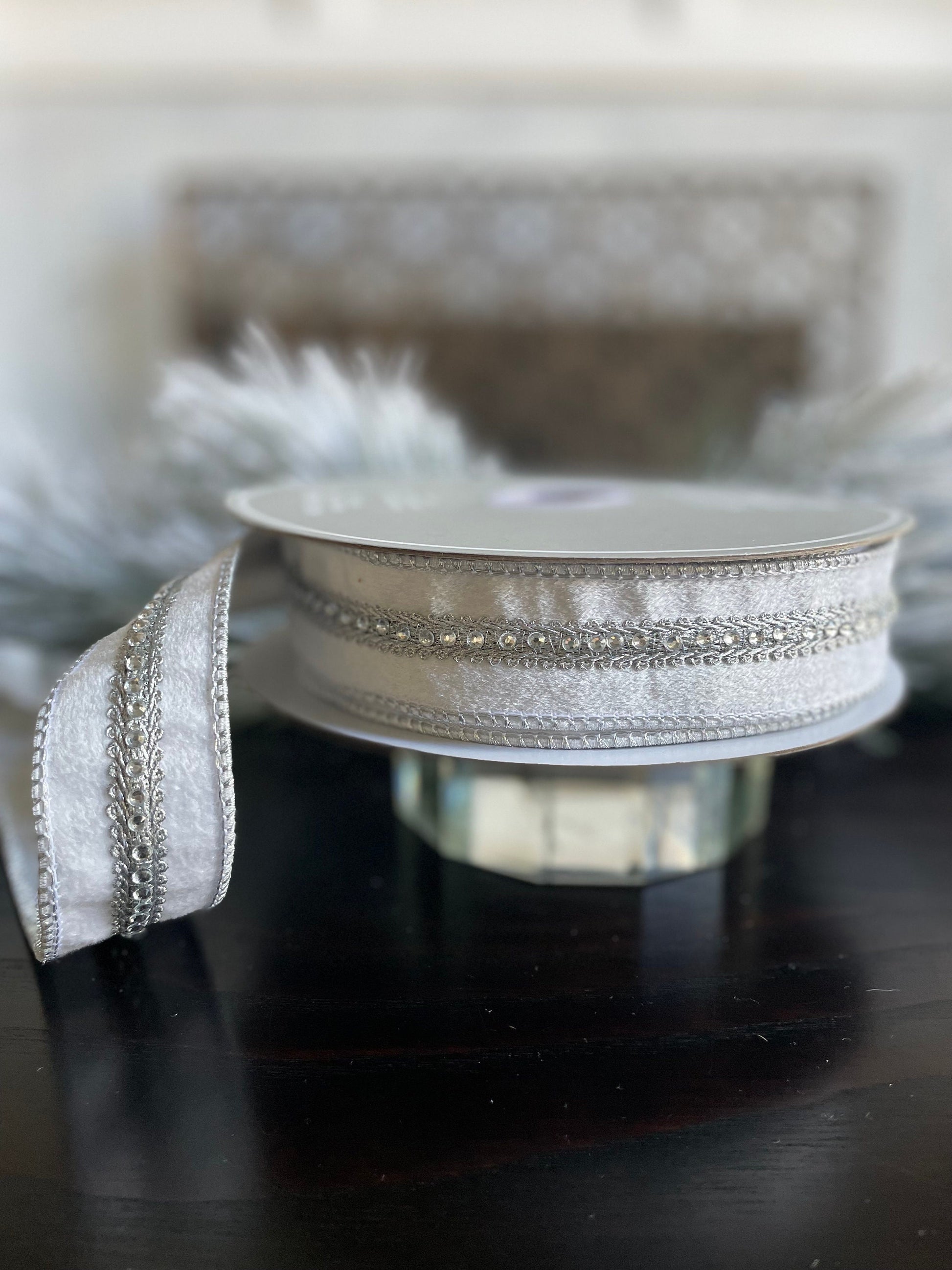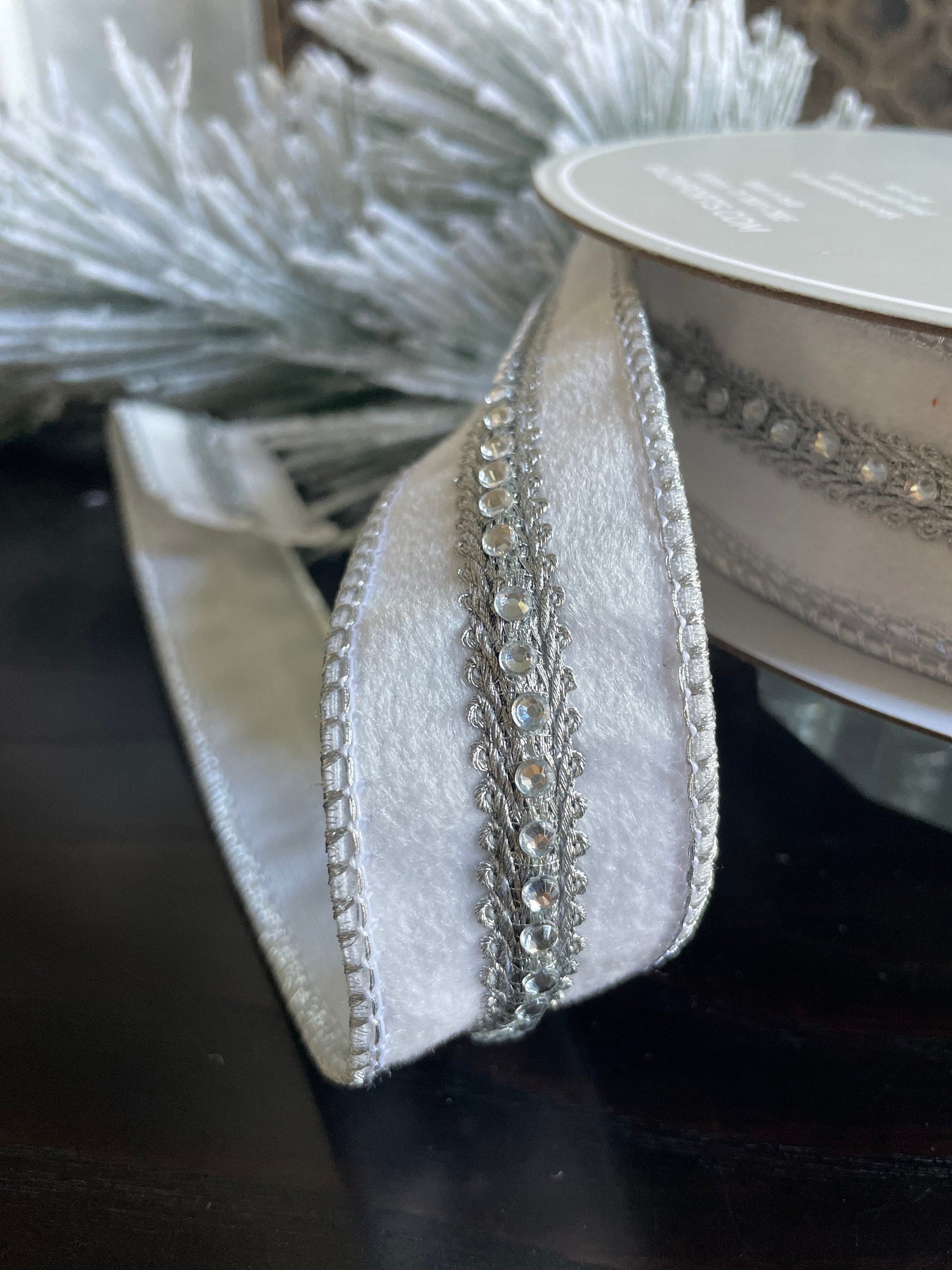 1.5” x 10 yds. Designer jeweled white velvet wired ribbon. Raz.
