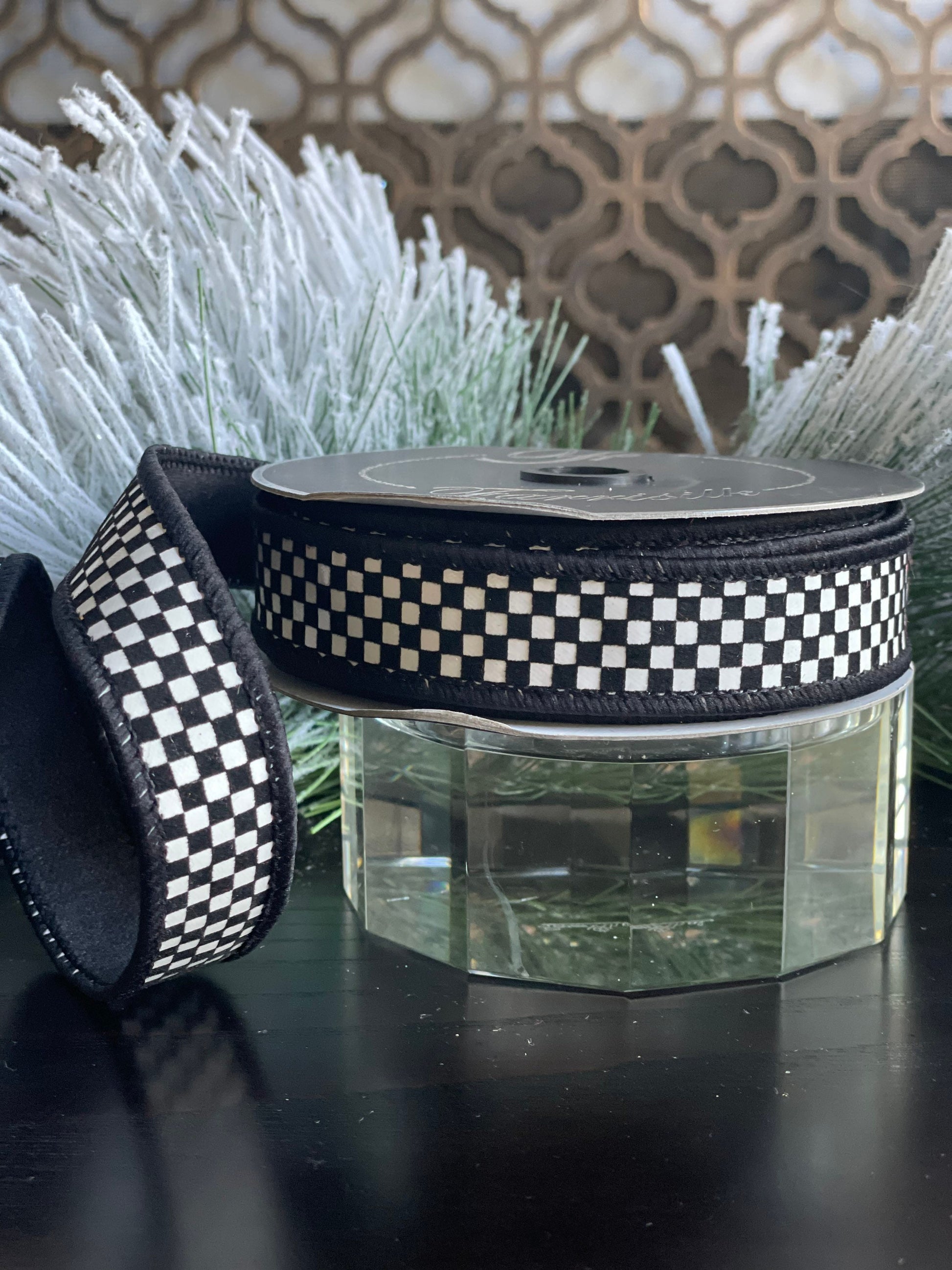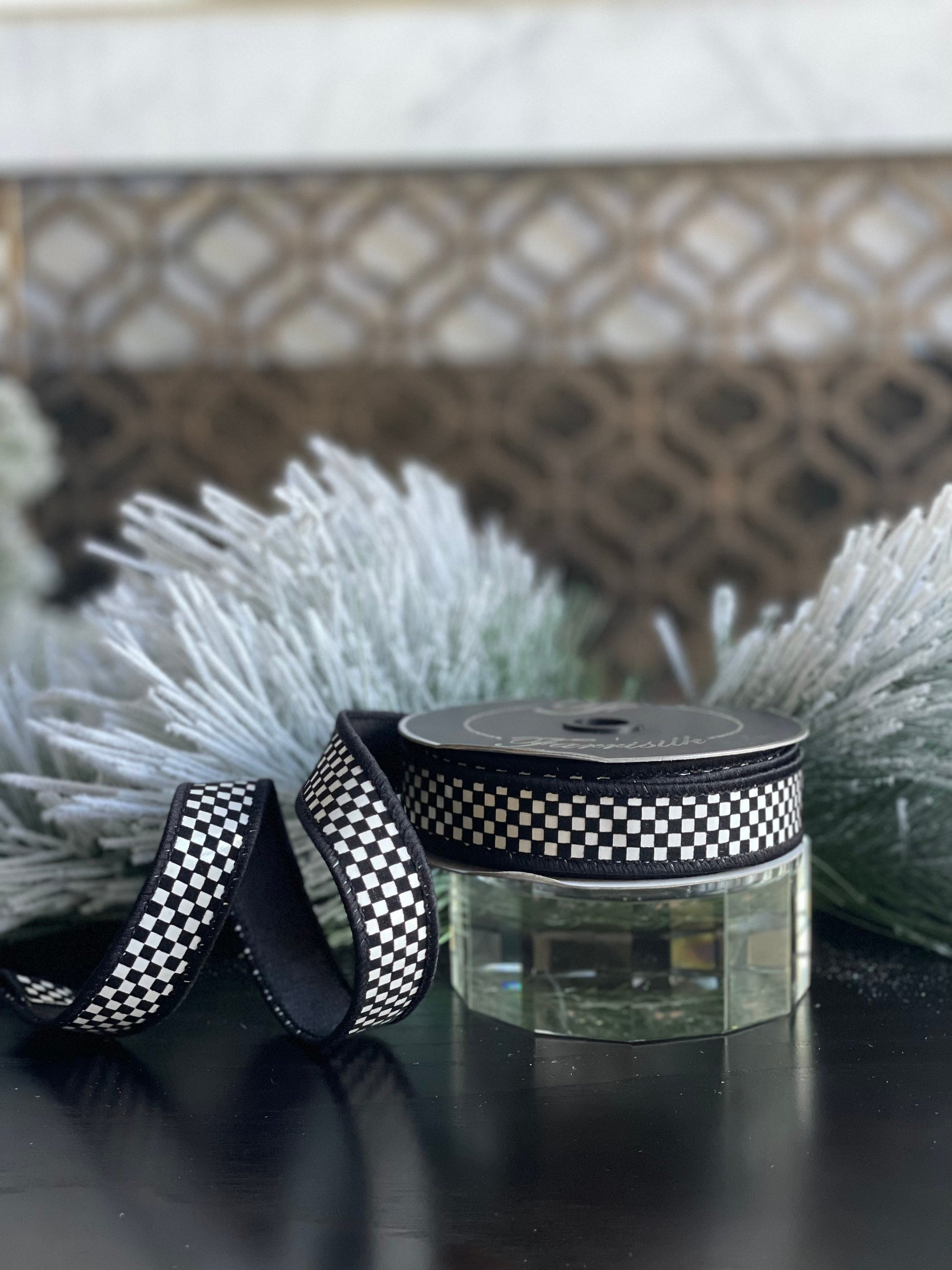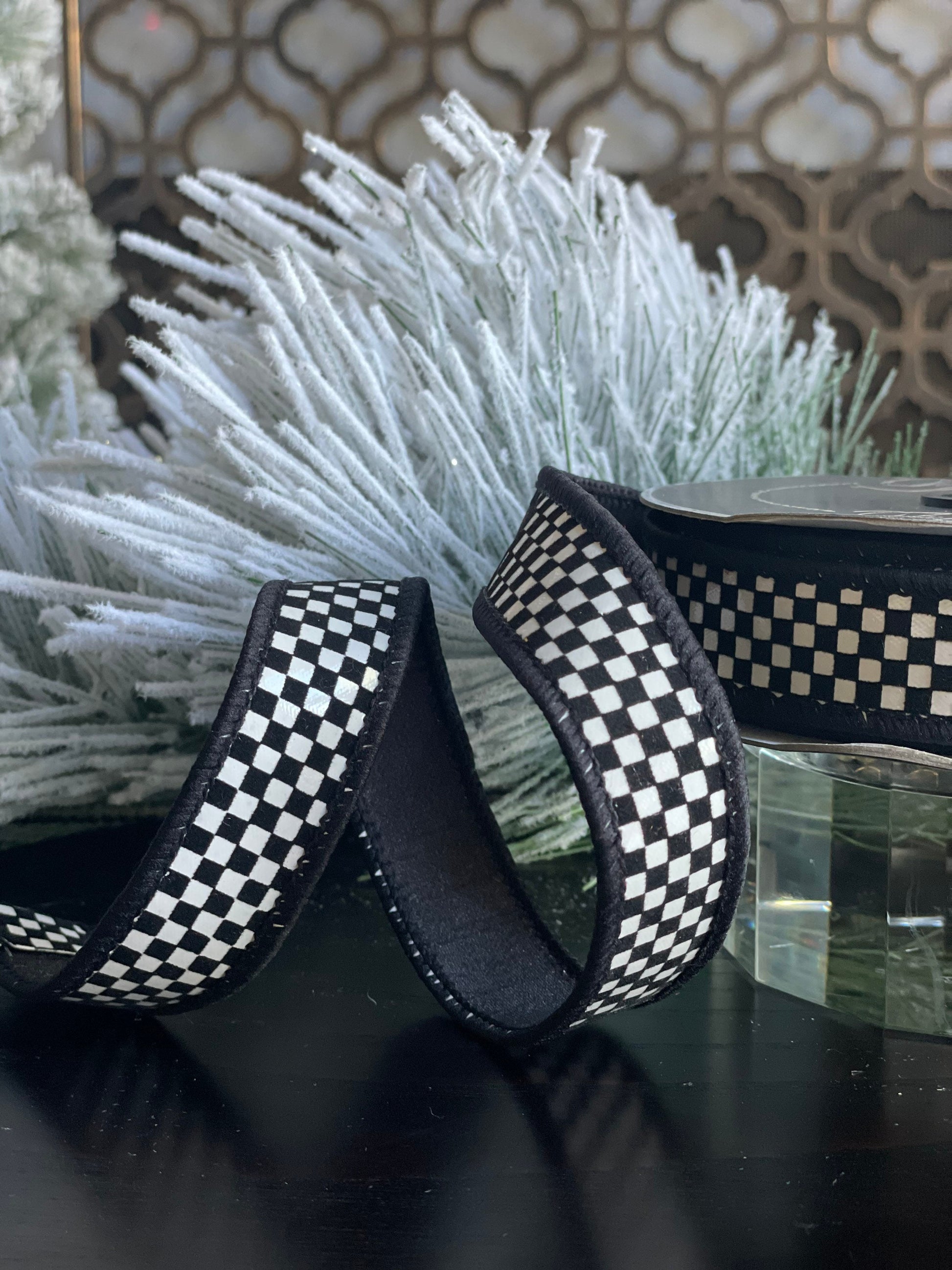 1” X 10 yds. Ribbon Mini checks black and white. Wired. Farrisilk.