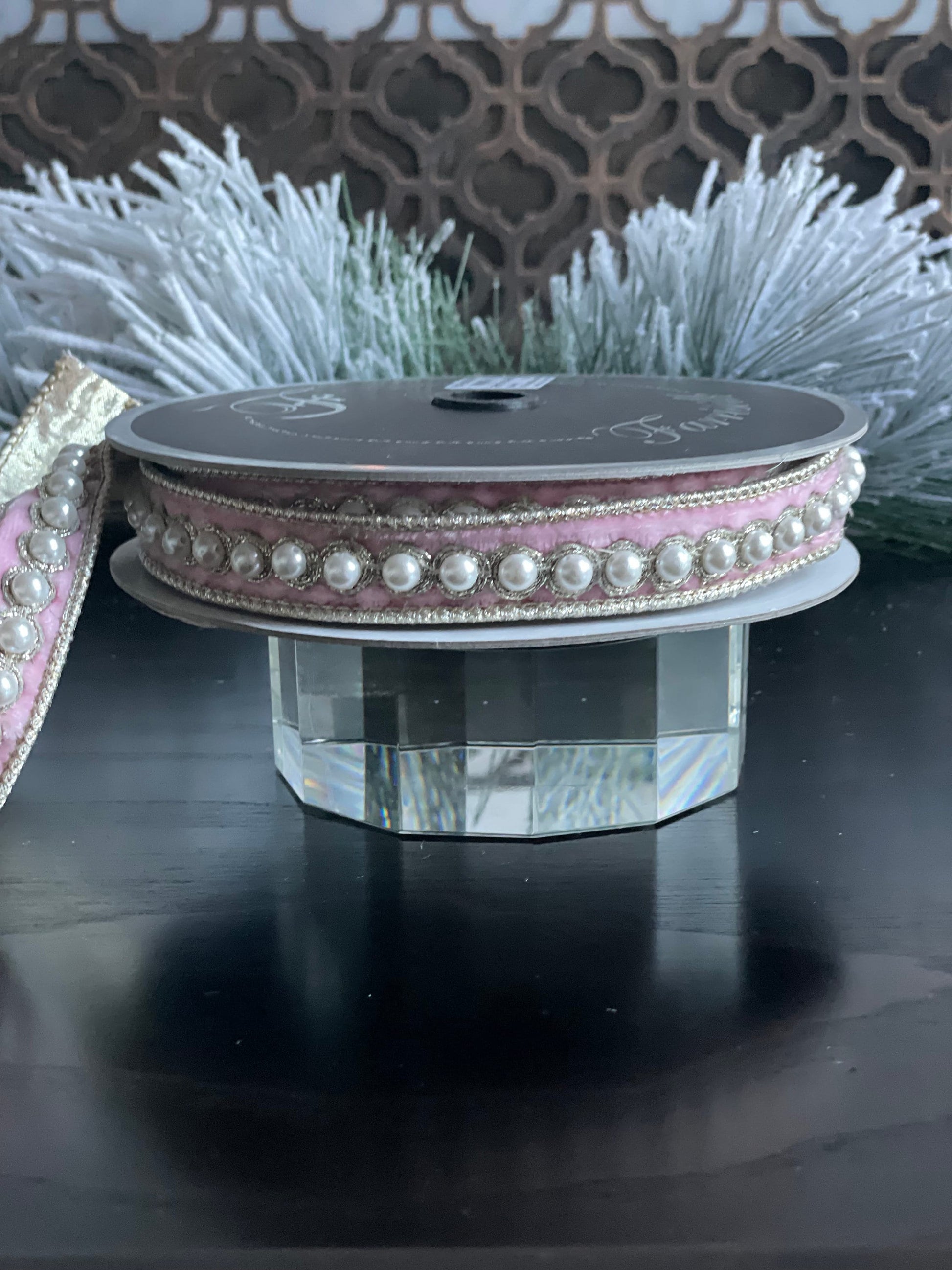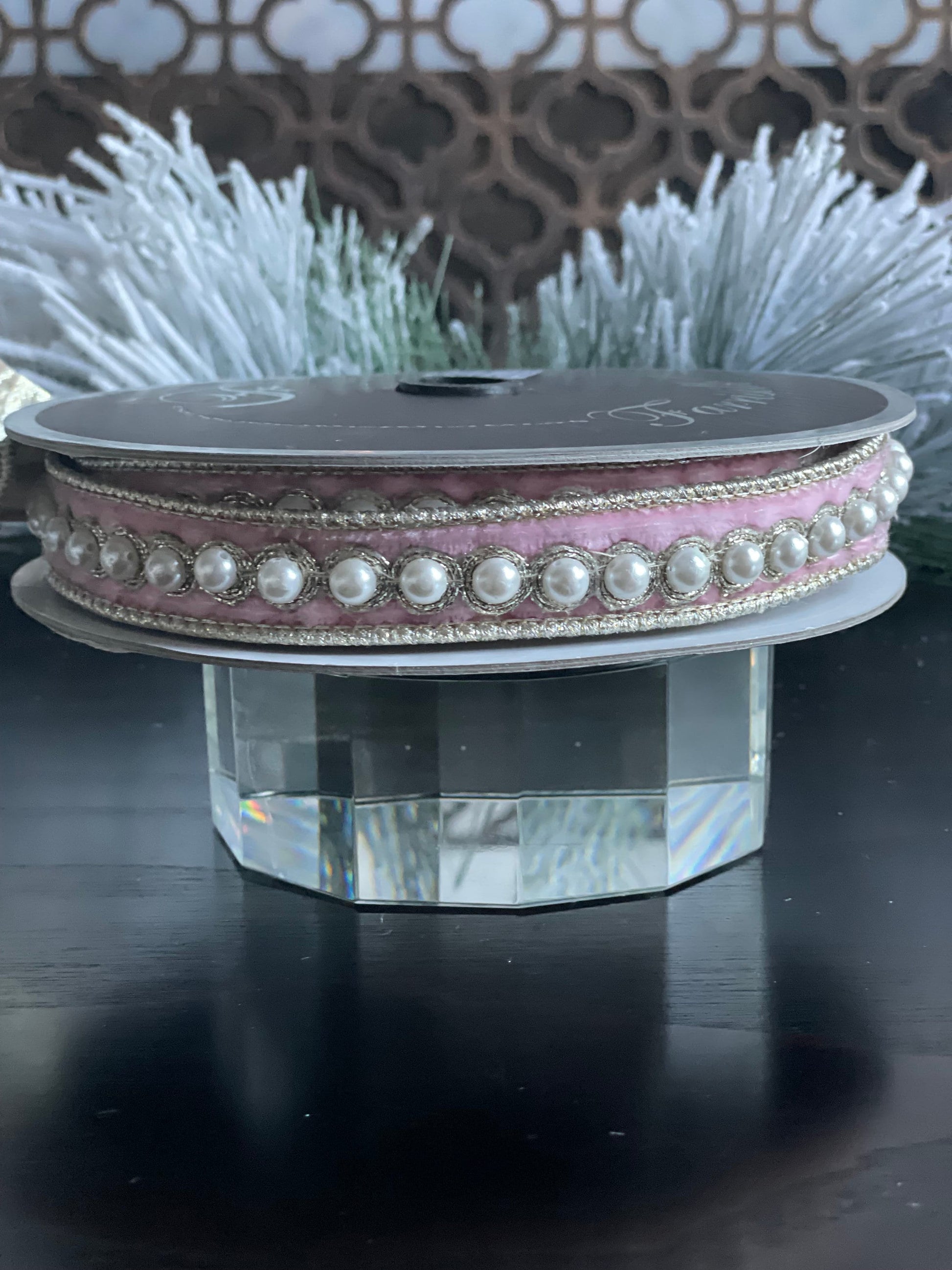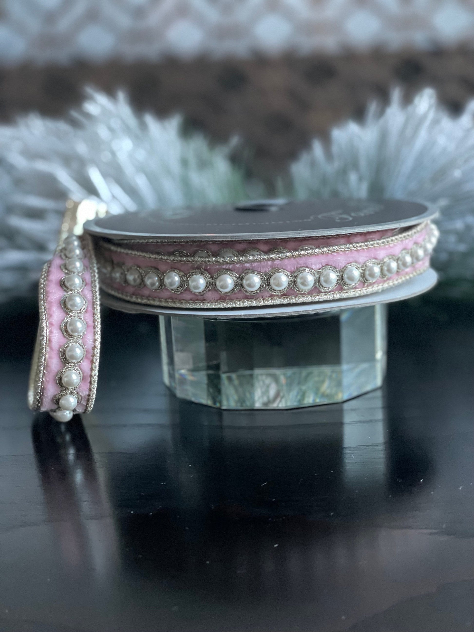 1” x 5 yds. Designer pearl borders baby pink velvet ribbon. Wired. Farrisilk.