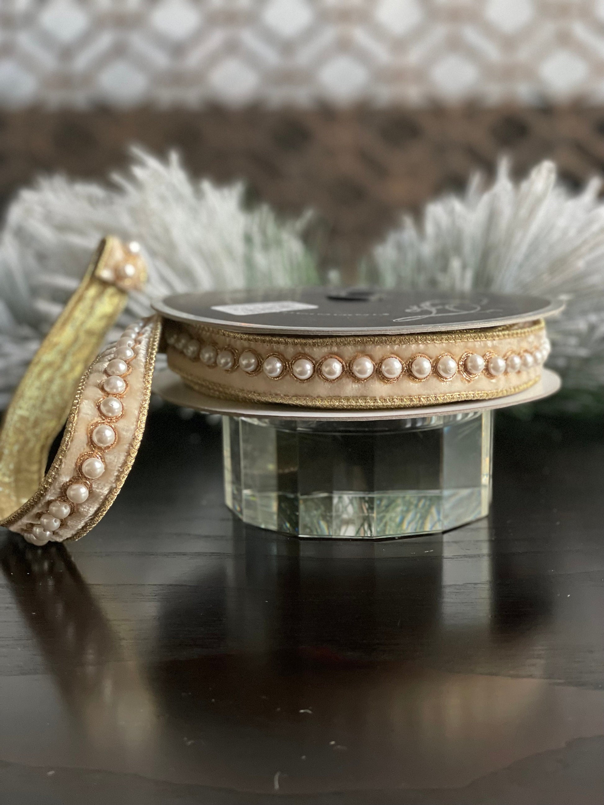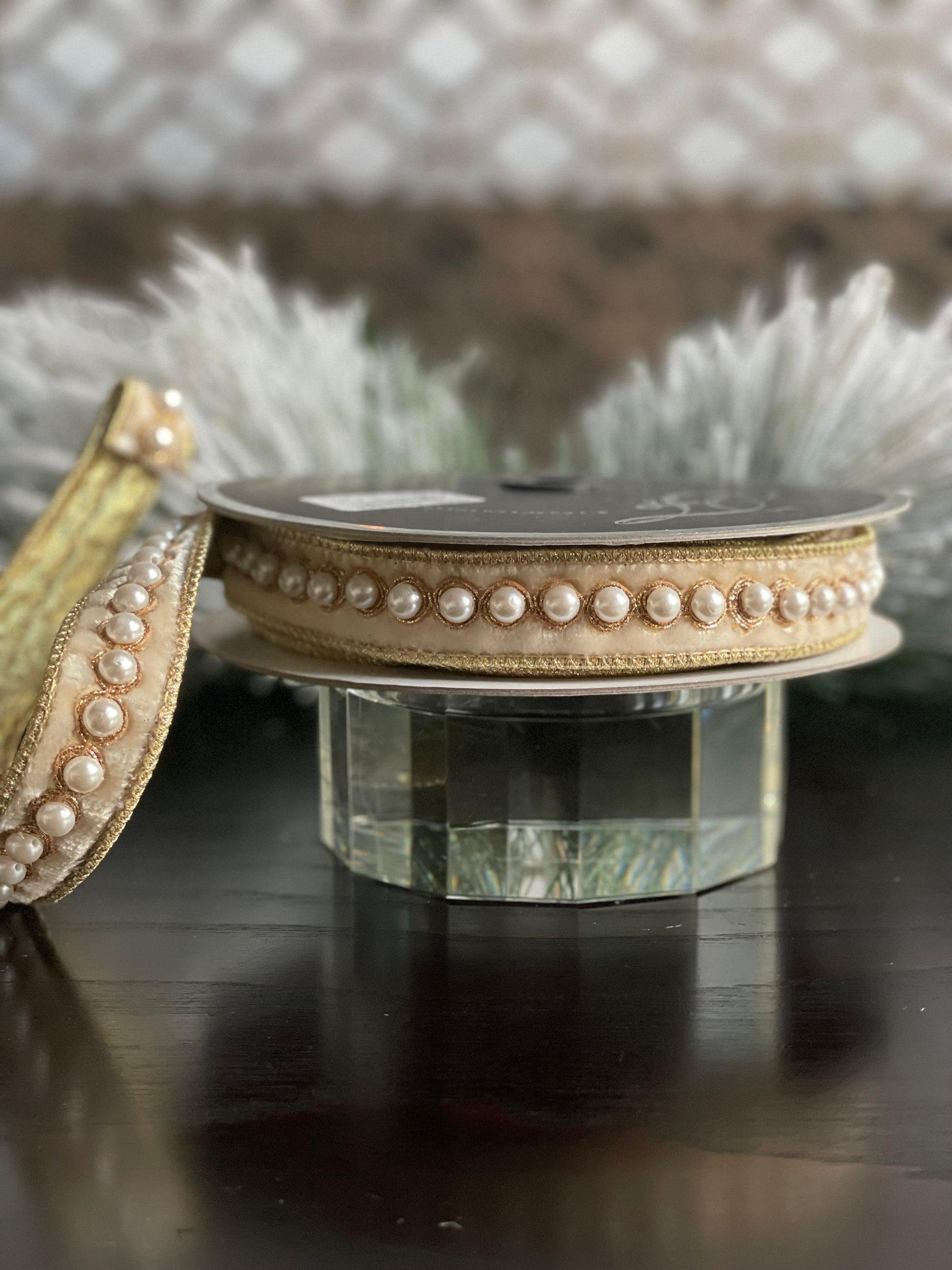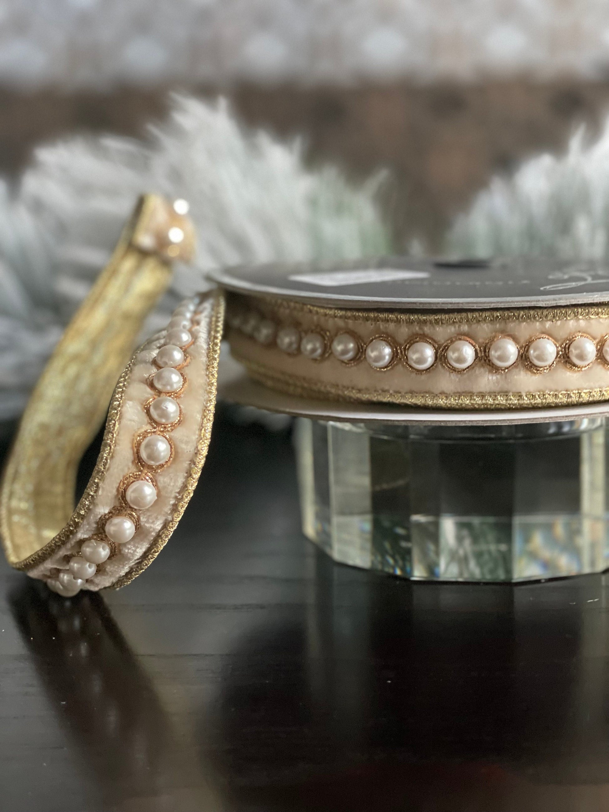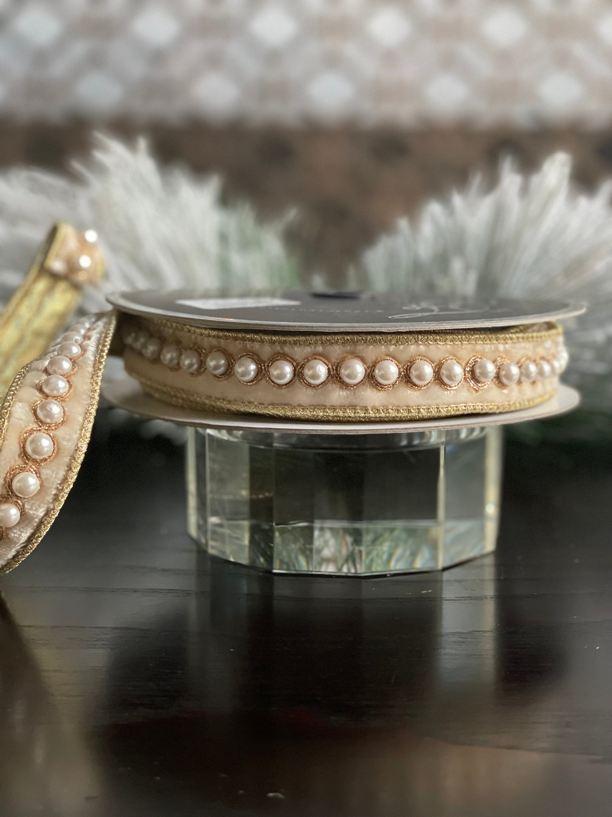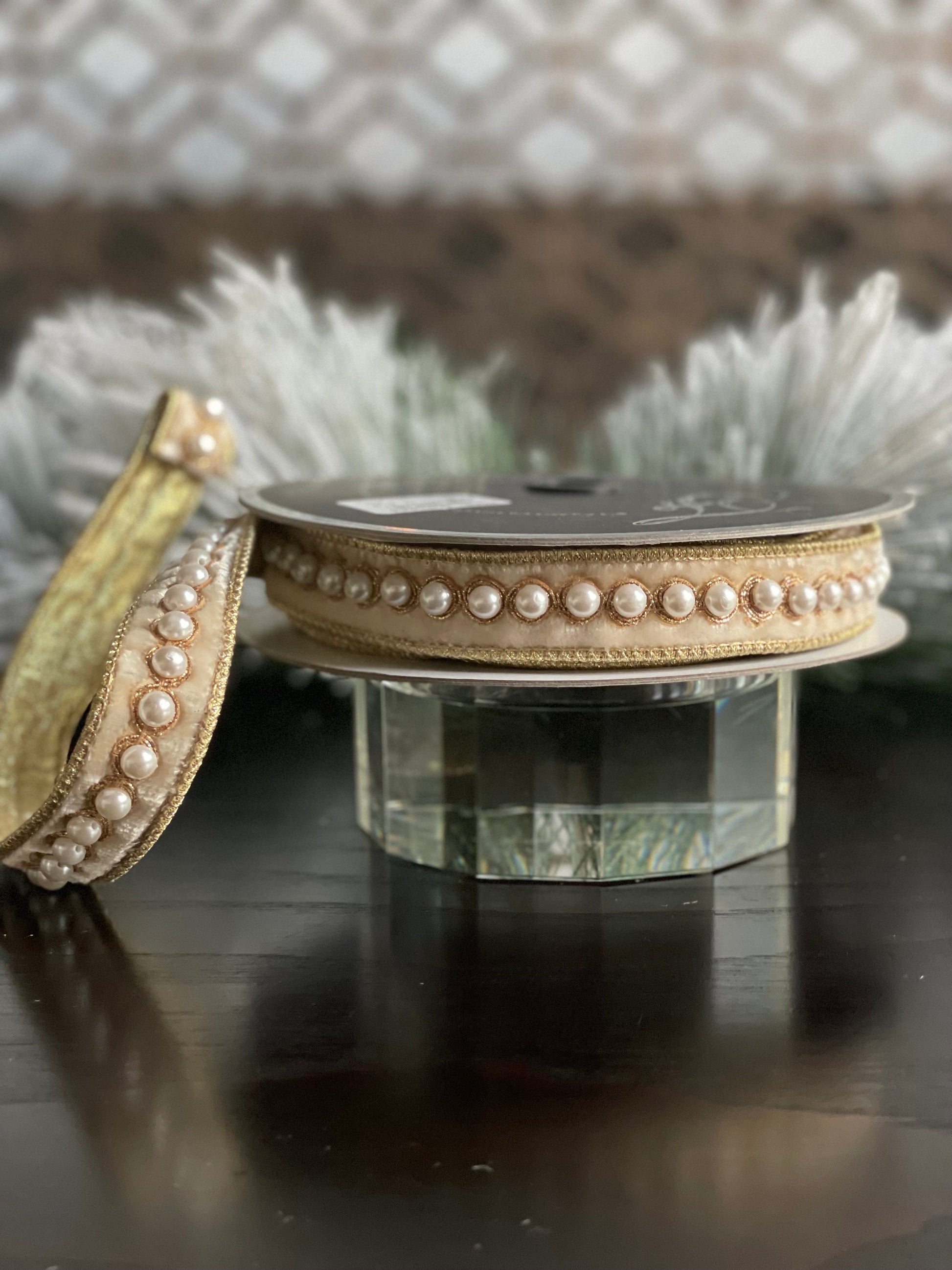 1” x 5 yds. Designer pearl borders cream velvet ribbon. Wired. Farrisilk.