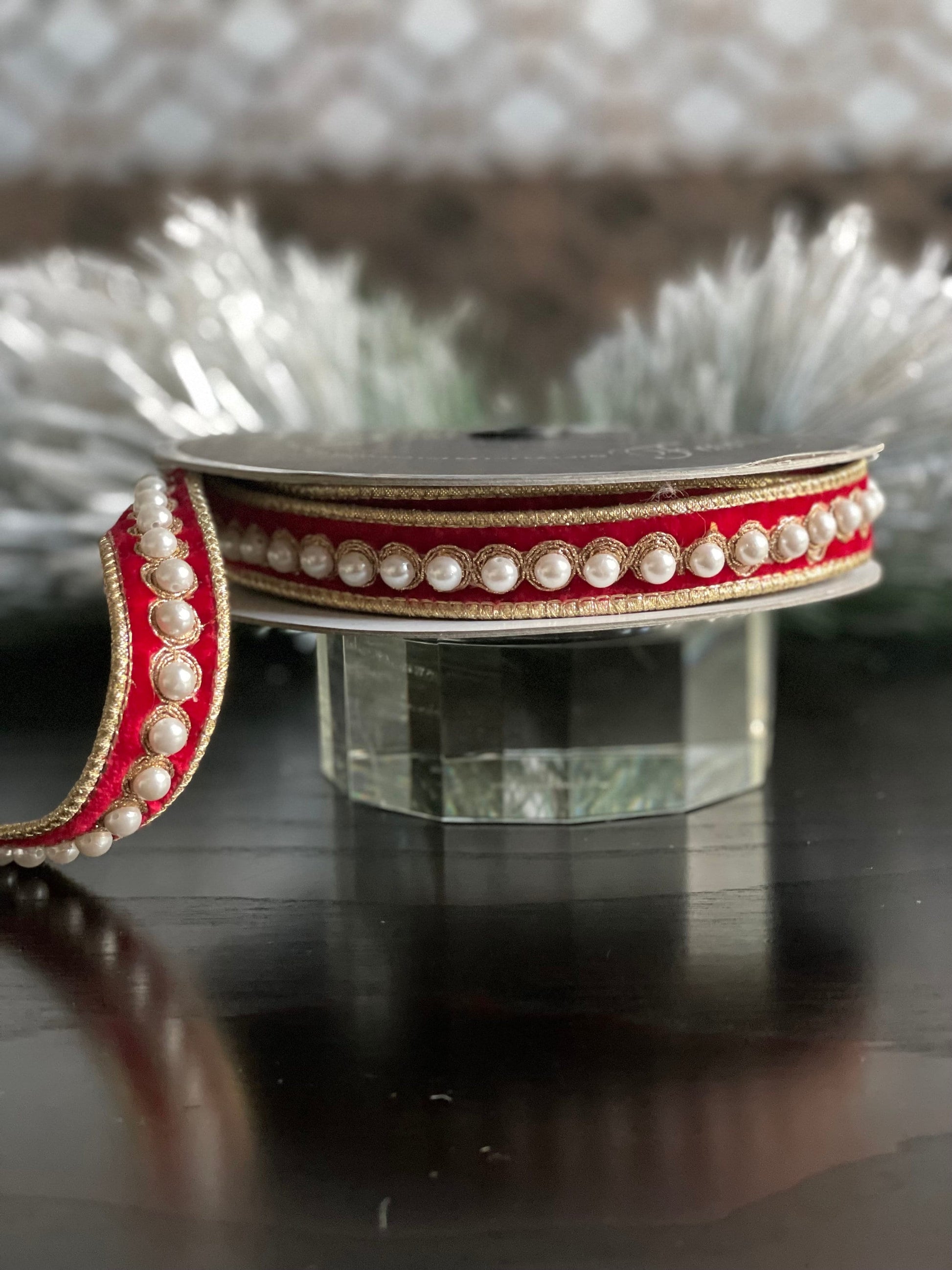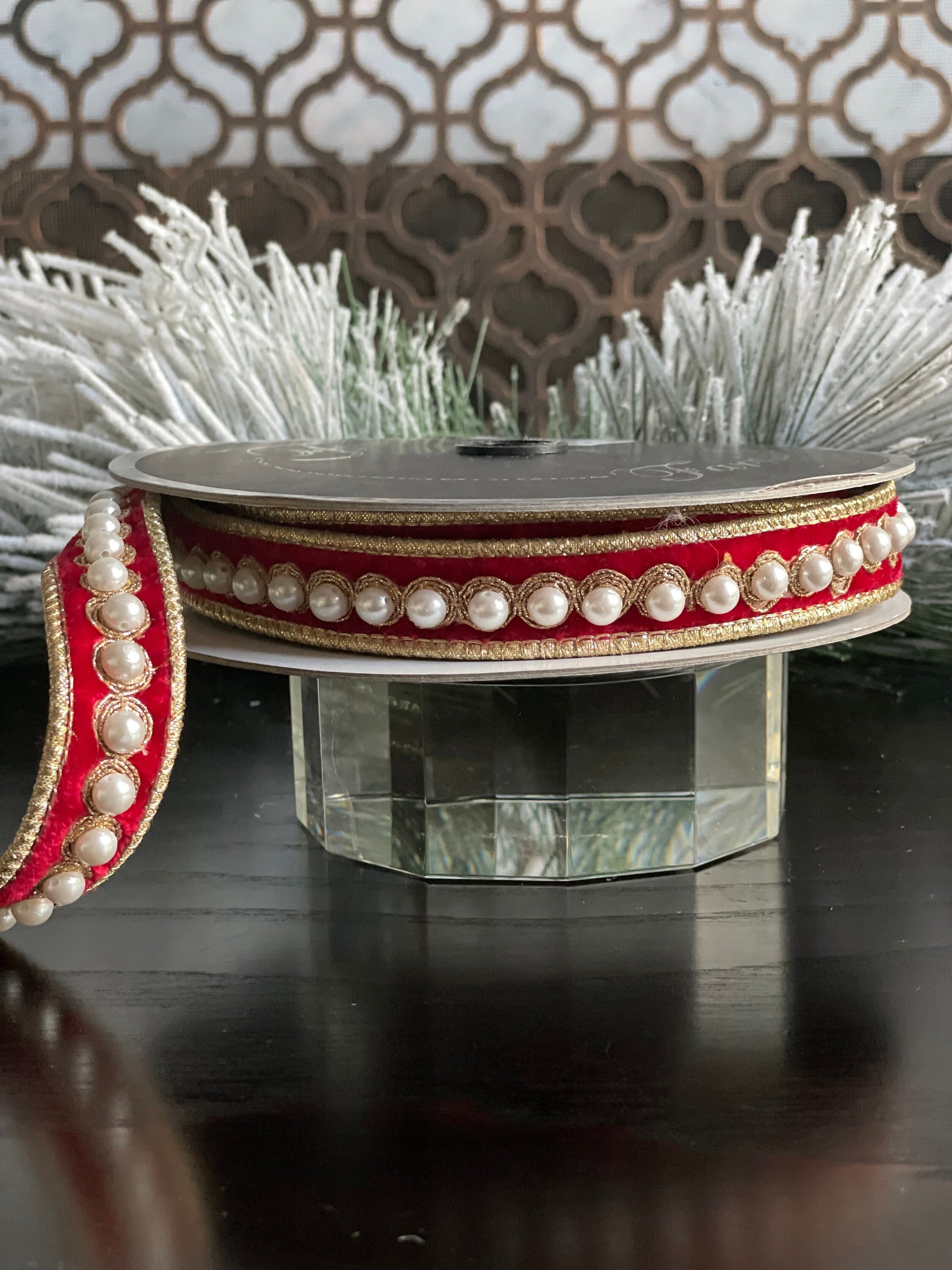 1” x 5 yds. Designer pearl borders red velvet wired ribbon.