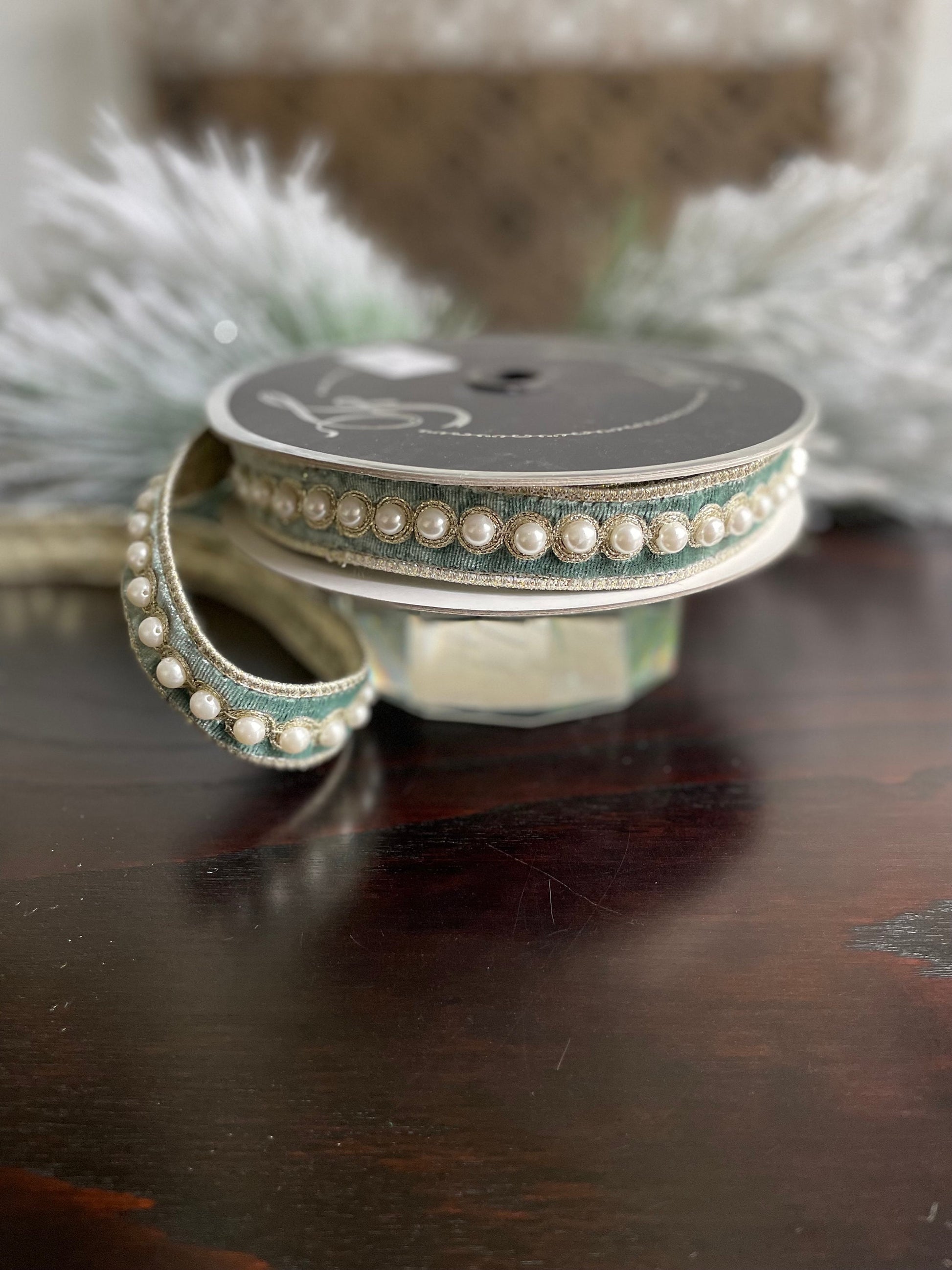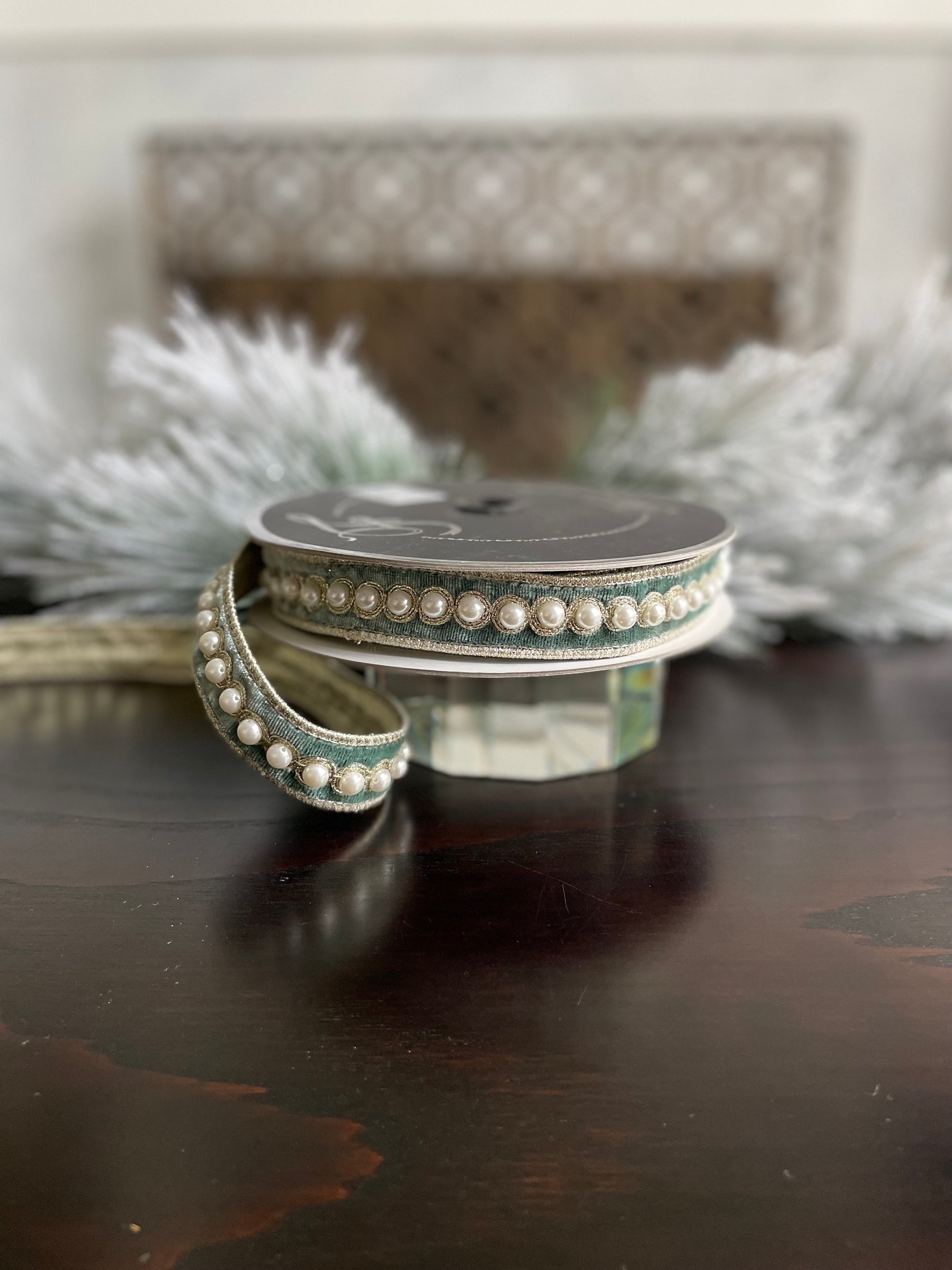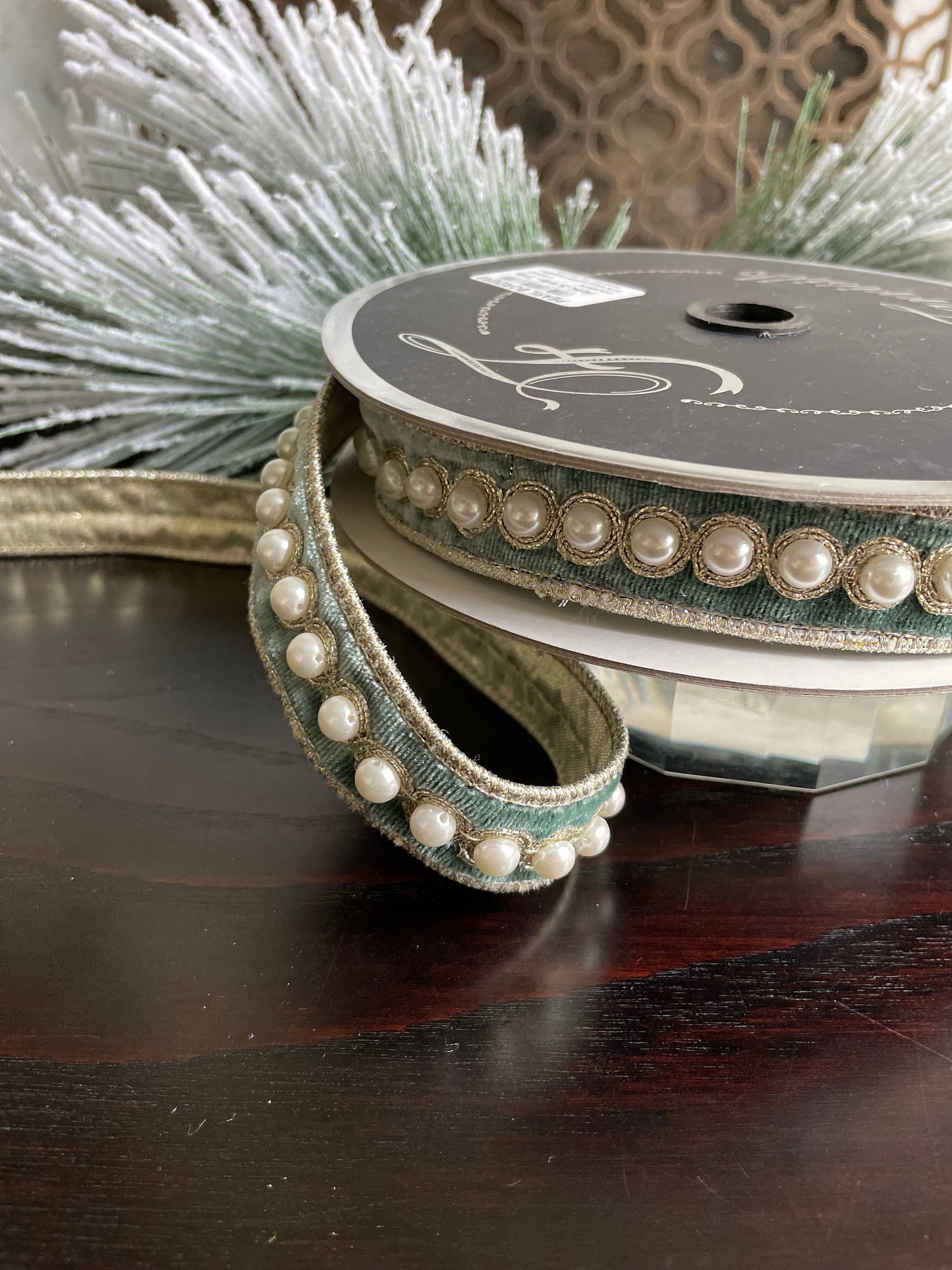 1” x 5 yds. Designer pearl borders velvet celadon ribbon. Wired. Farrisilk.