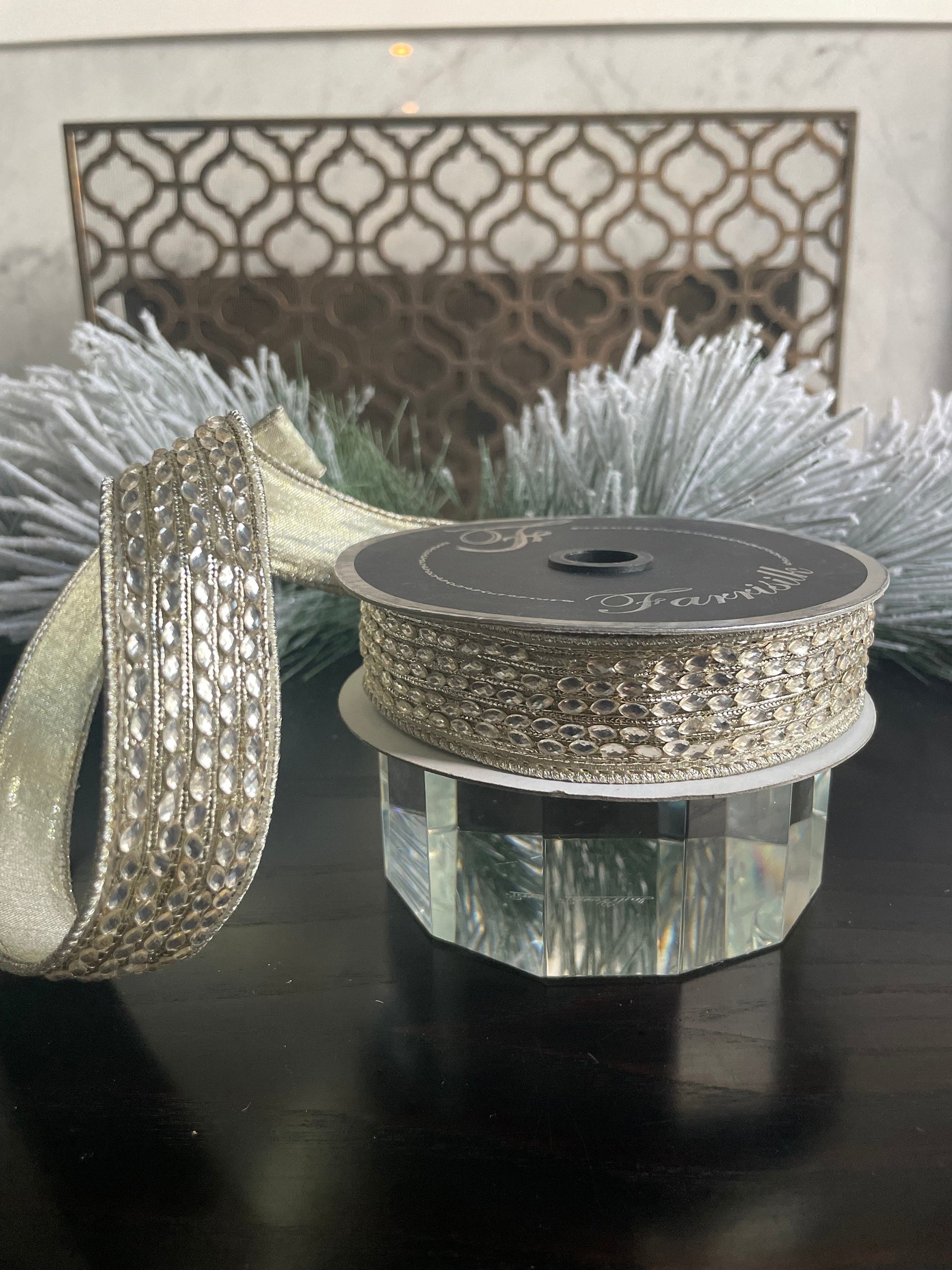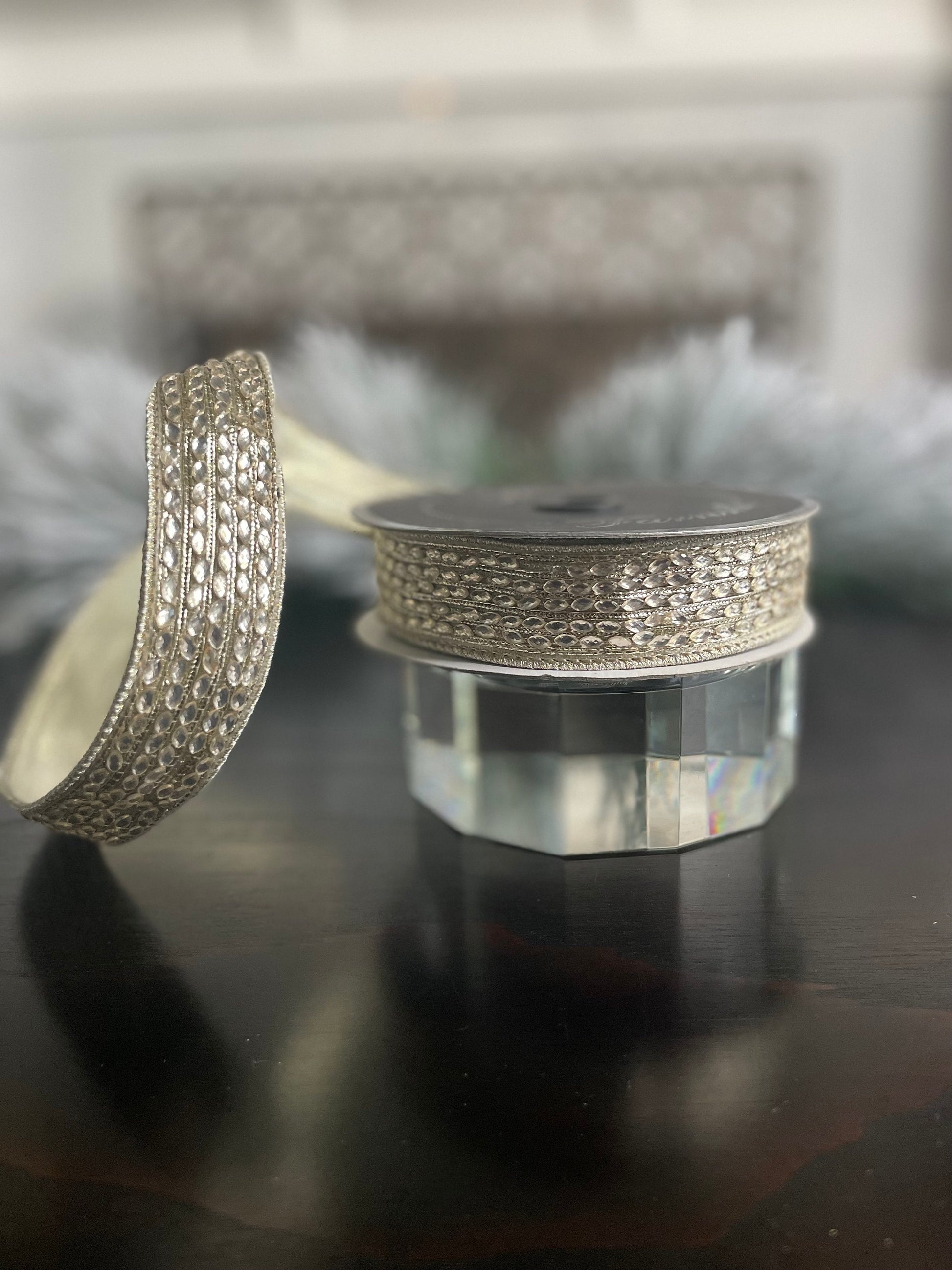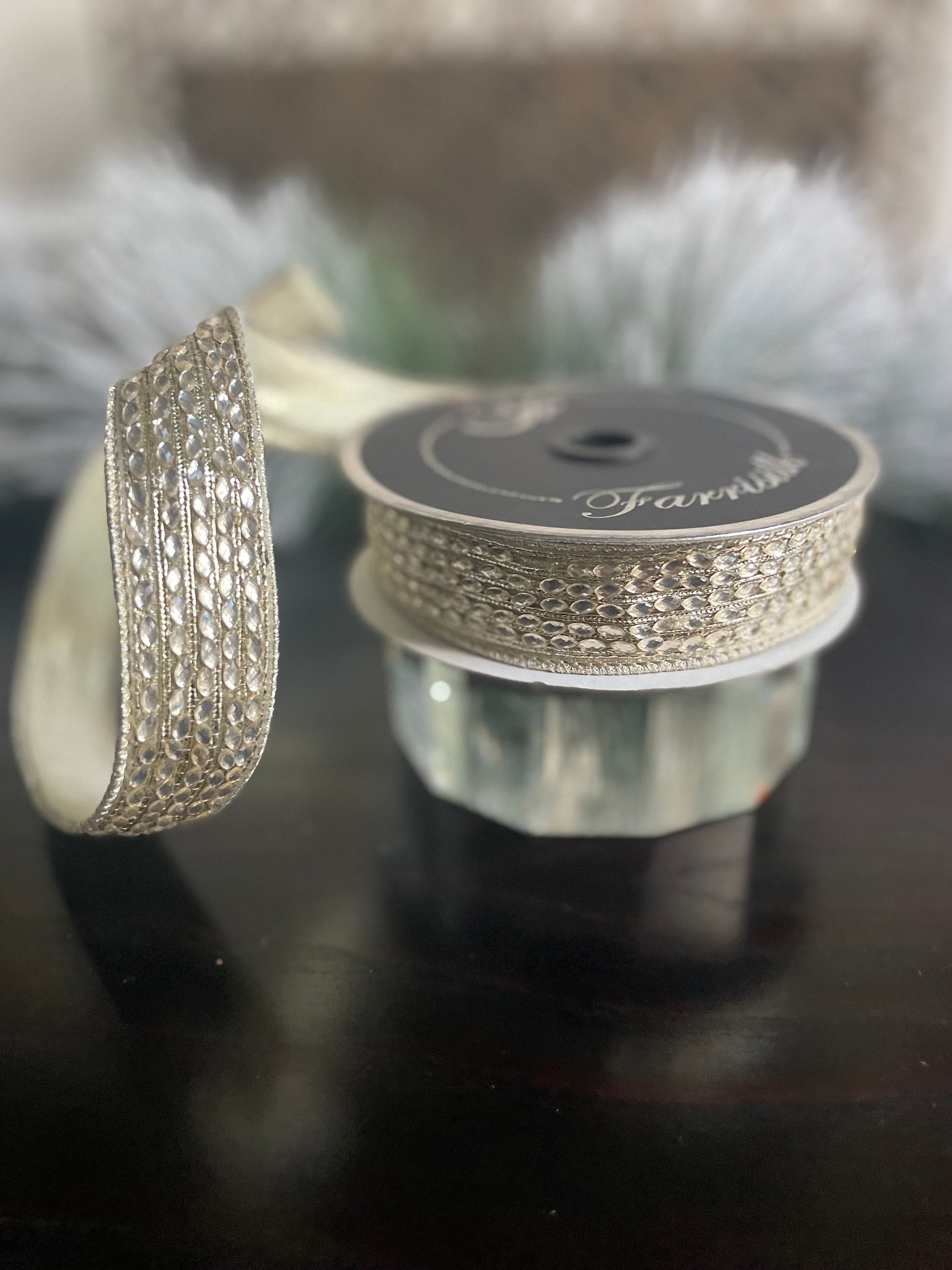 1” x 5 yds. Designer Queen Victoria wired ribbon. Platinum. Farrisilk.