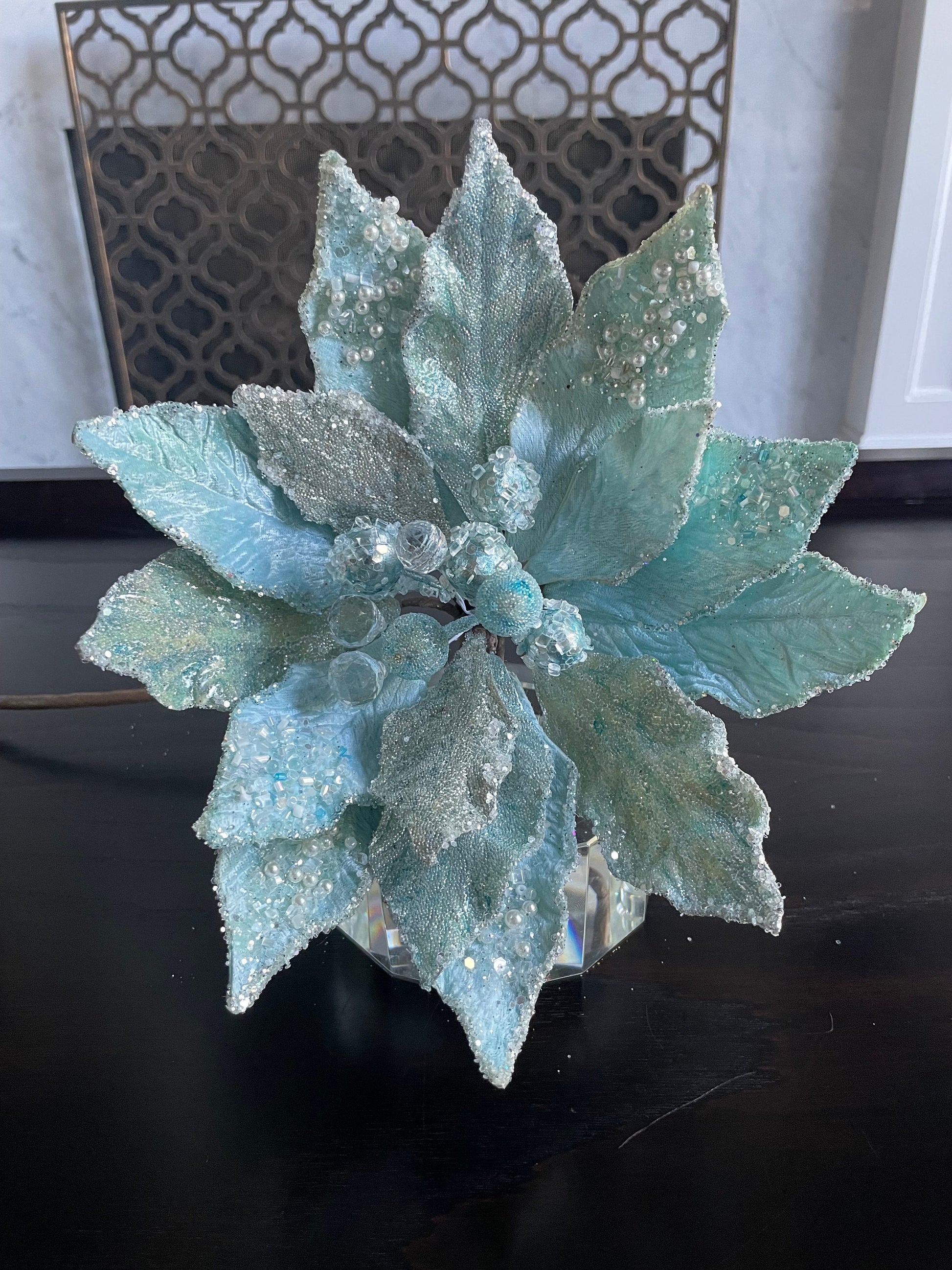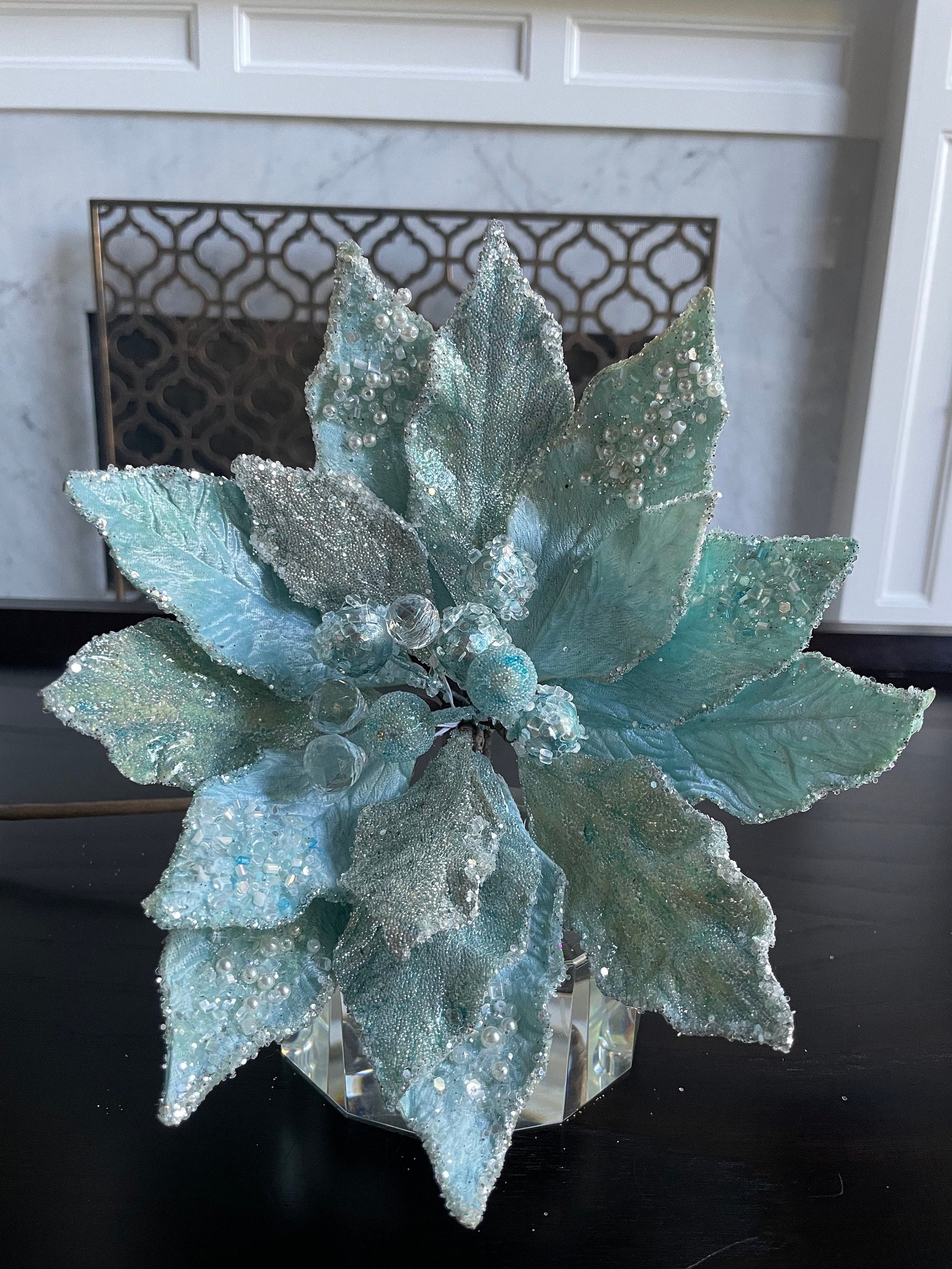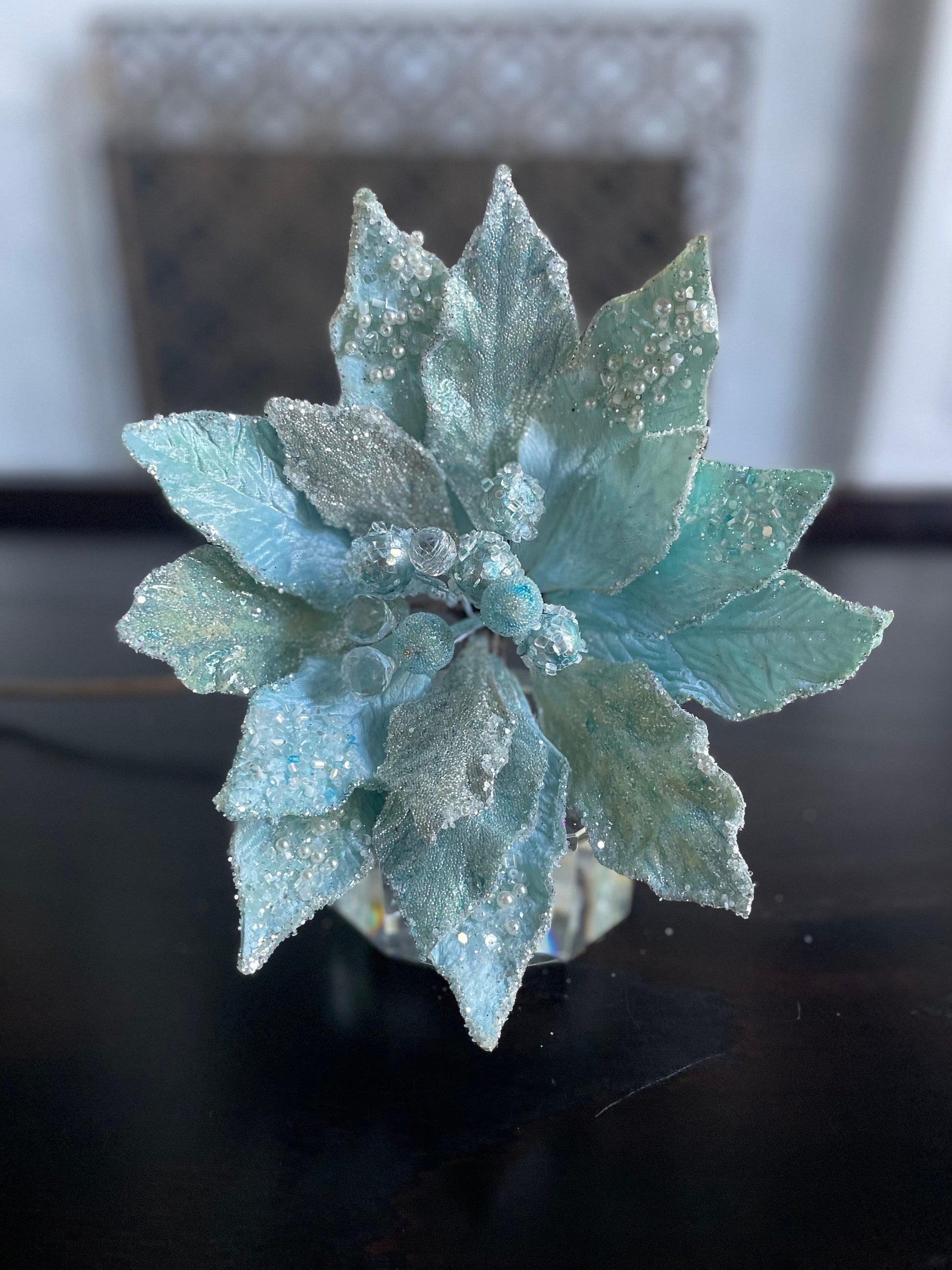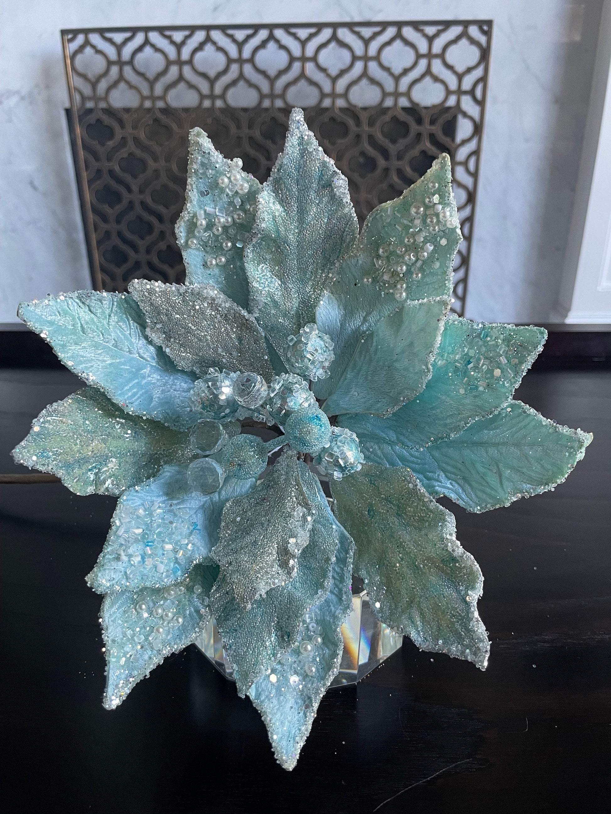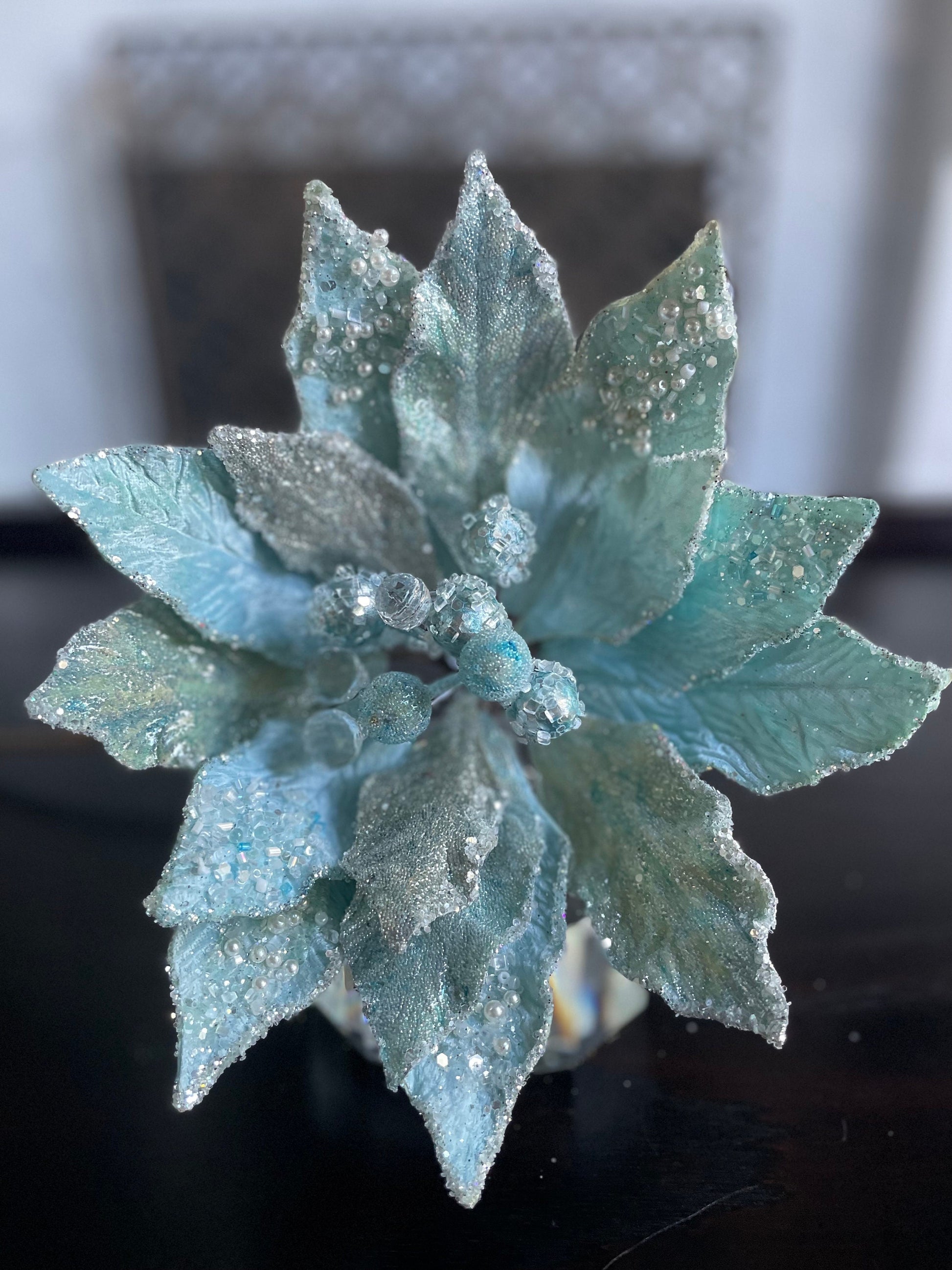 10.5” Poinsettia stem snow sky blue, pearls and beaded 10.5” tip to tip