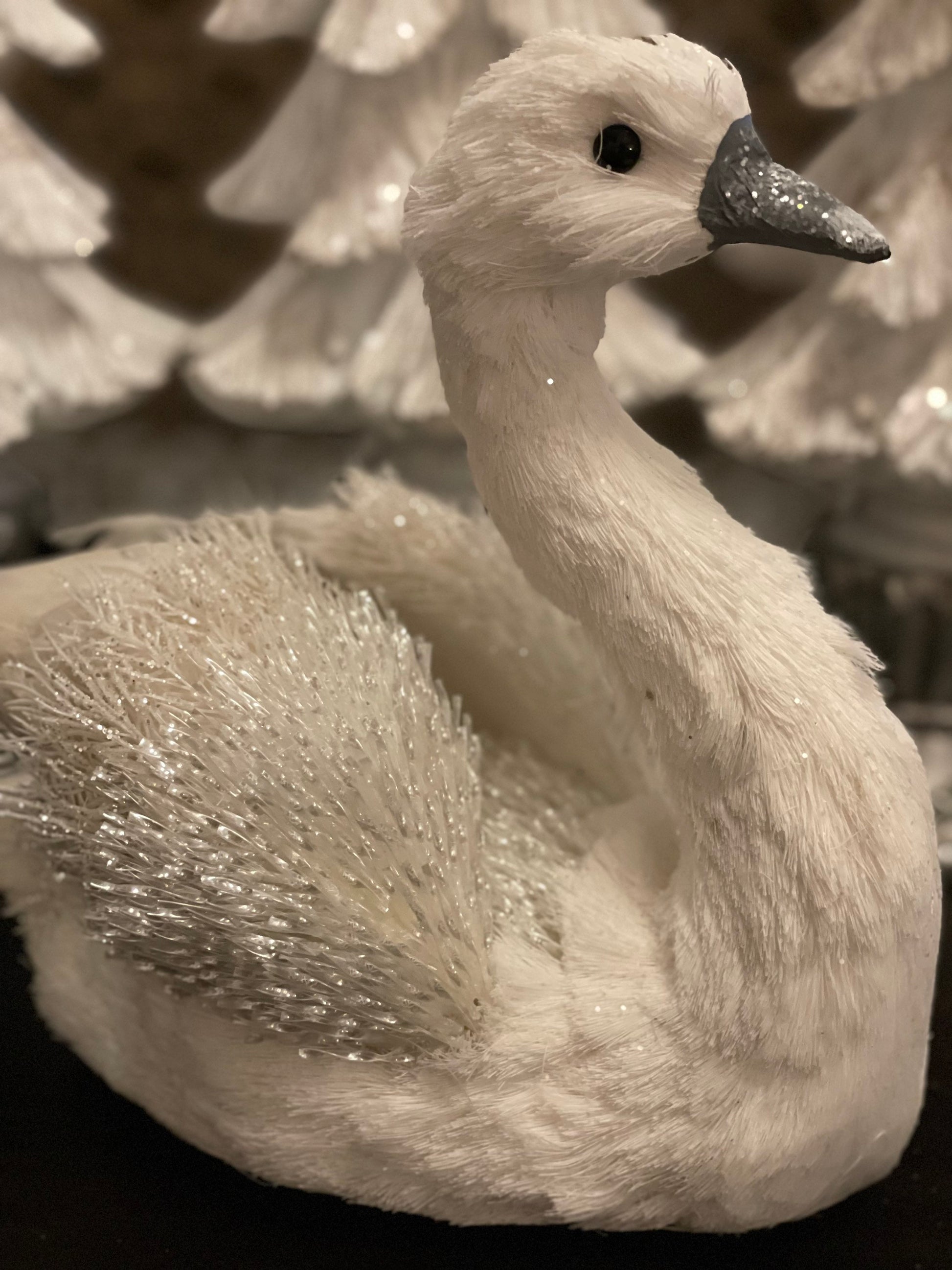 10”h x 12”w Snow fleece swan tabletop/ornament.