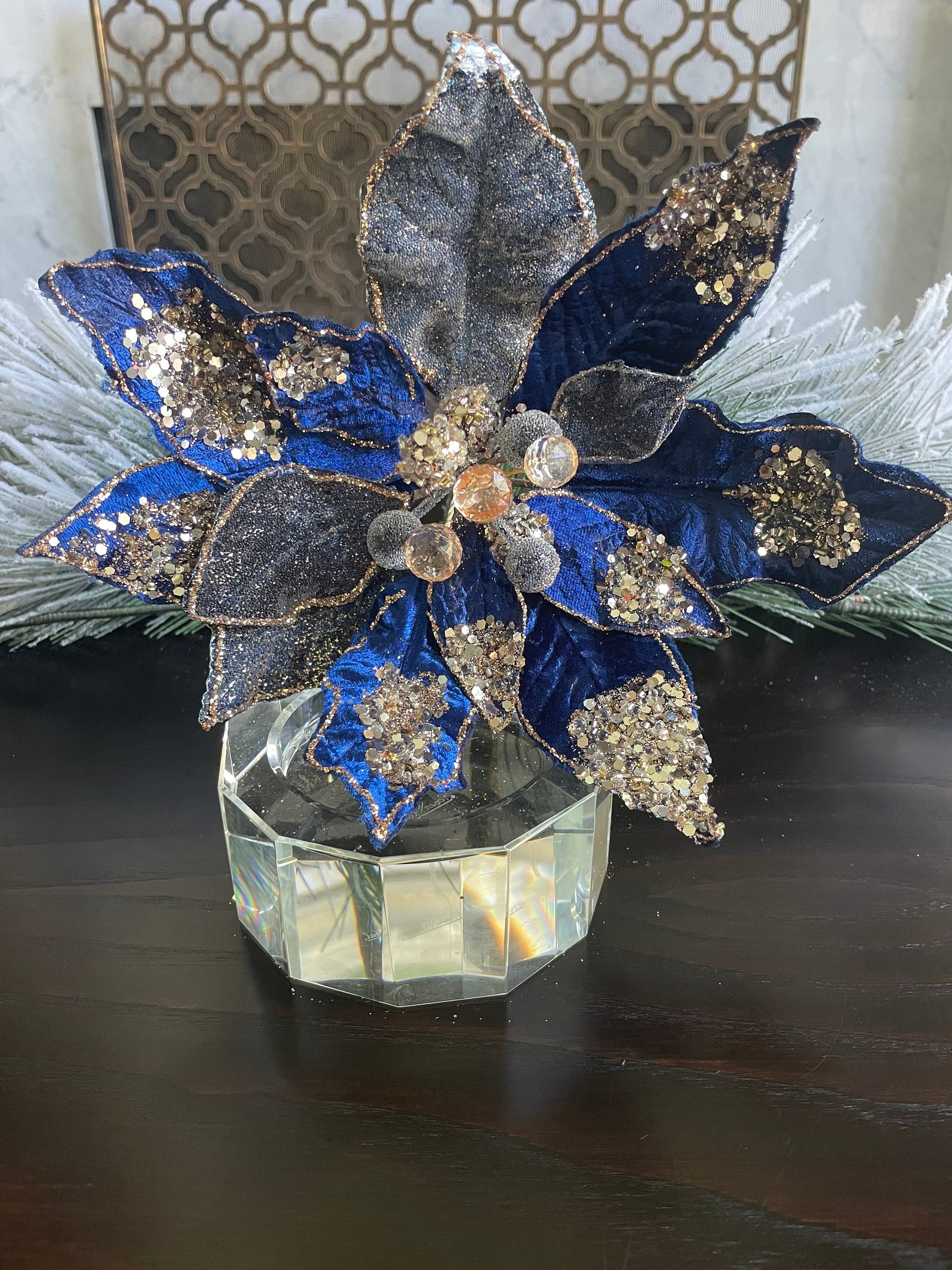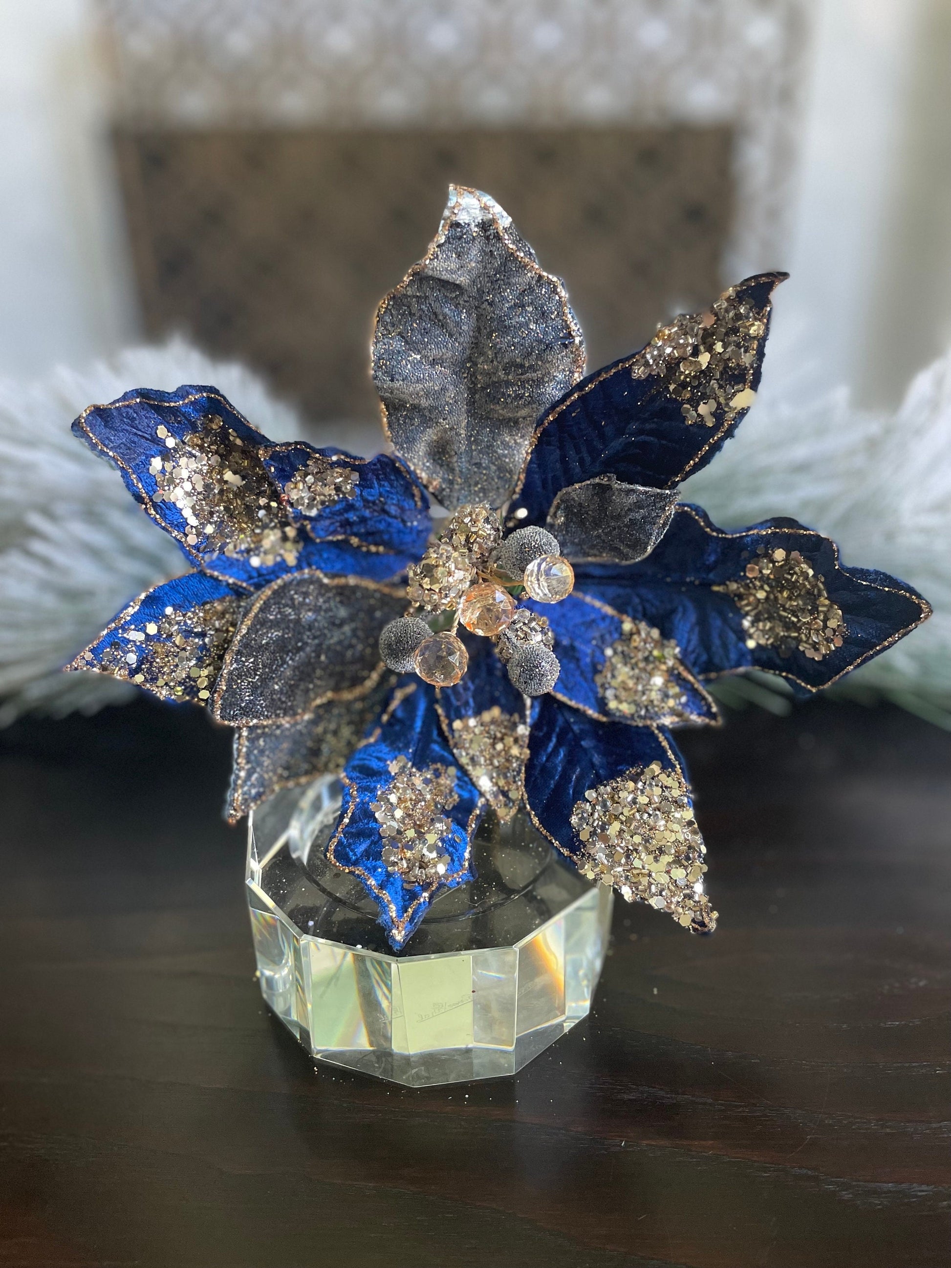 10” Poinsettia stem sapphire and rose gold glitter and beaded. 10” tip to tip.