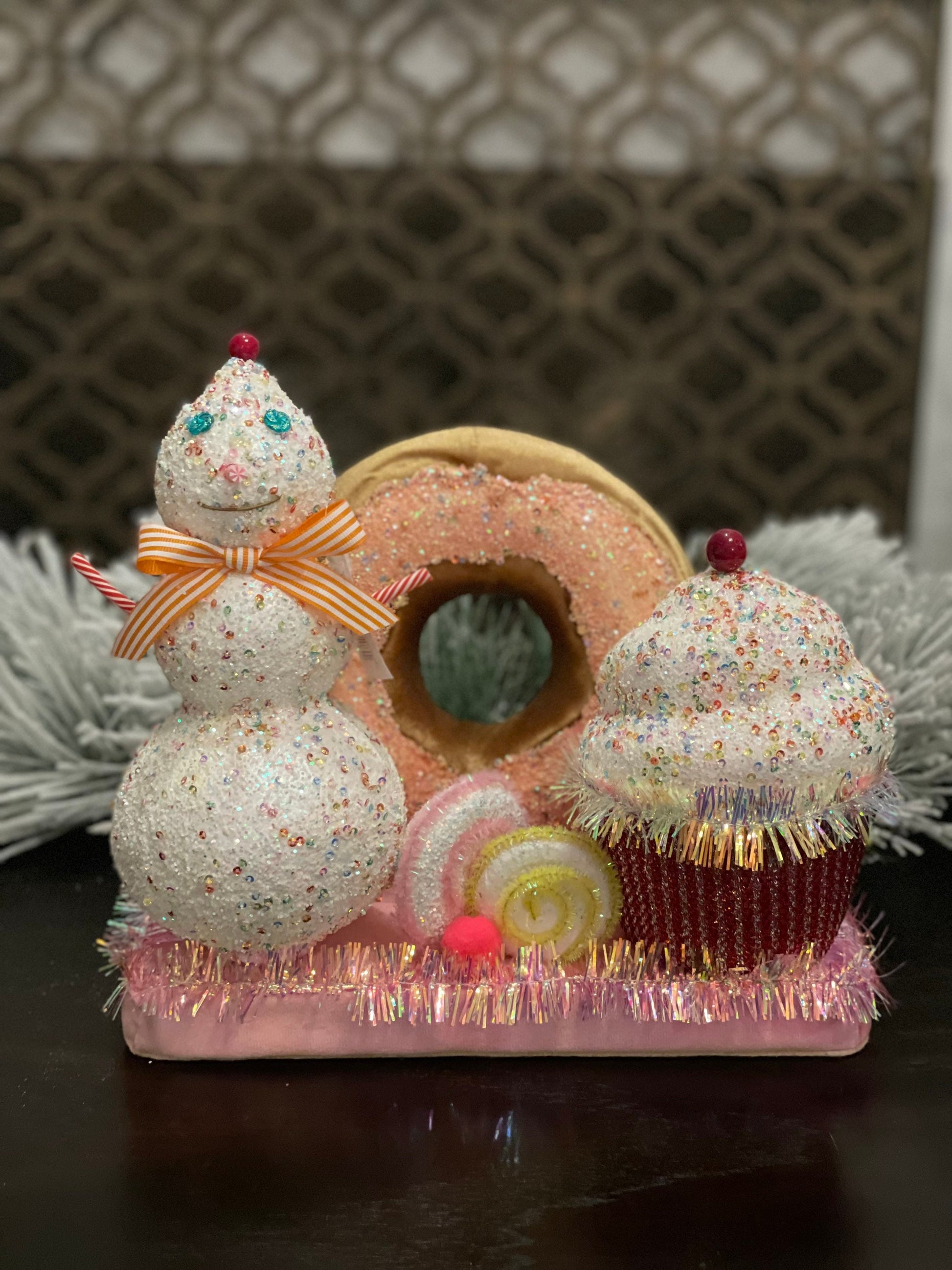 11” l x 10”h x 5.5” w. Snowman donut and cupcake scene.