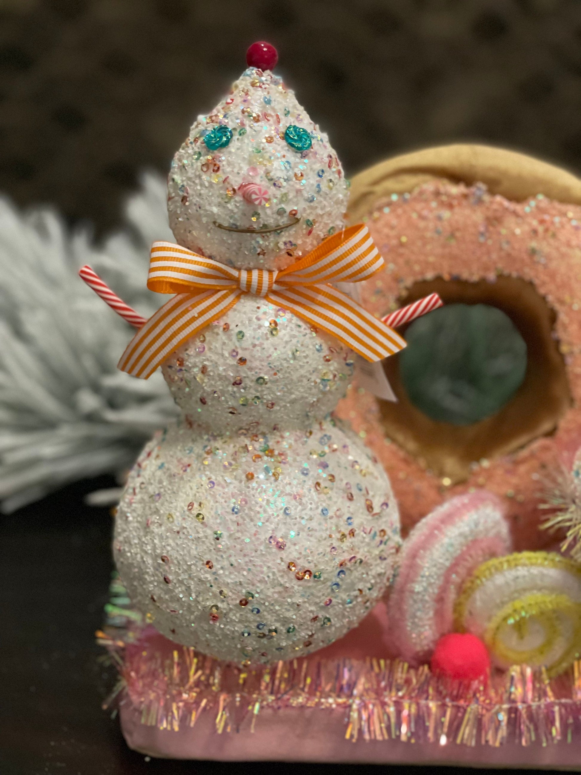 Snowman donut and cupcake scene. Glitter, sequins and fabric. Sweet and cute!