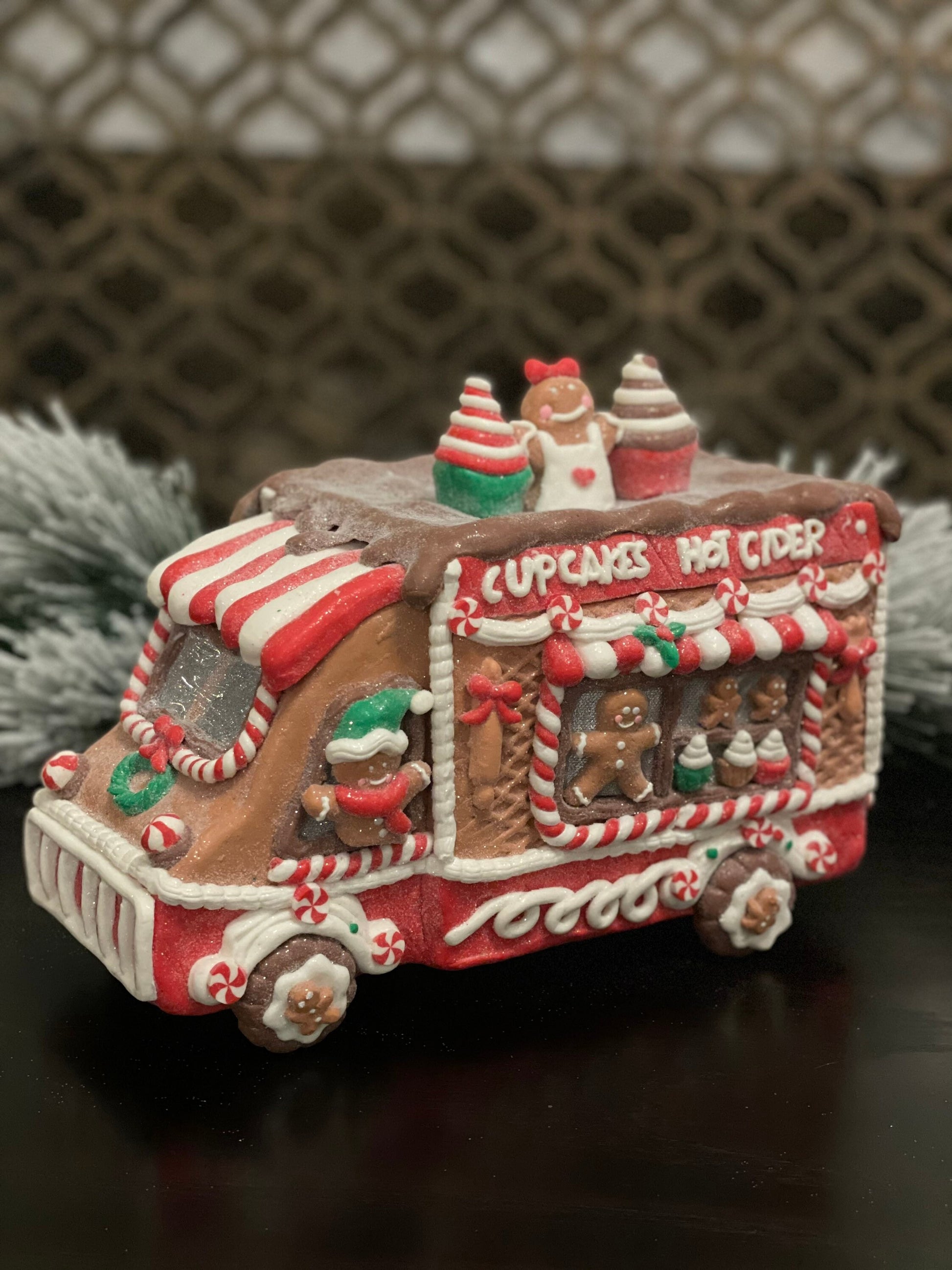 11”L x 8”H x 6W. Gingerbread cupcake truck. Lighted.