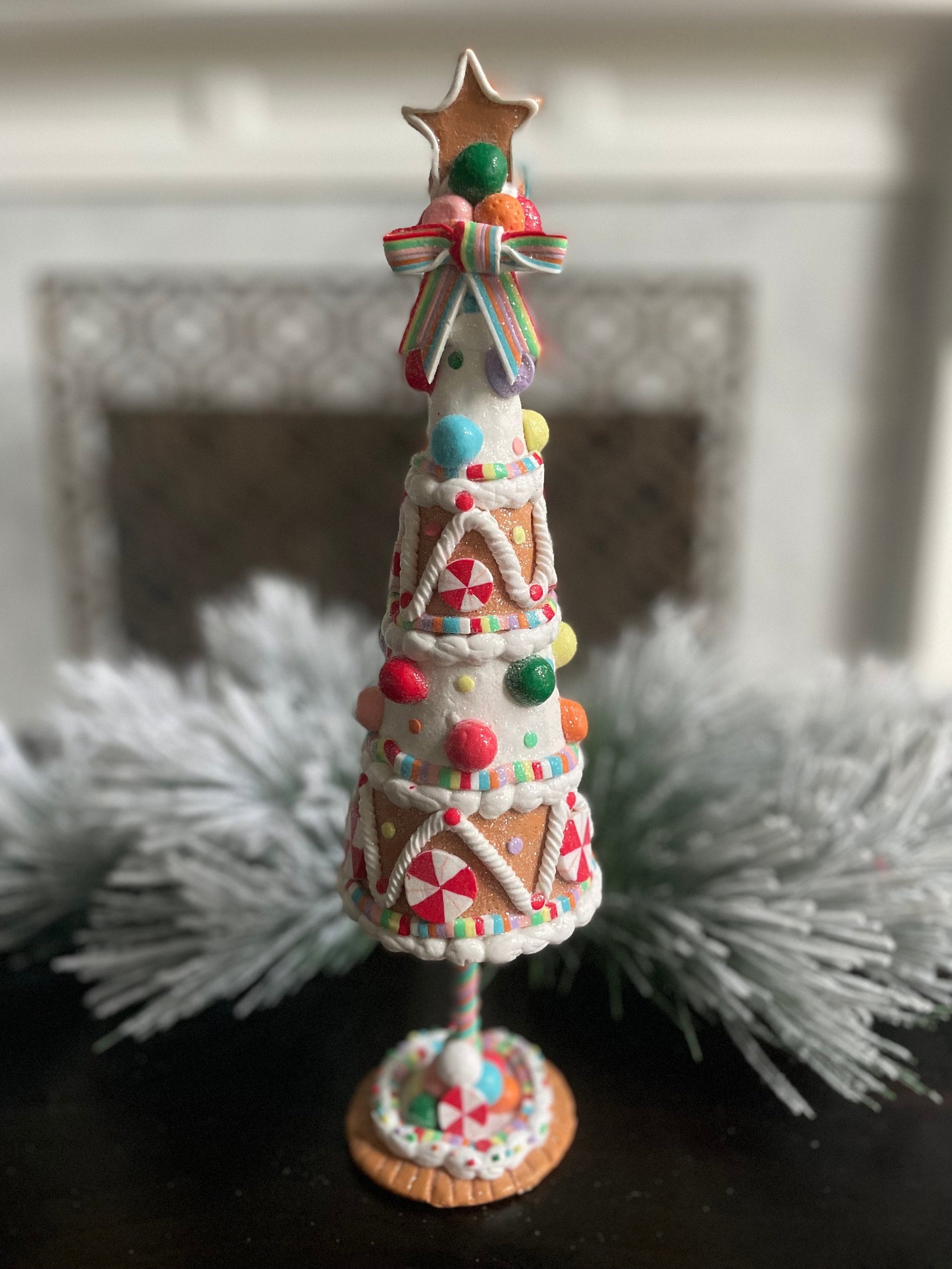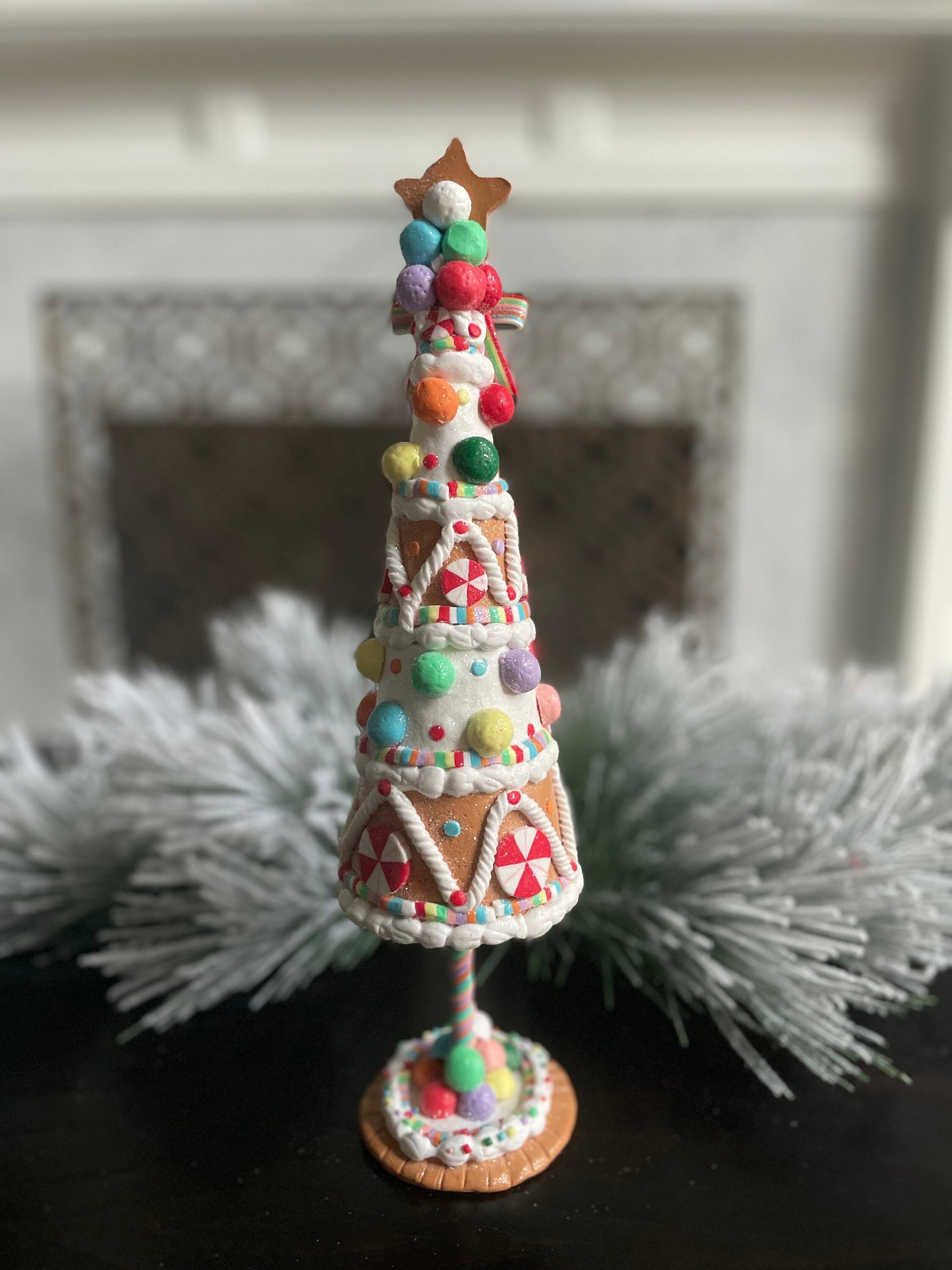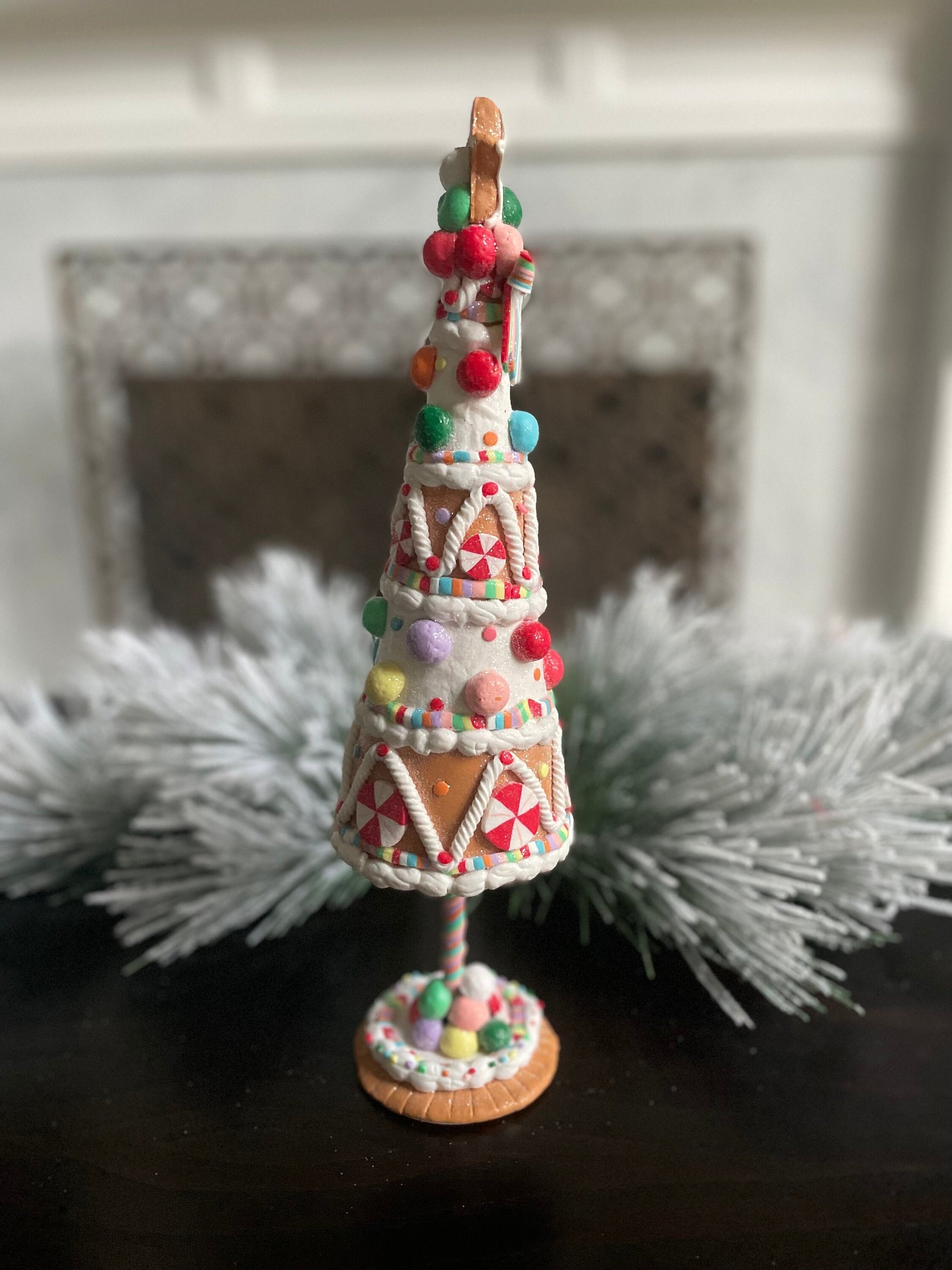 14.5” H x 3.5” W. Claydough gingerbread candy tree. Christmas. Multicolor.