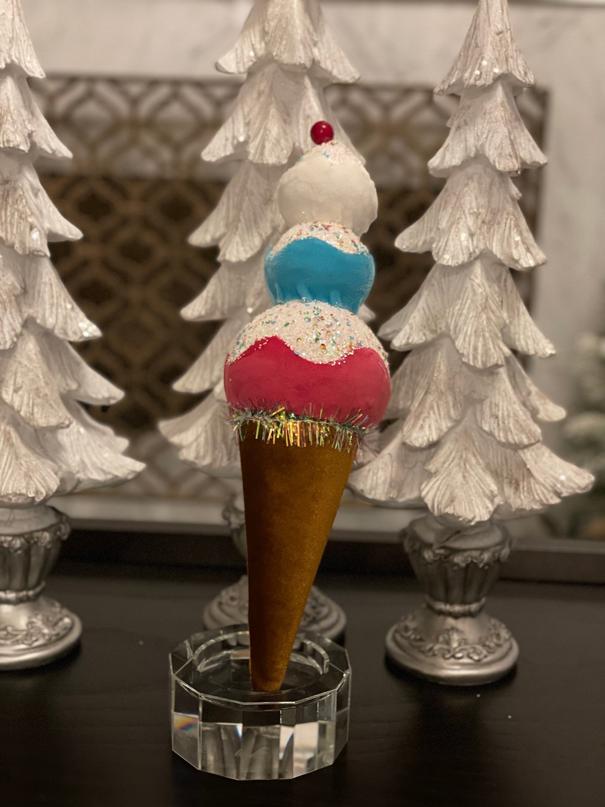 16” ice cream cone turquoise, pink and white. Ornament. Very light weight. It is a beautiful ornament. You can use it in your tree, wreath, garland or anywhere you like.