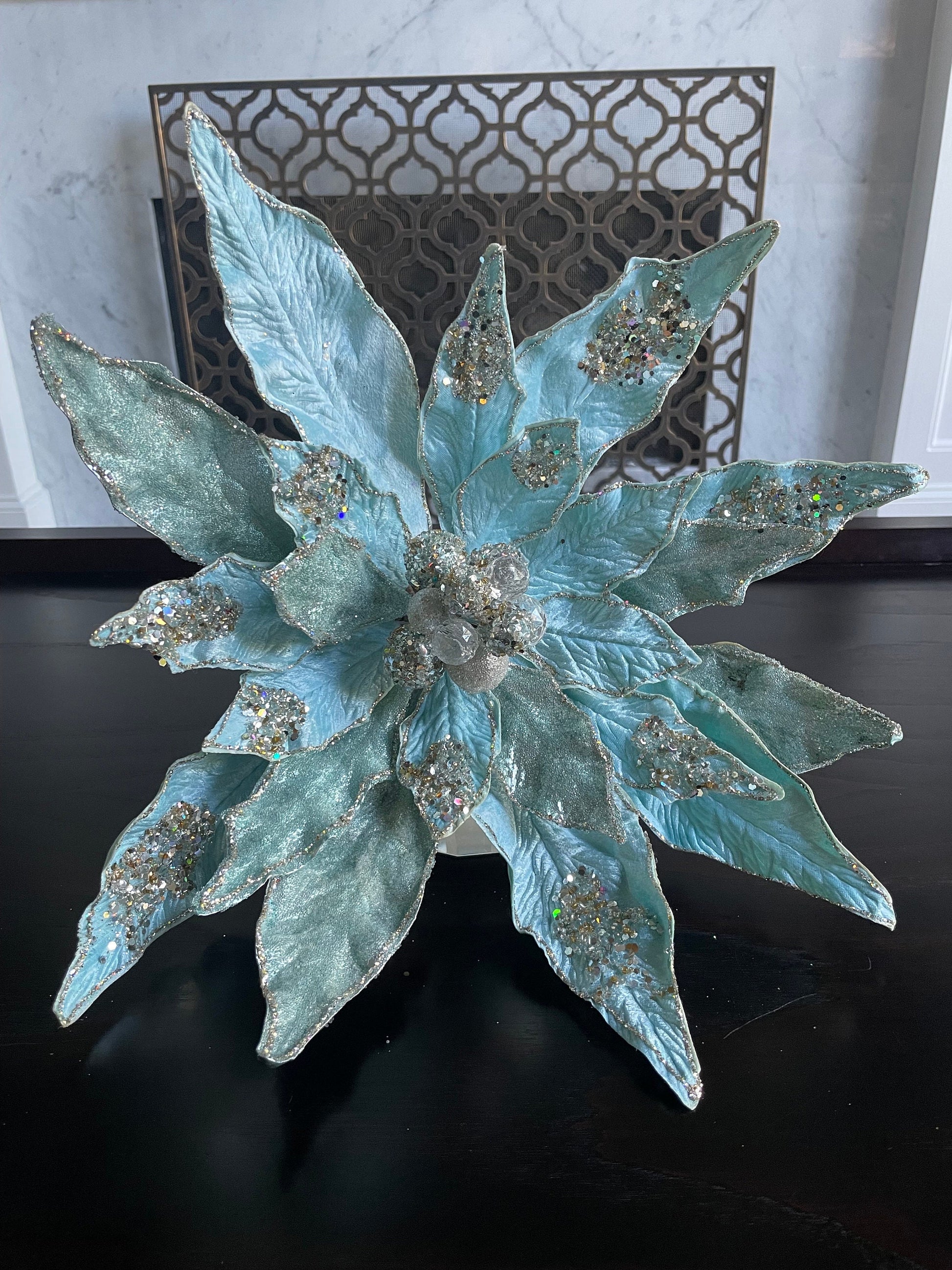 17.5” Clip Poinsettia beaded and glitter soft blue. 17.5” tip to tip.