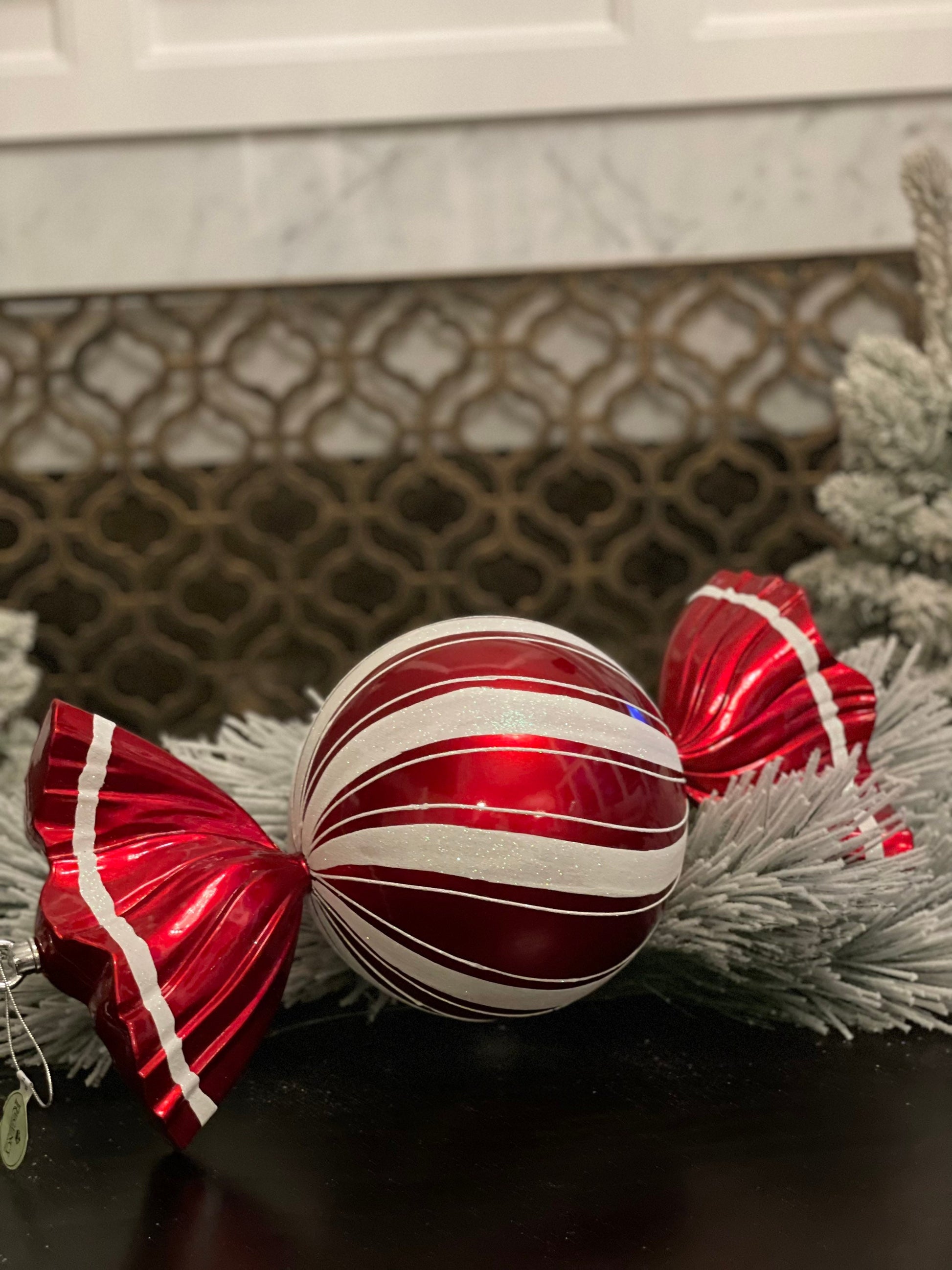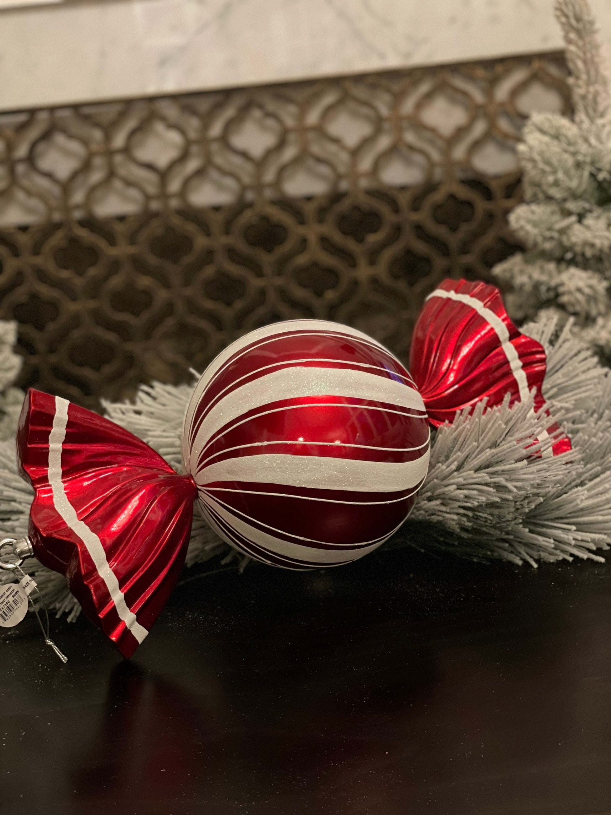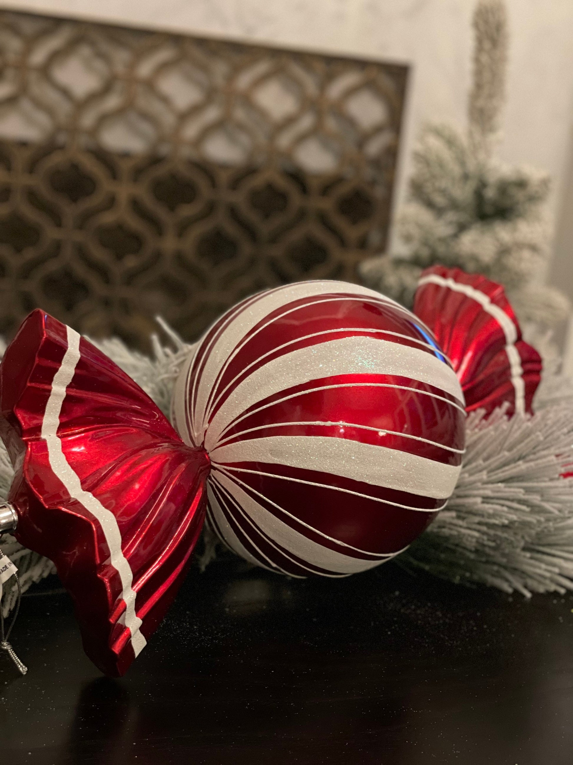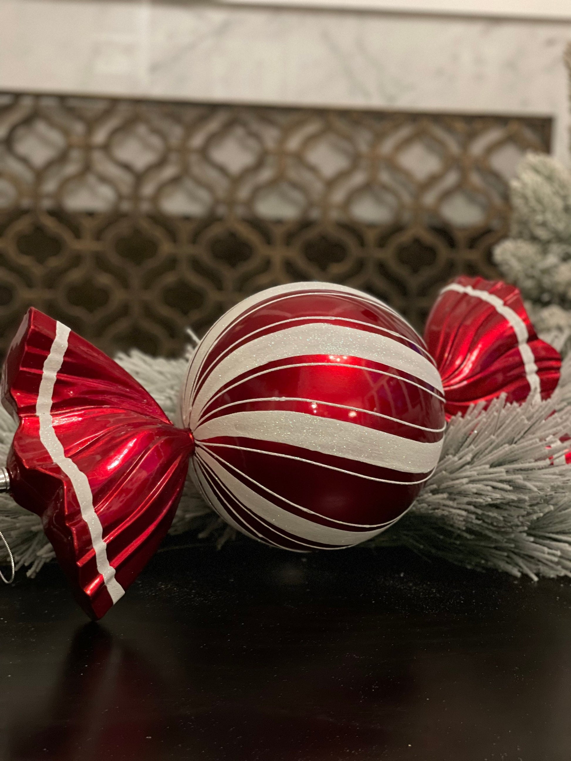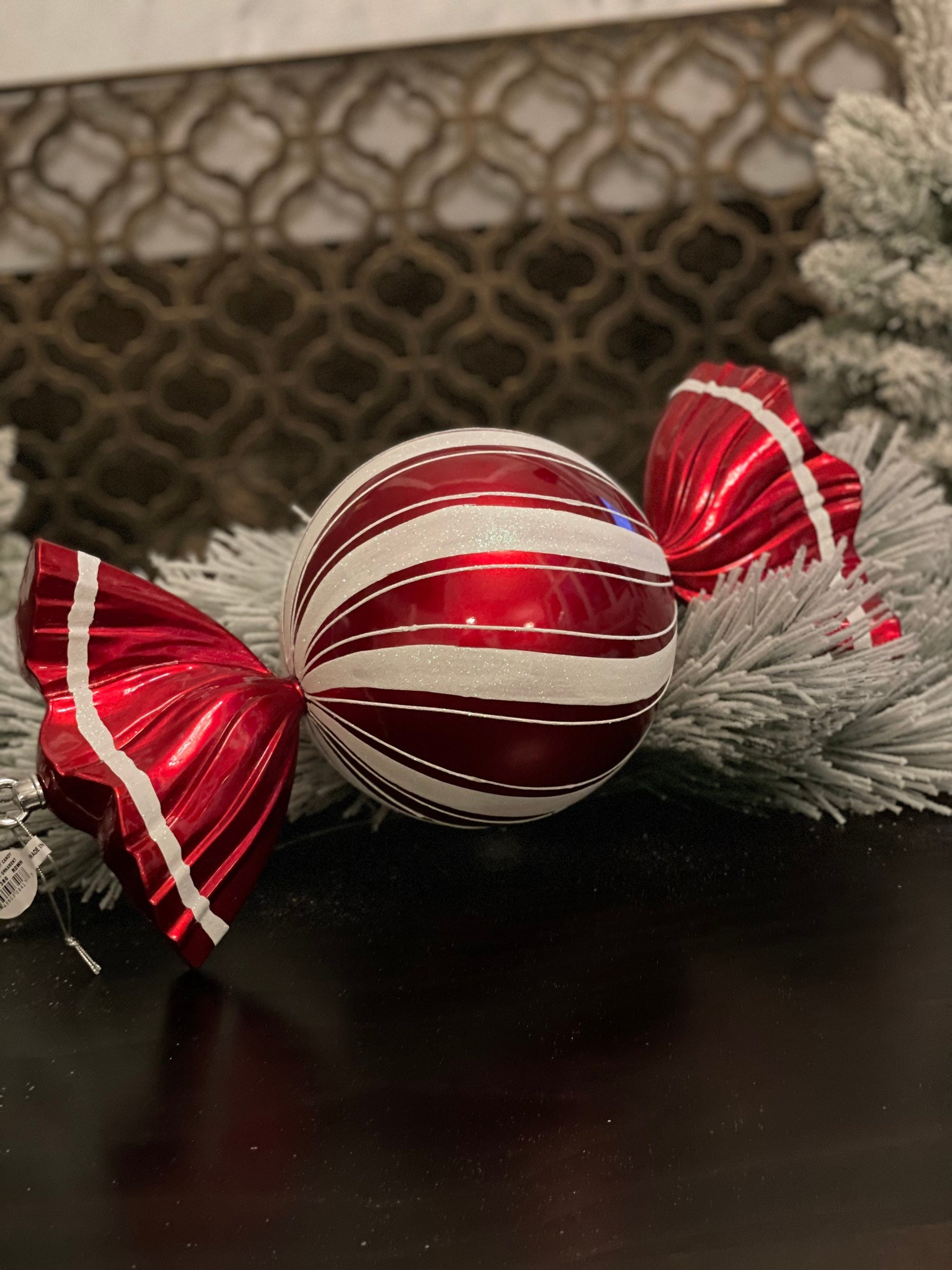 18.5” vp peppermint candy round twist ornament. Shatterproof. Plastic.