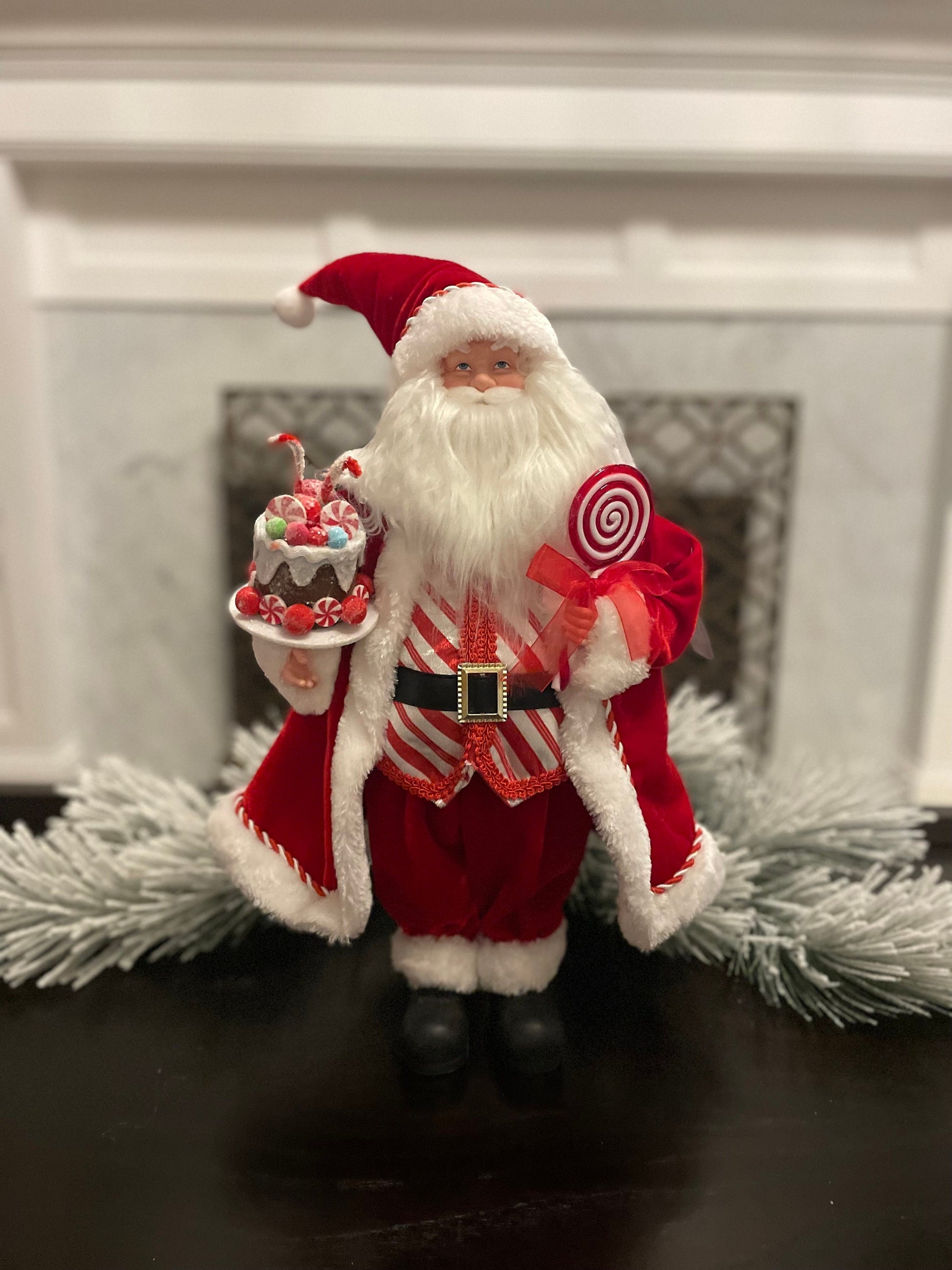 Santa would be a wonderful addition to your candy christmas decorations. He is wearing a red and white outfit.
