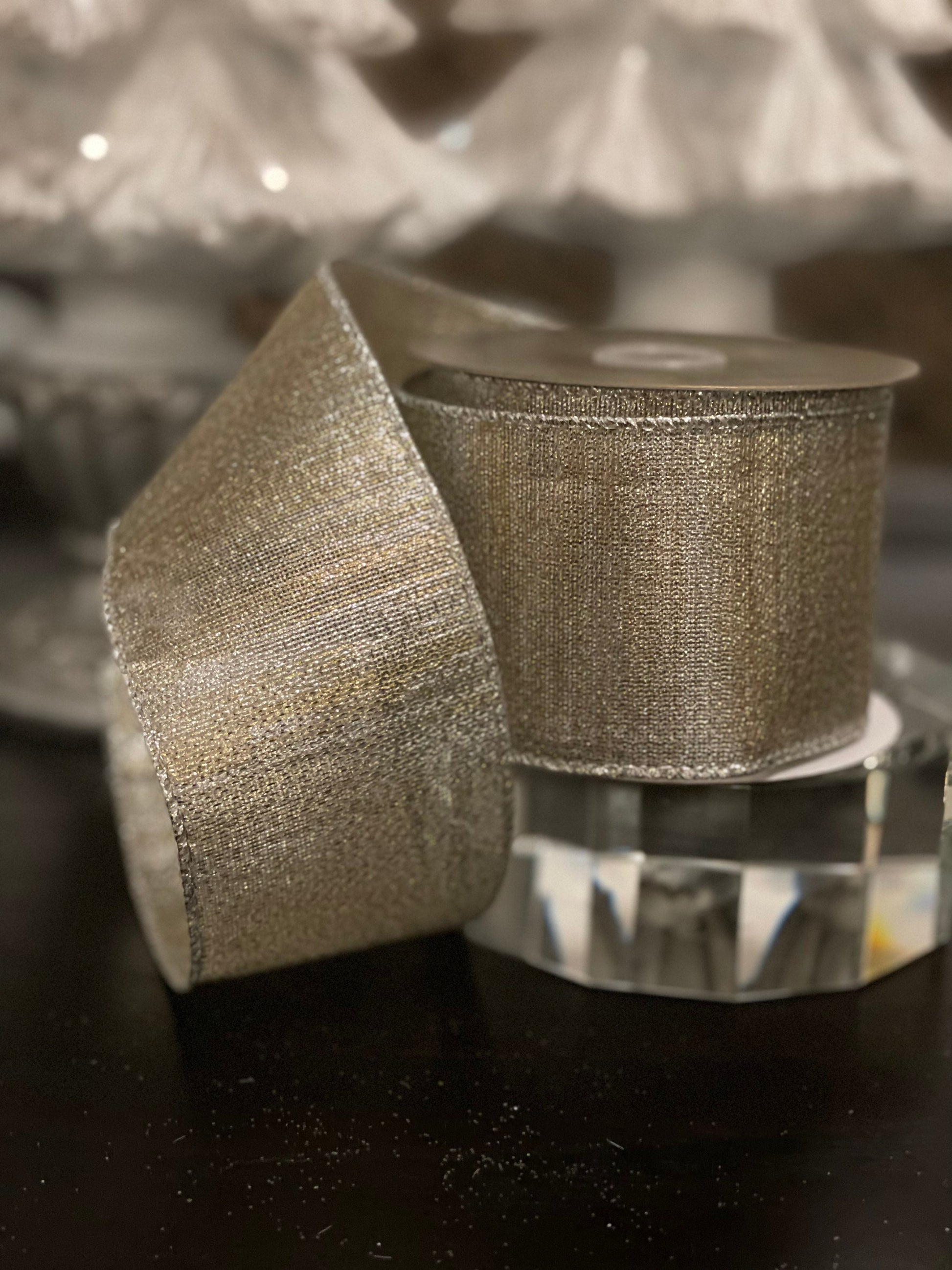 2.5” x 10 yd metallic ribbon wired. Platinum.
