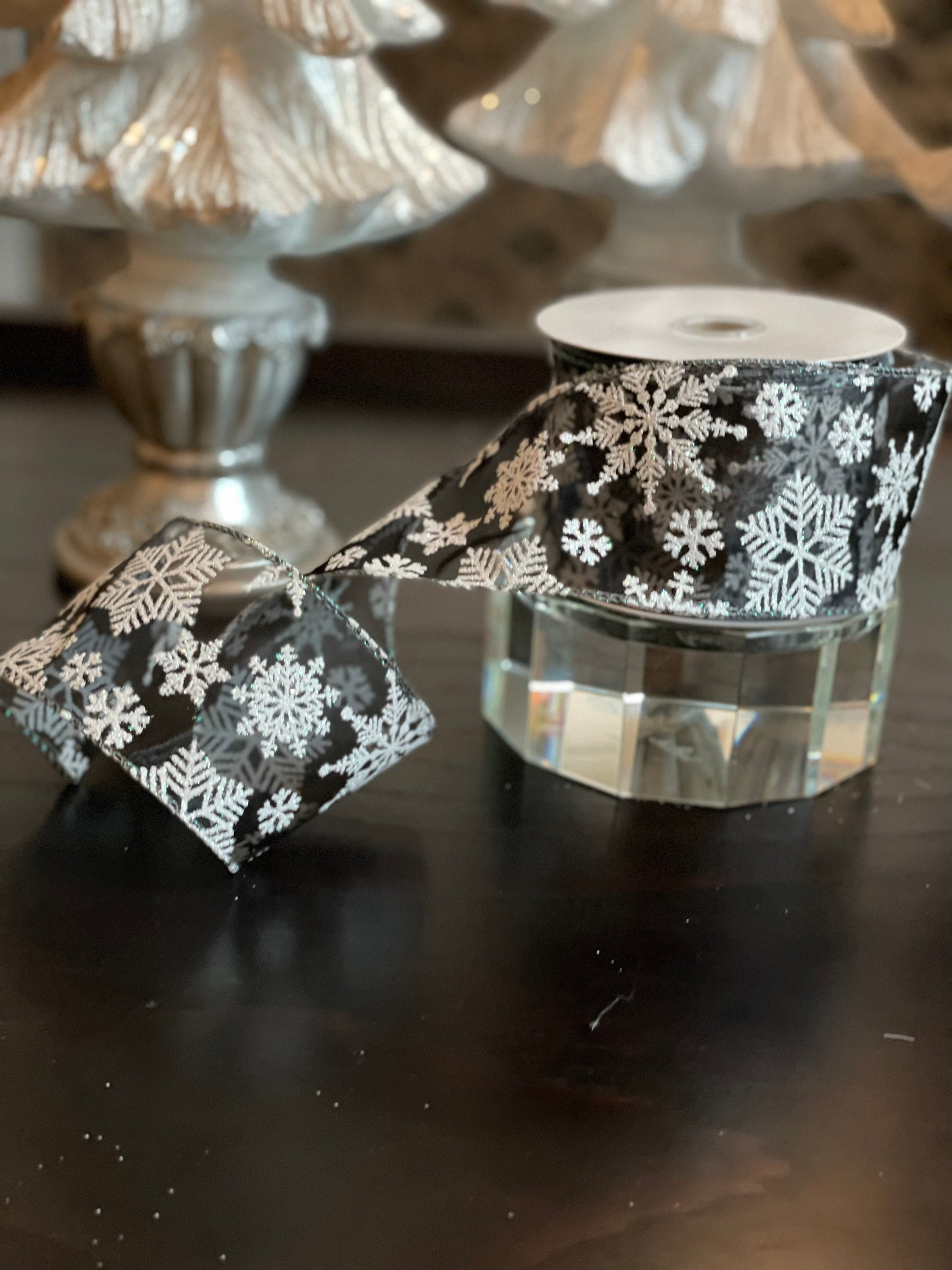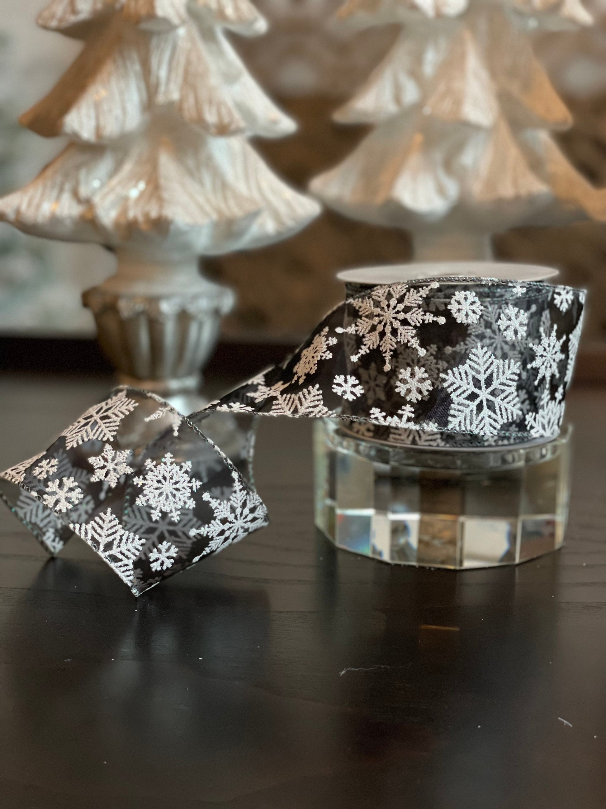 2.5” x 10 yd sheer snowflake wired ribbon. Gray.
