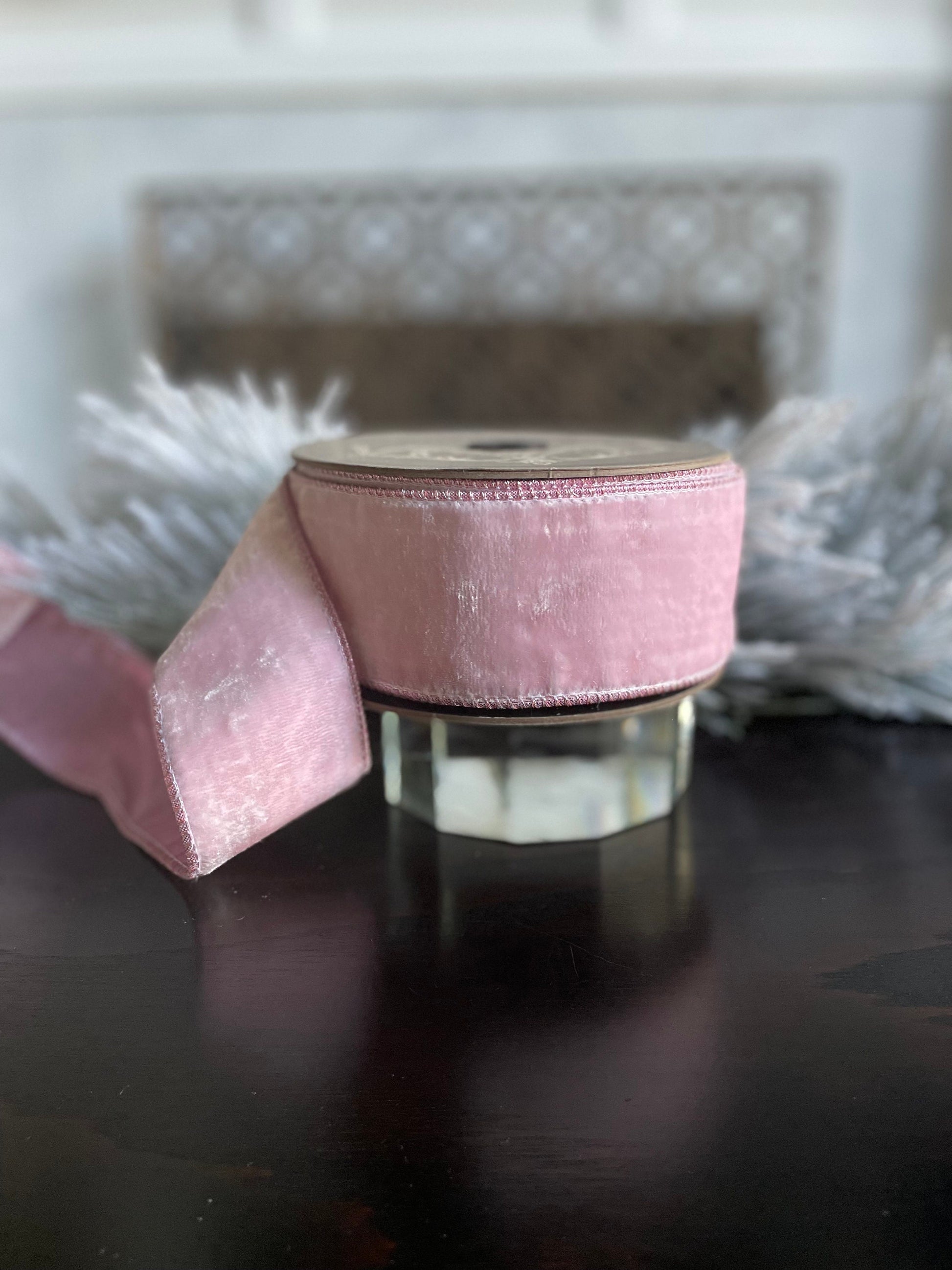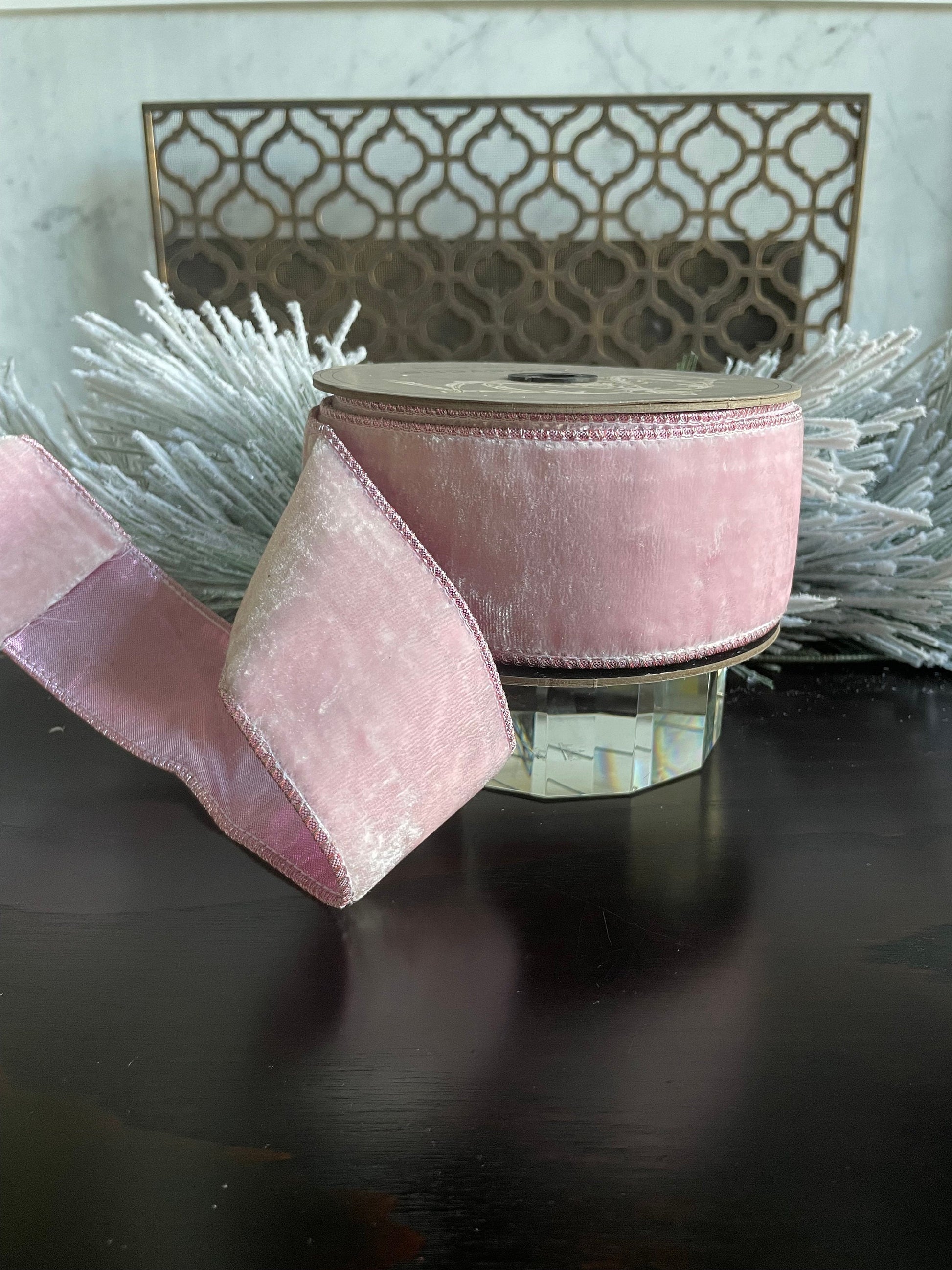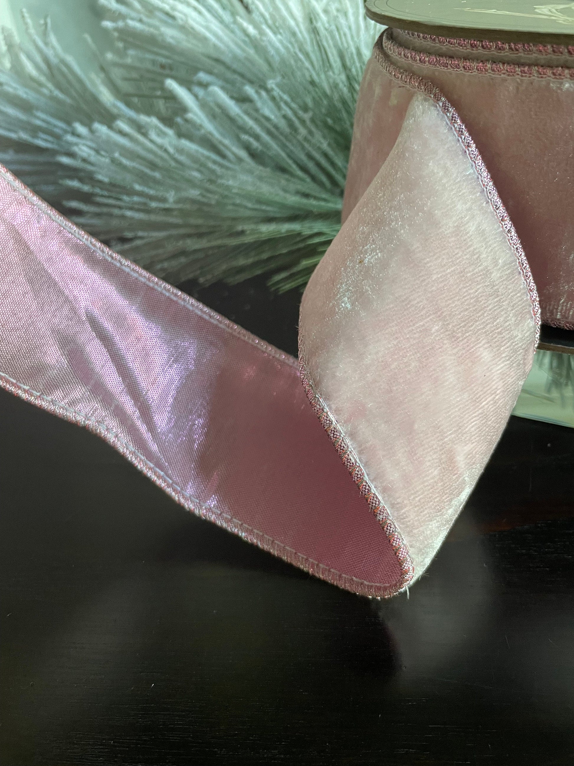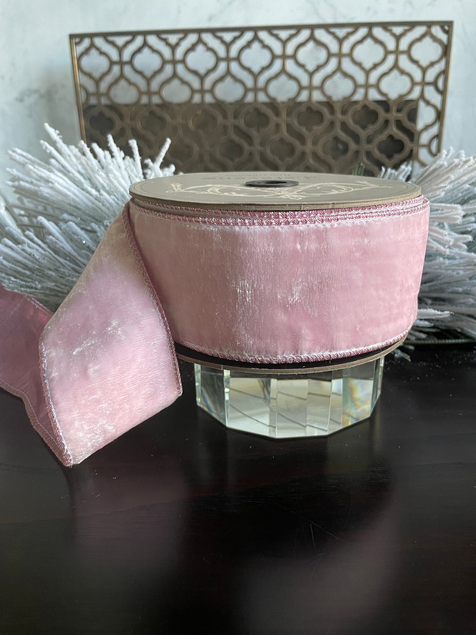 2.5" x 10 yds. Designer crown pink velvet metallic dupion back. Wired. D. Stevens.