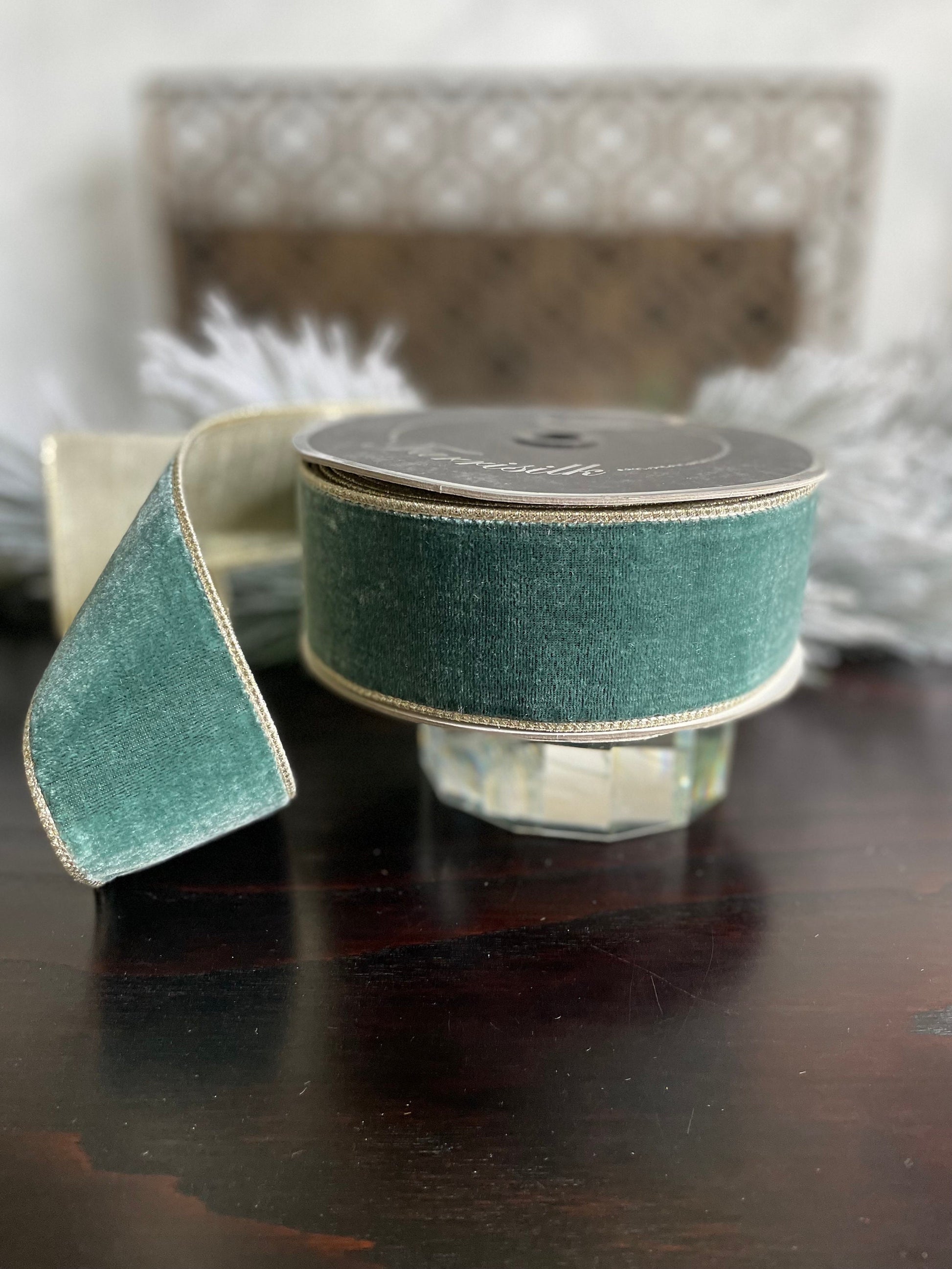 2.5” x 10 yds. Designer flashy velvet celadon ribbon. Platinum back. Wired. Farrisilk.
