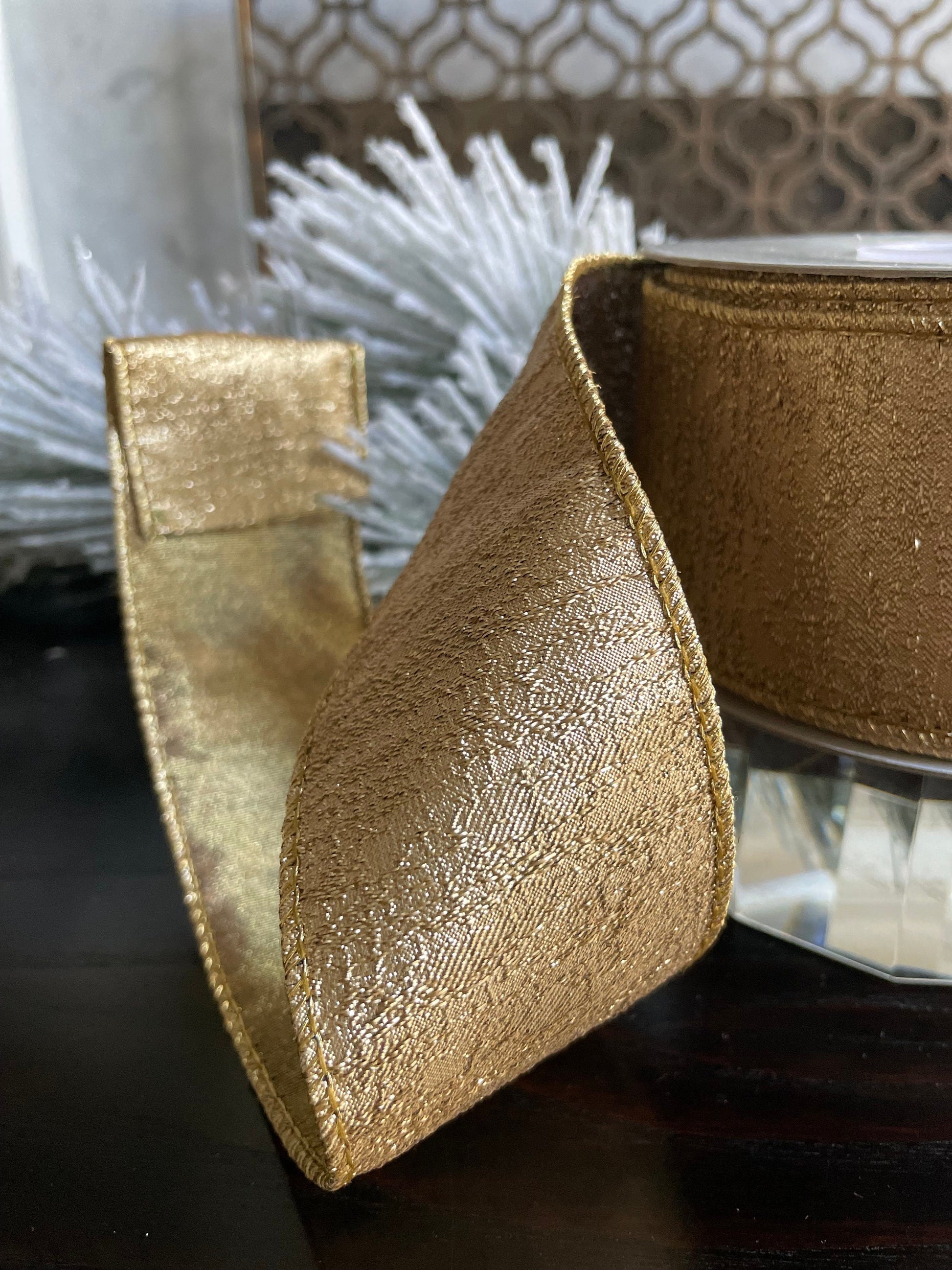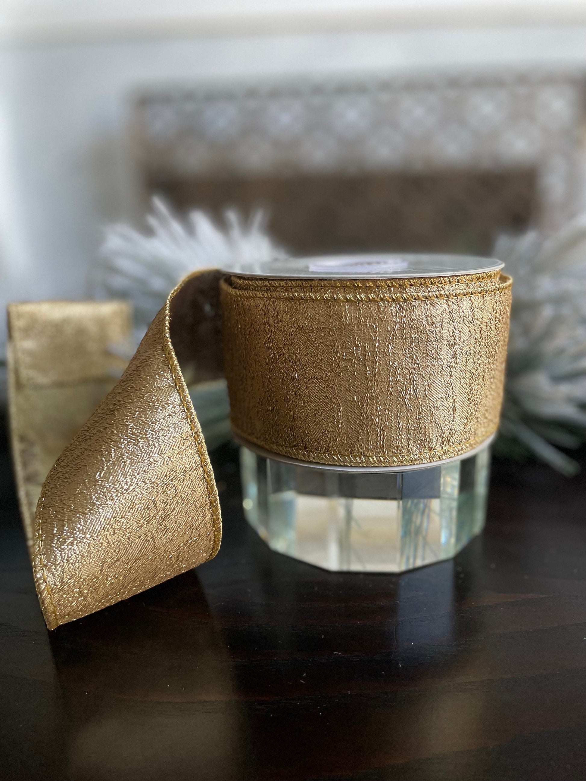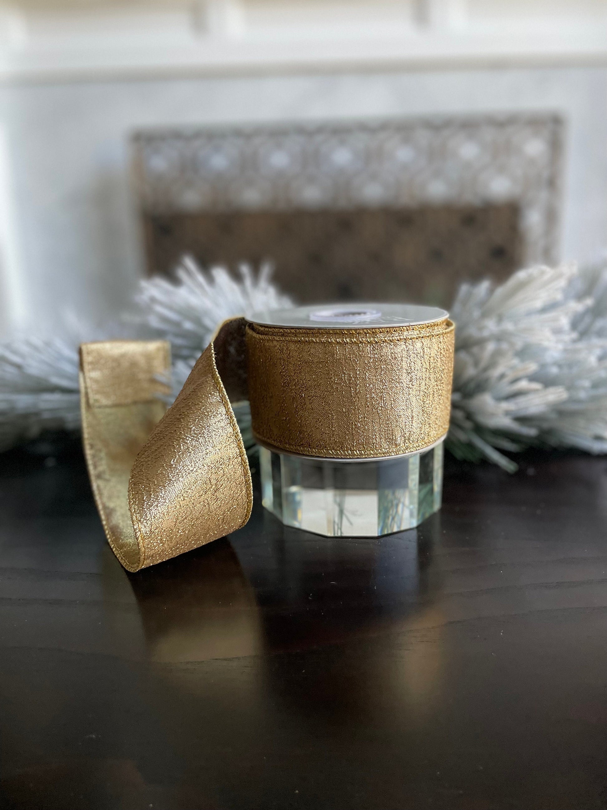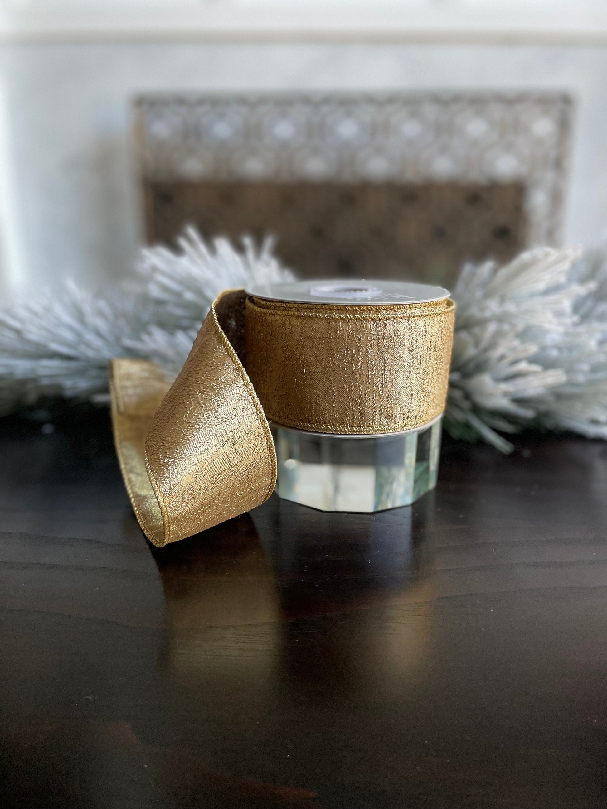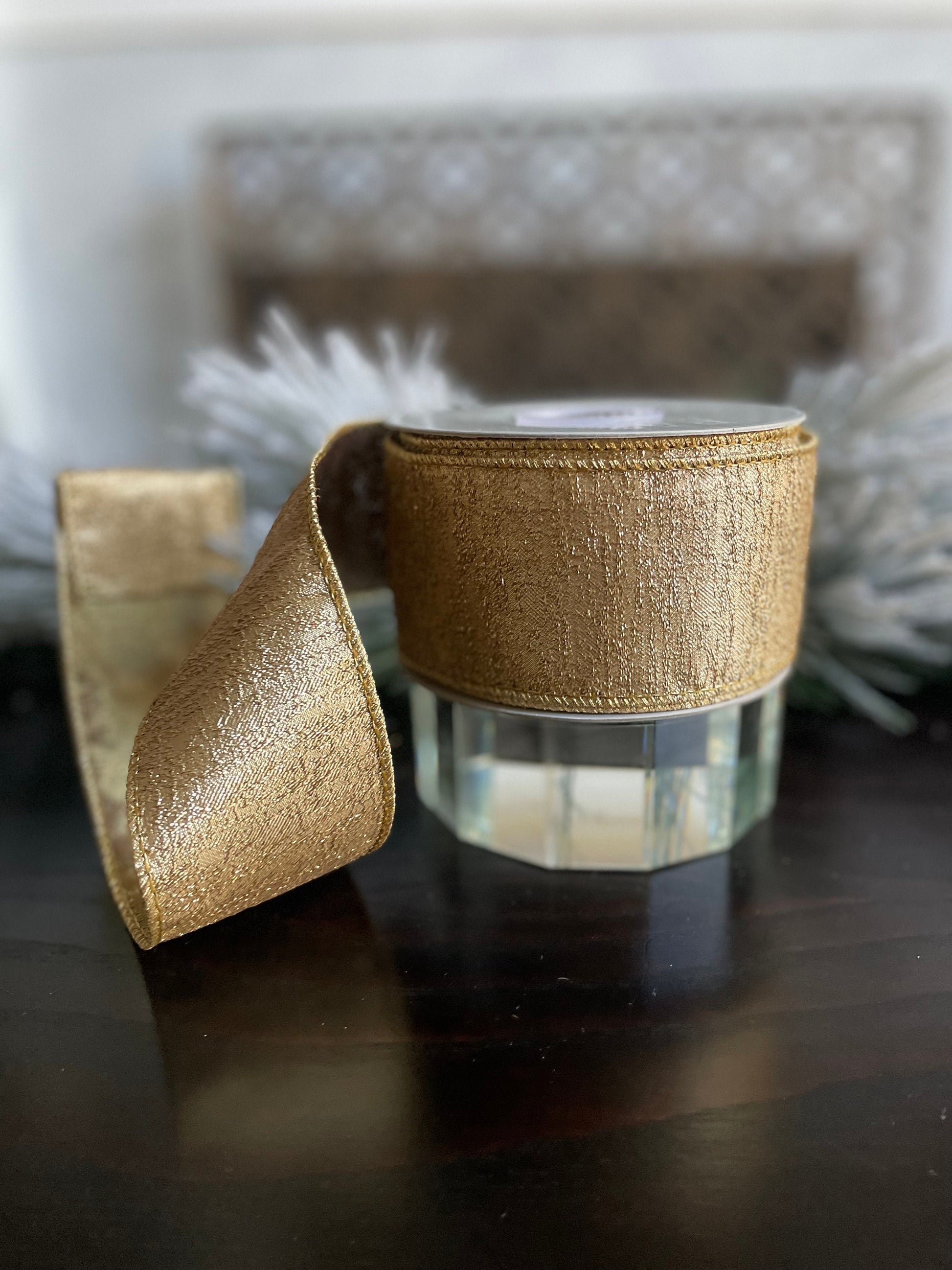 2.5” x 10 yds. Designer gold metallic wired ribbon. Raz.