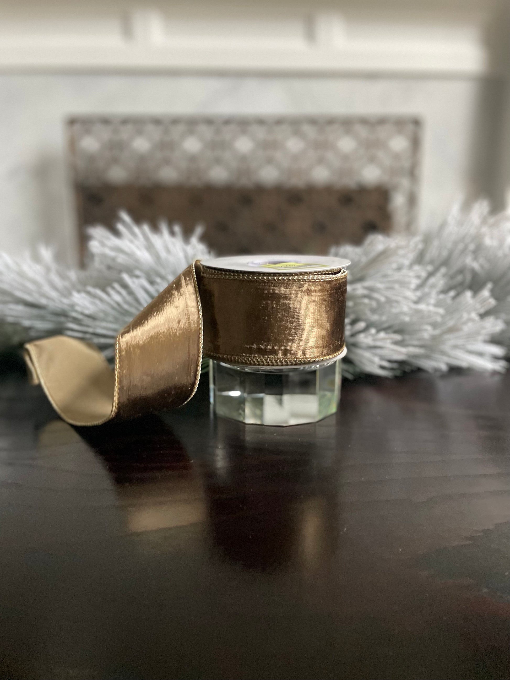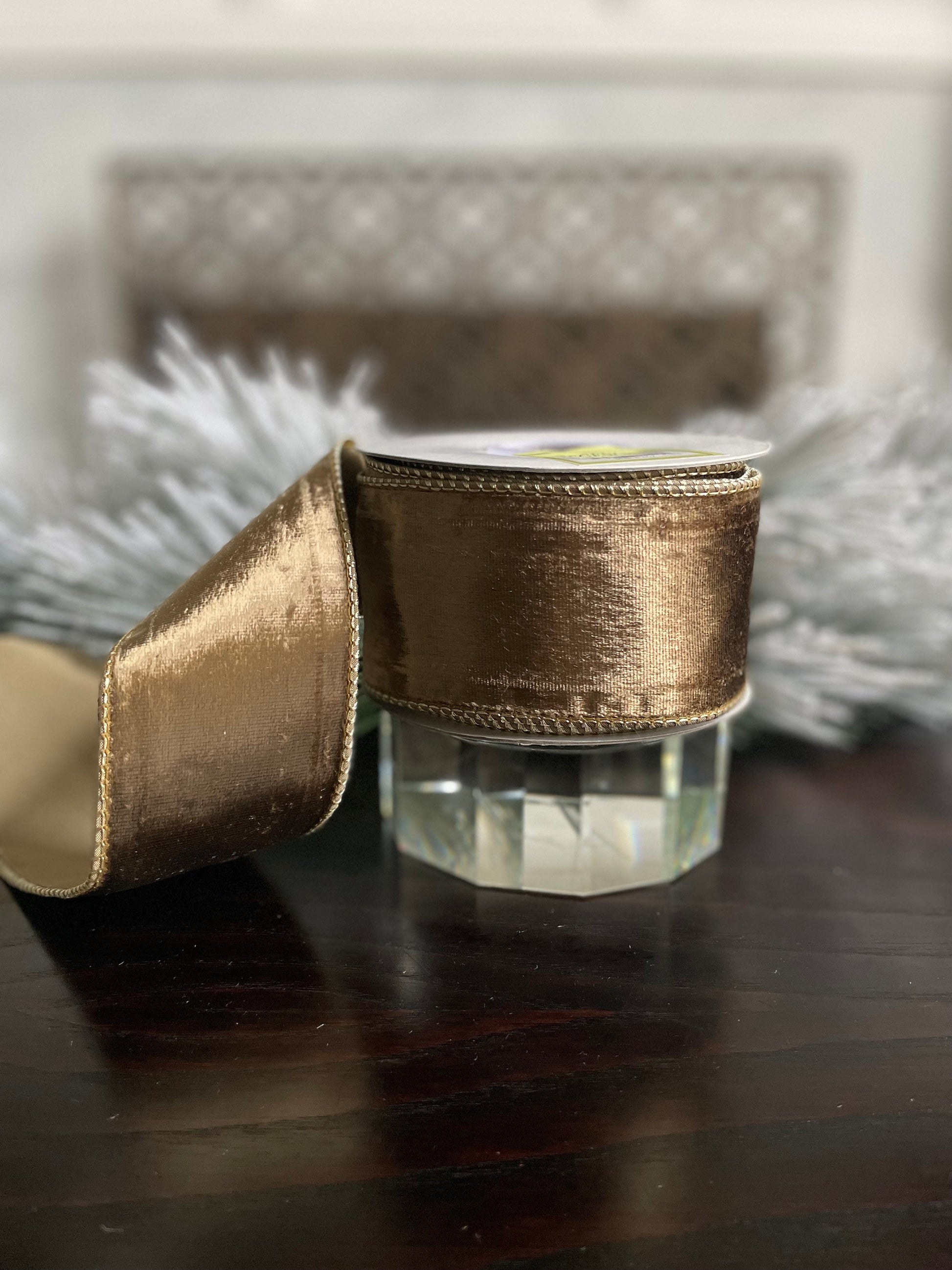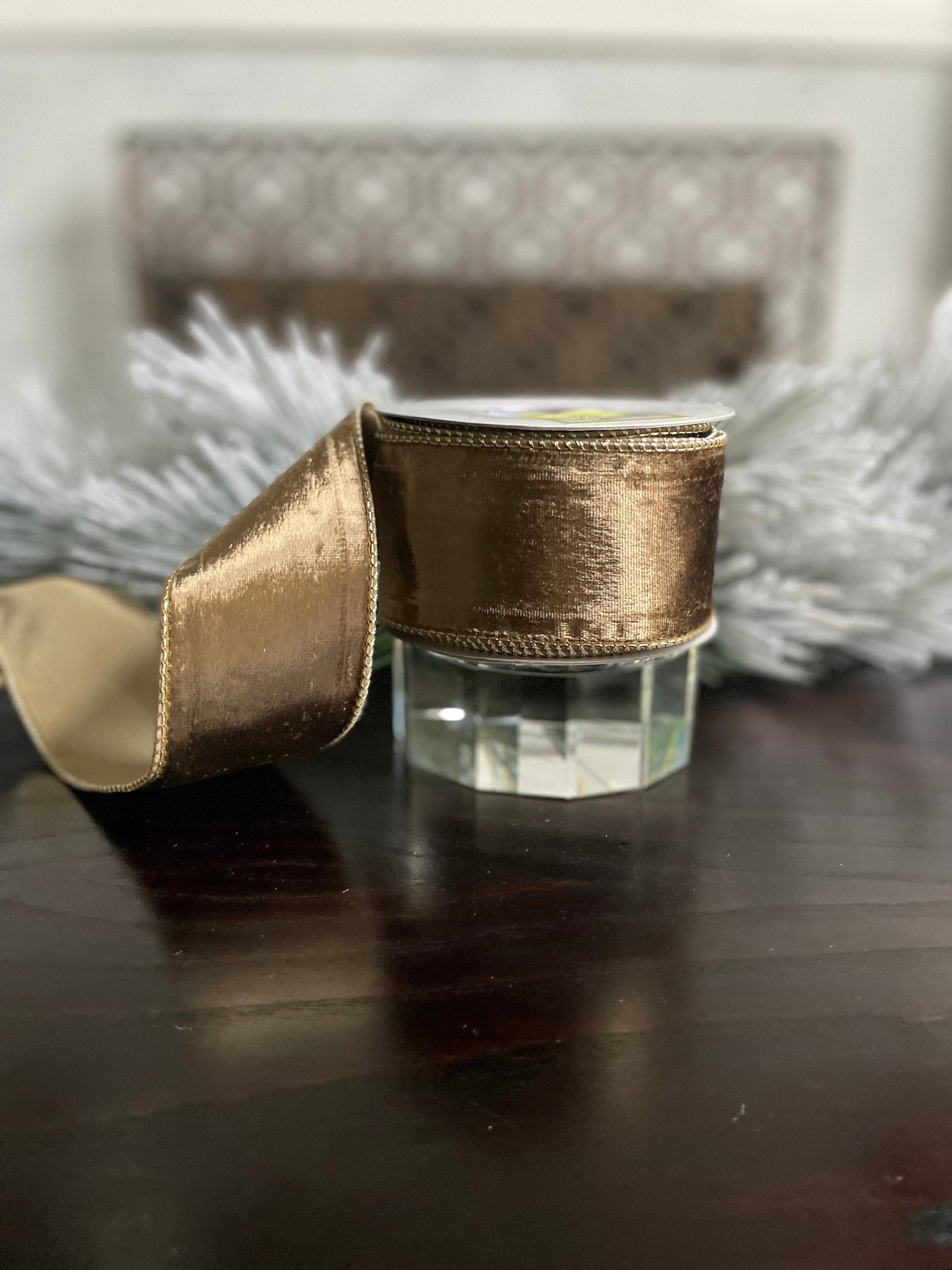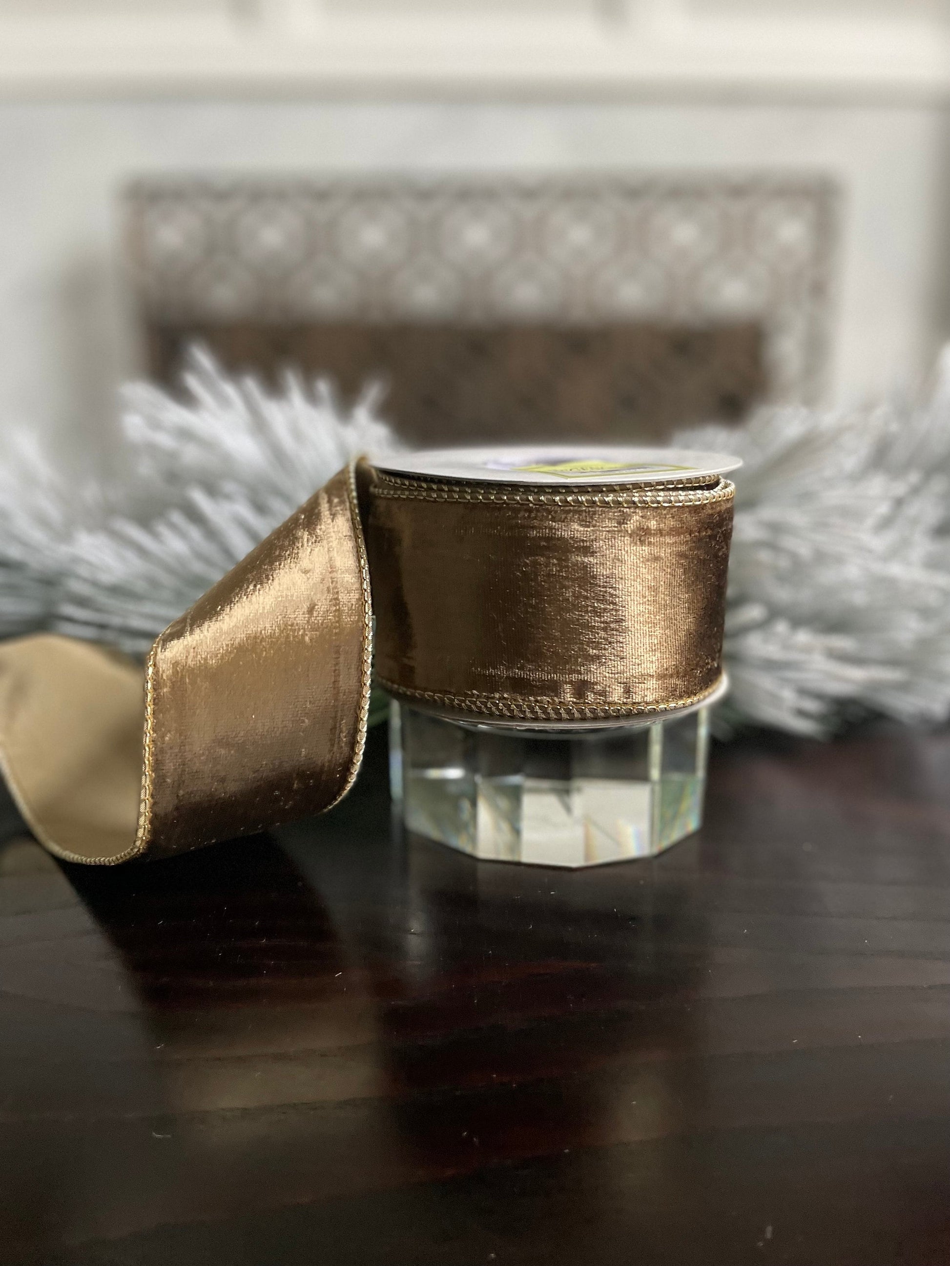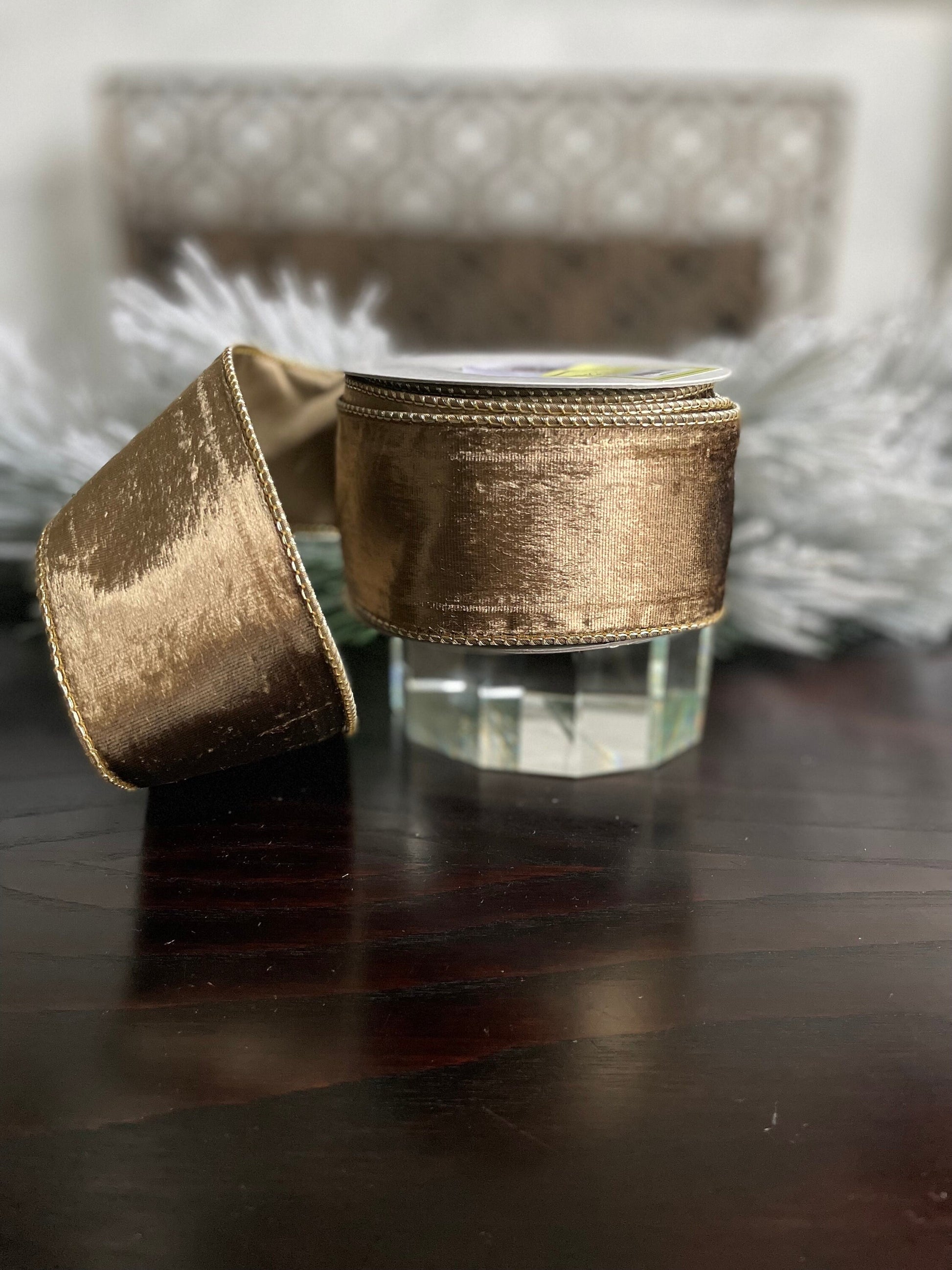 2.5” x 10 yds. Designer gold smooth velvet and taffeta back ribbon. Wired. Regency.