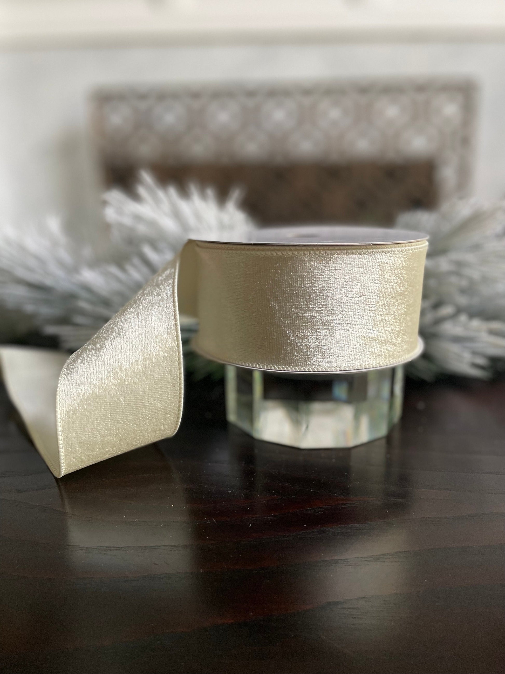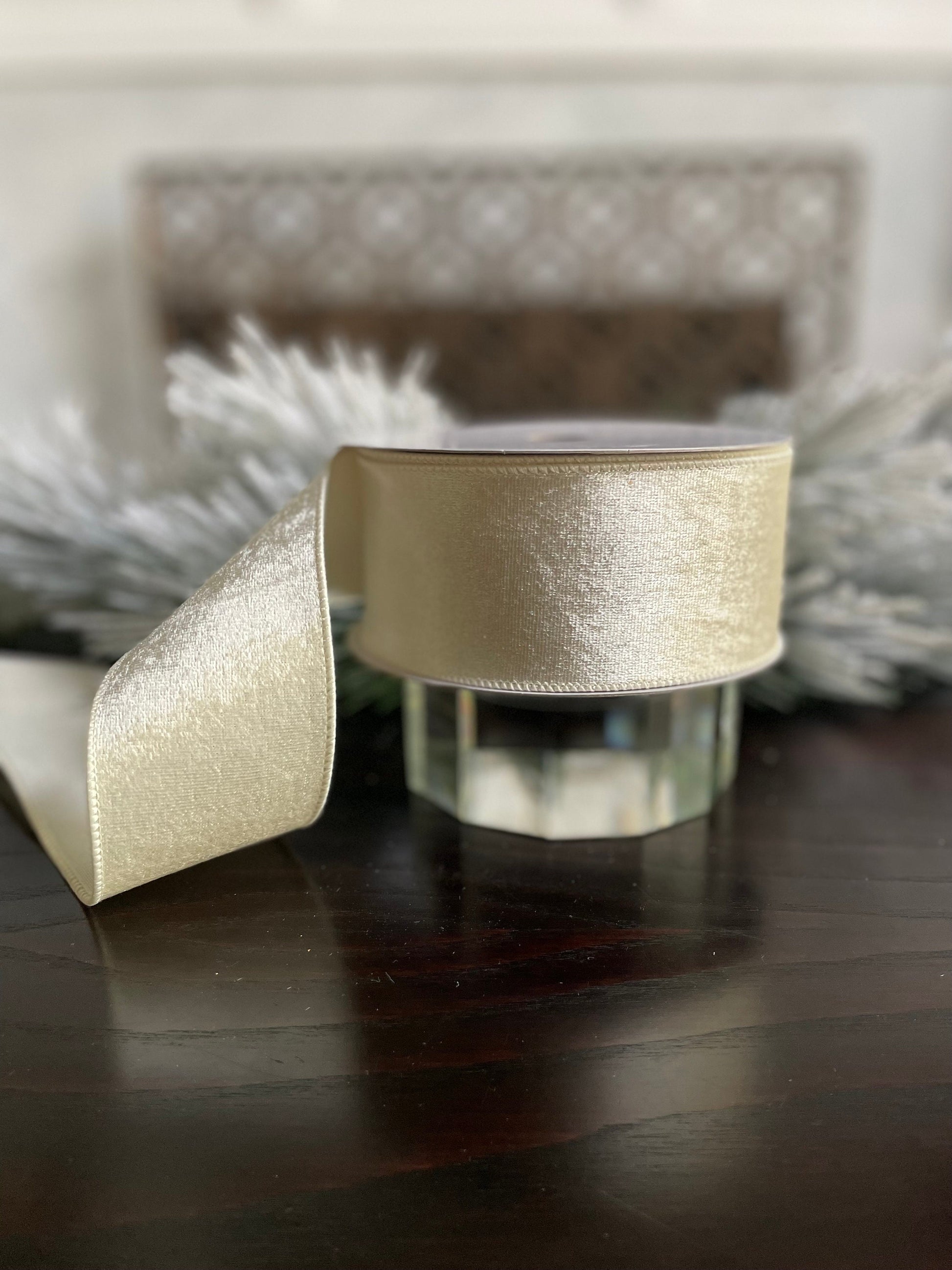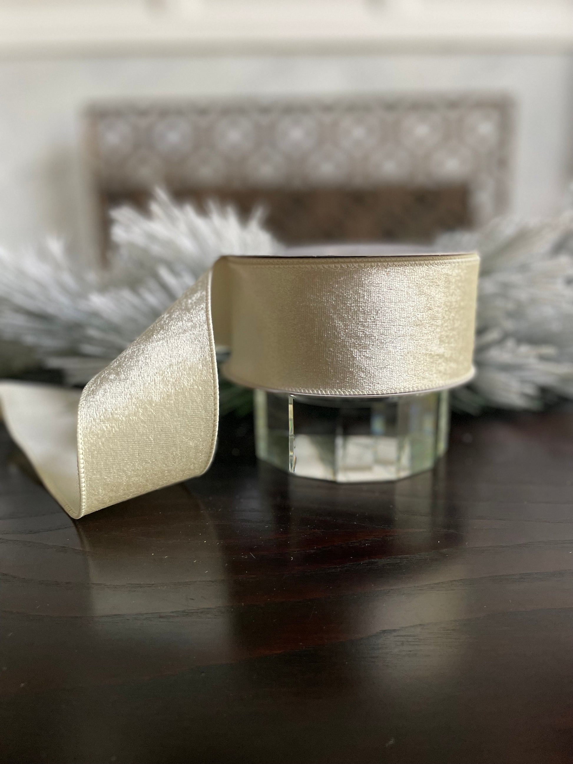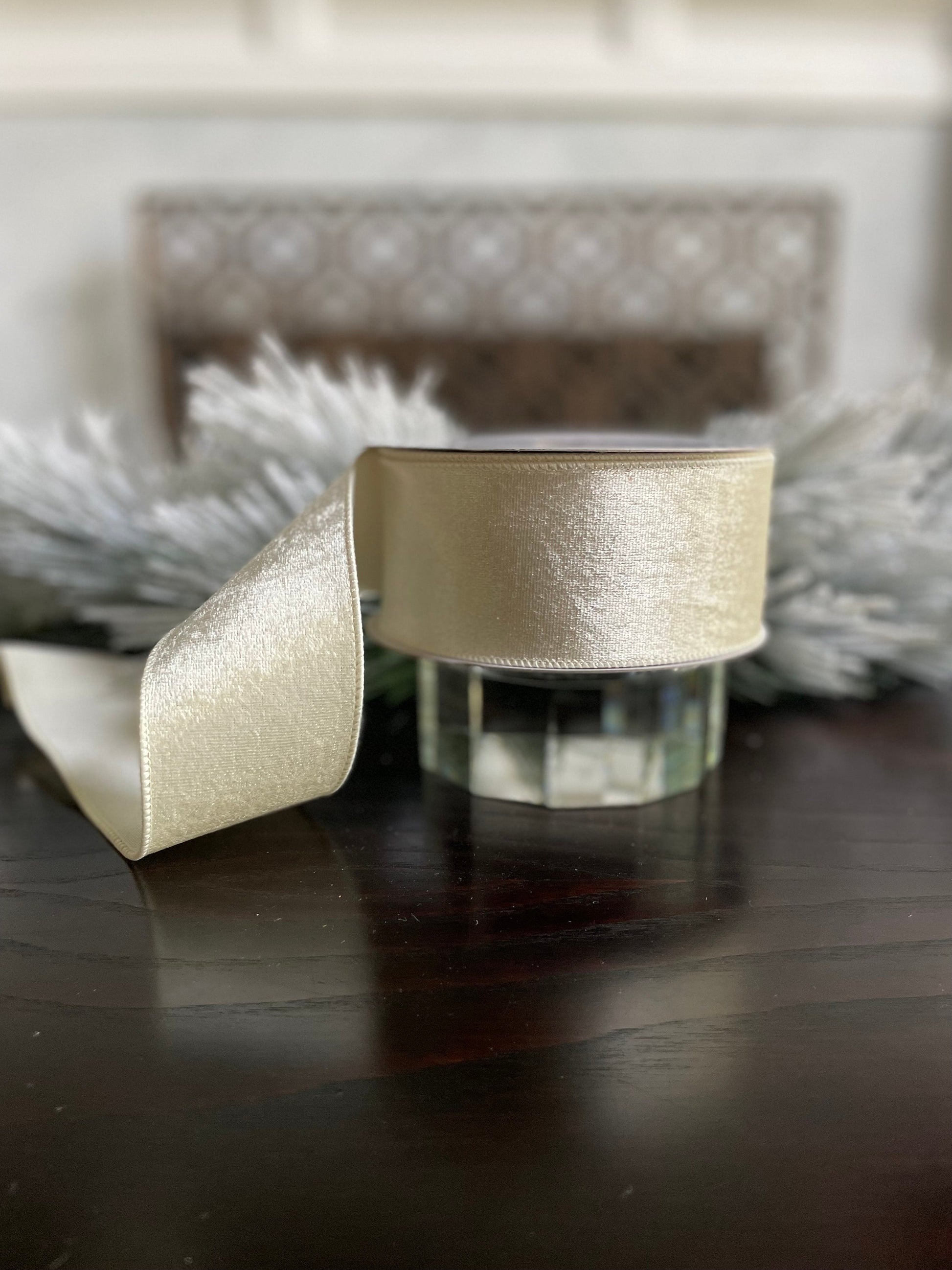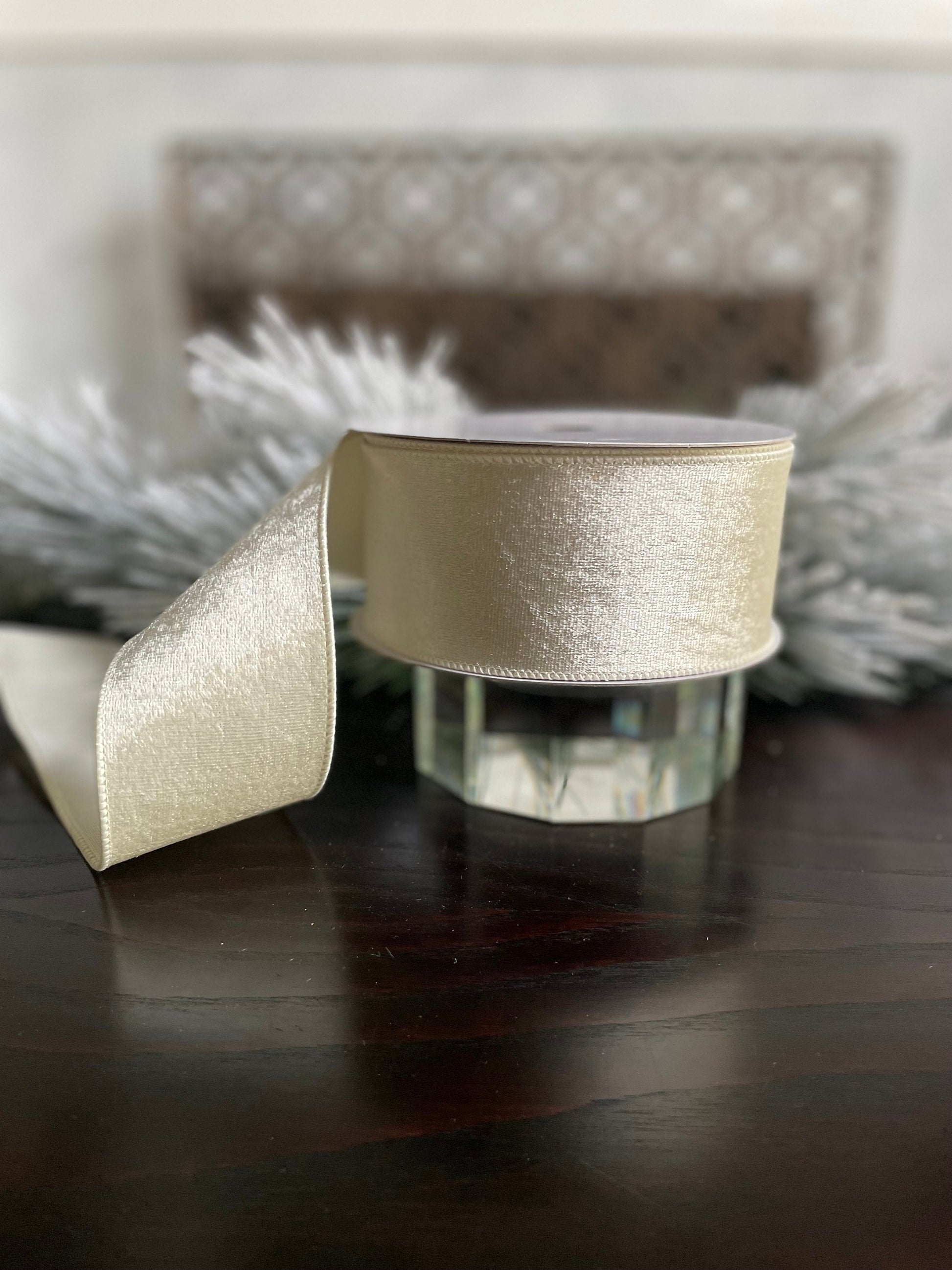 2.5” x 10 yds. Designer ivory velvet with dupion back ribbon. Wired. Regency.