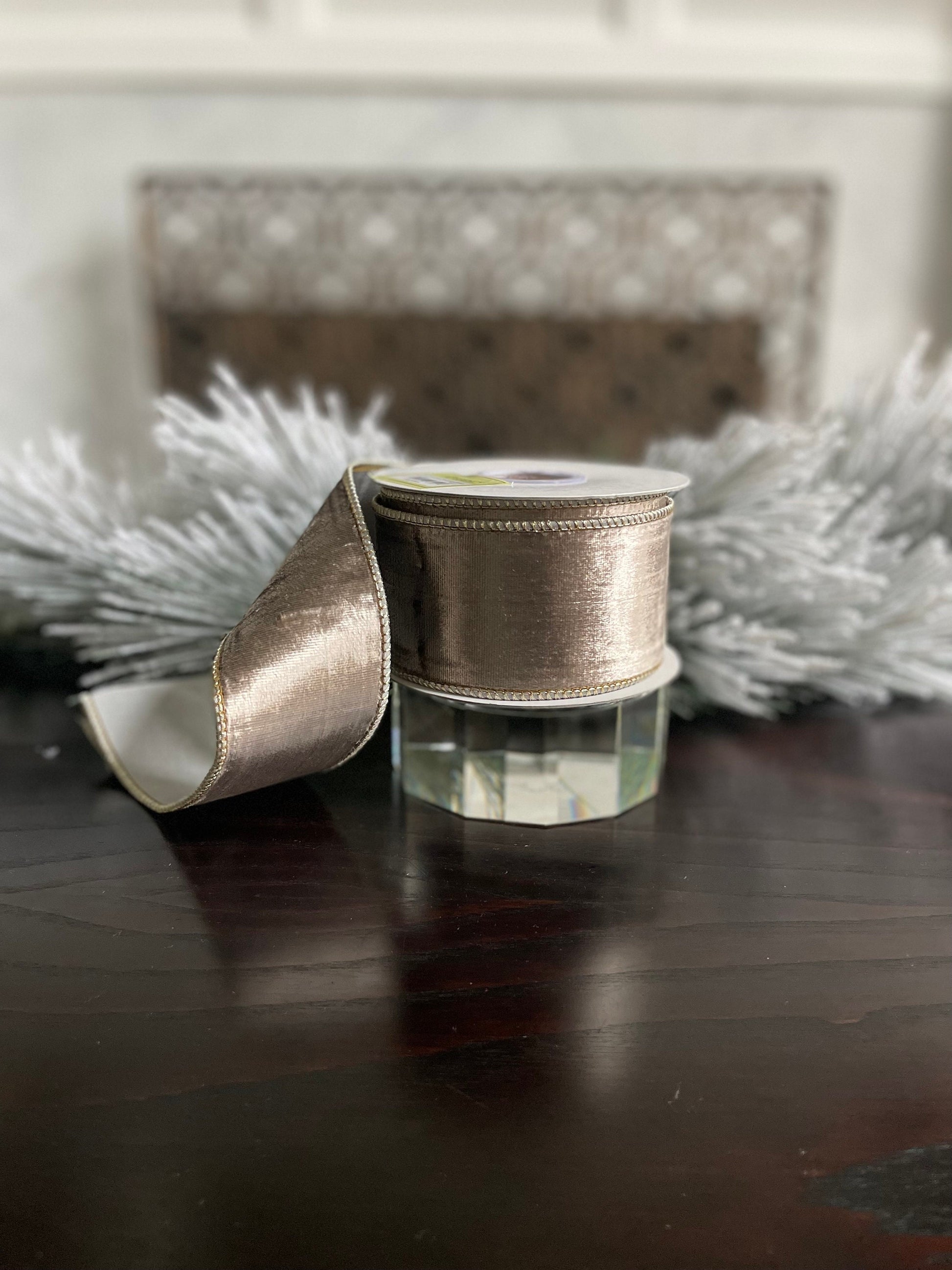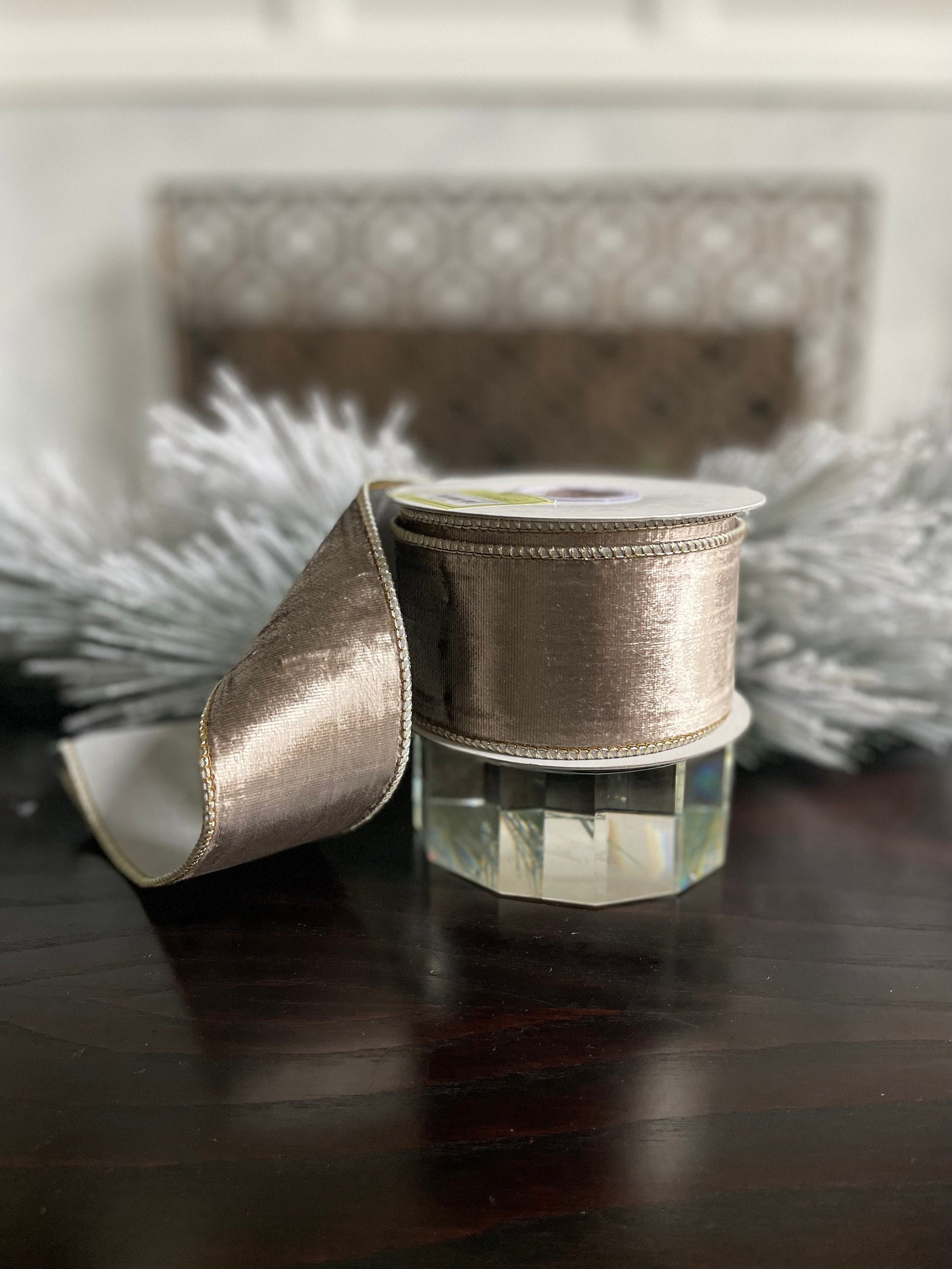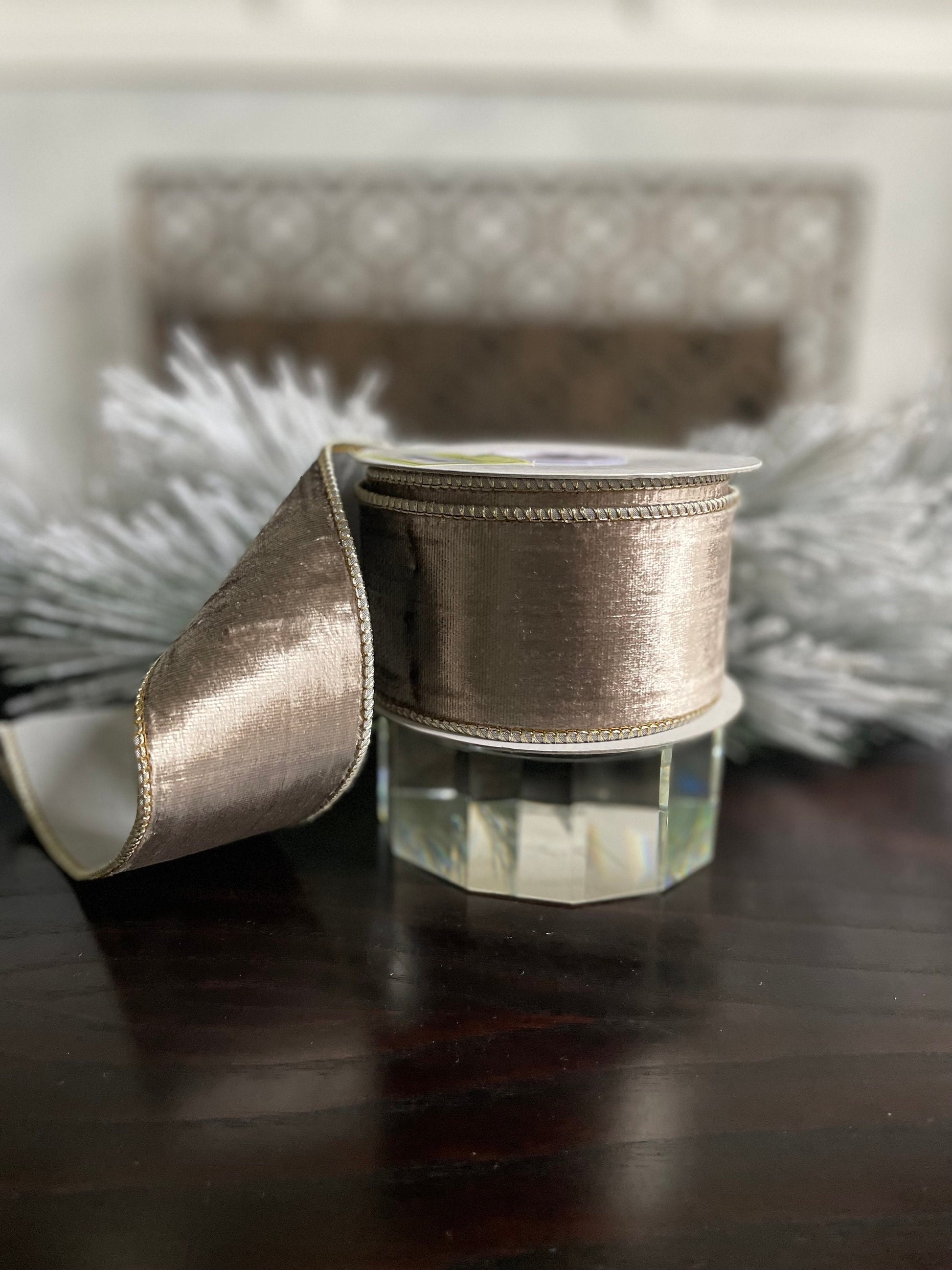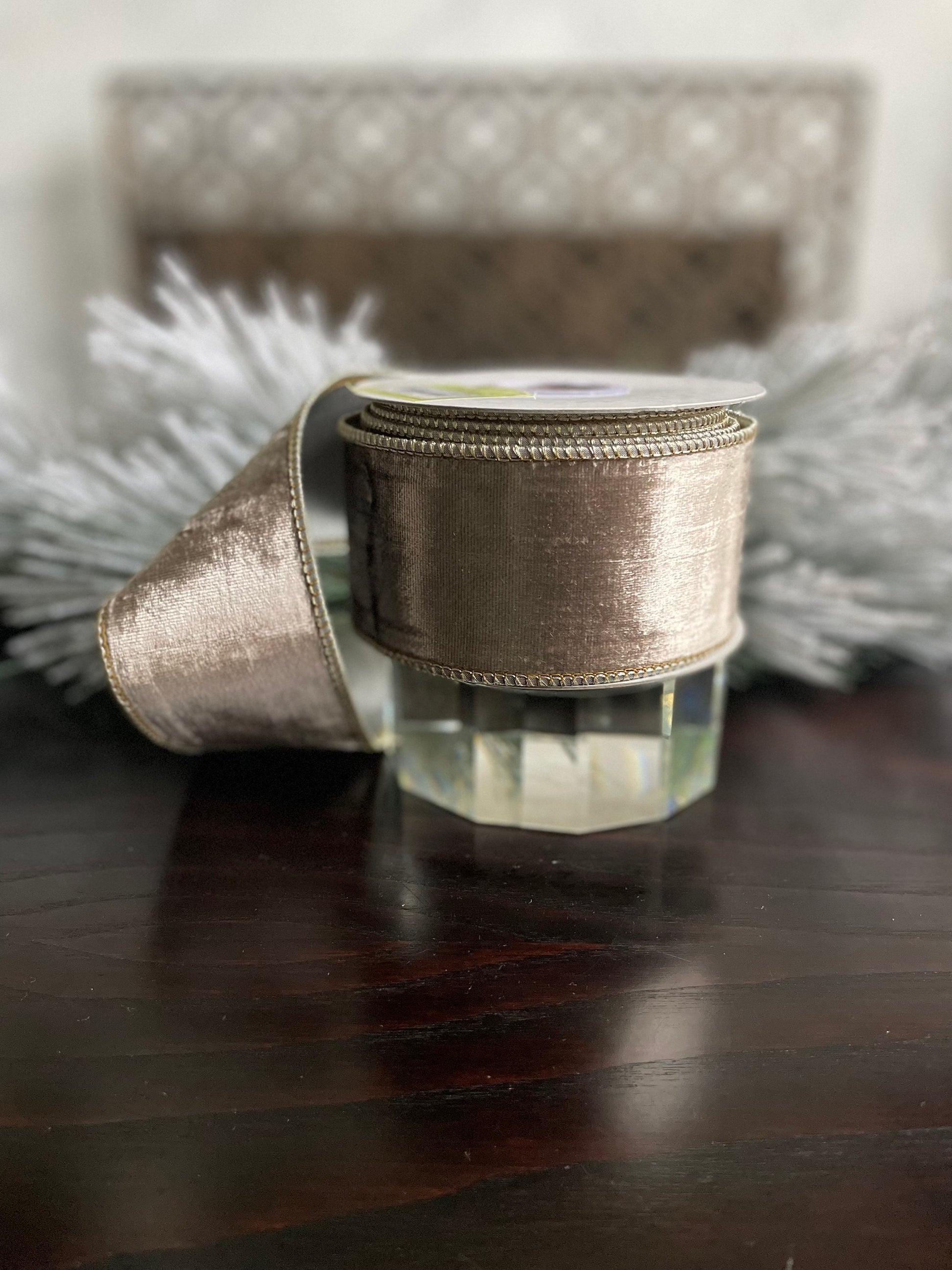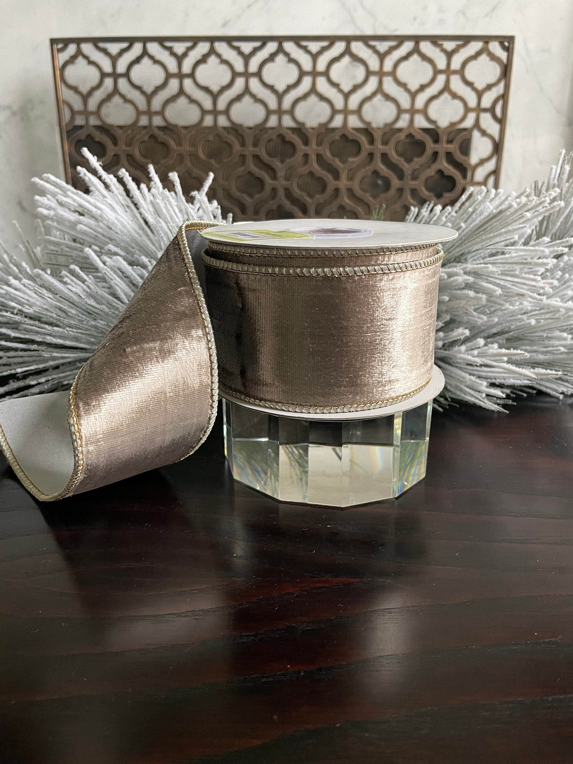 2.5” x 10 yds. Designer platinum smooth velvet and taffeta back ribbon. Wired. Regency.