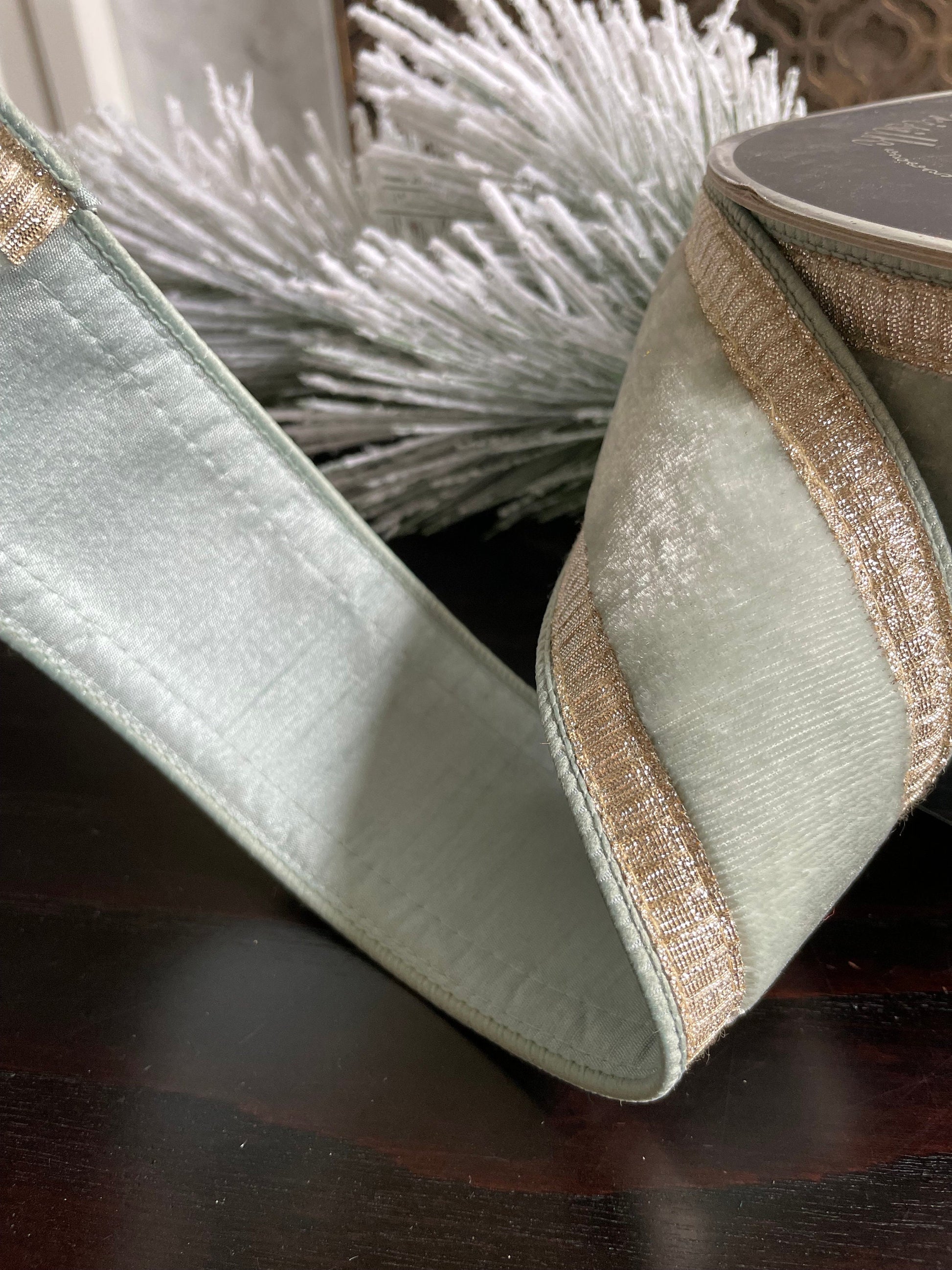 2.5” x 10 yds. Designer pleated borders velvet light blue- platinum ribbon. Wired. Farrisilk.