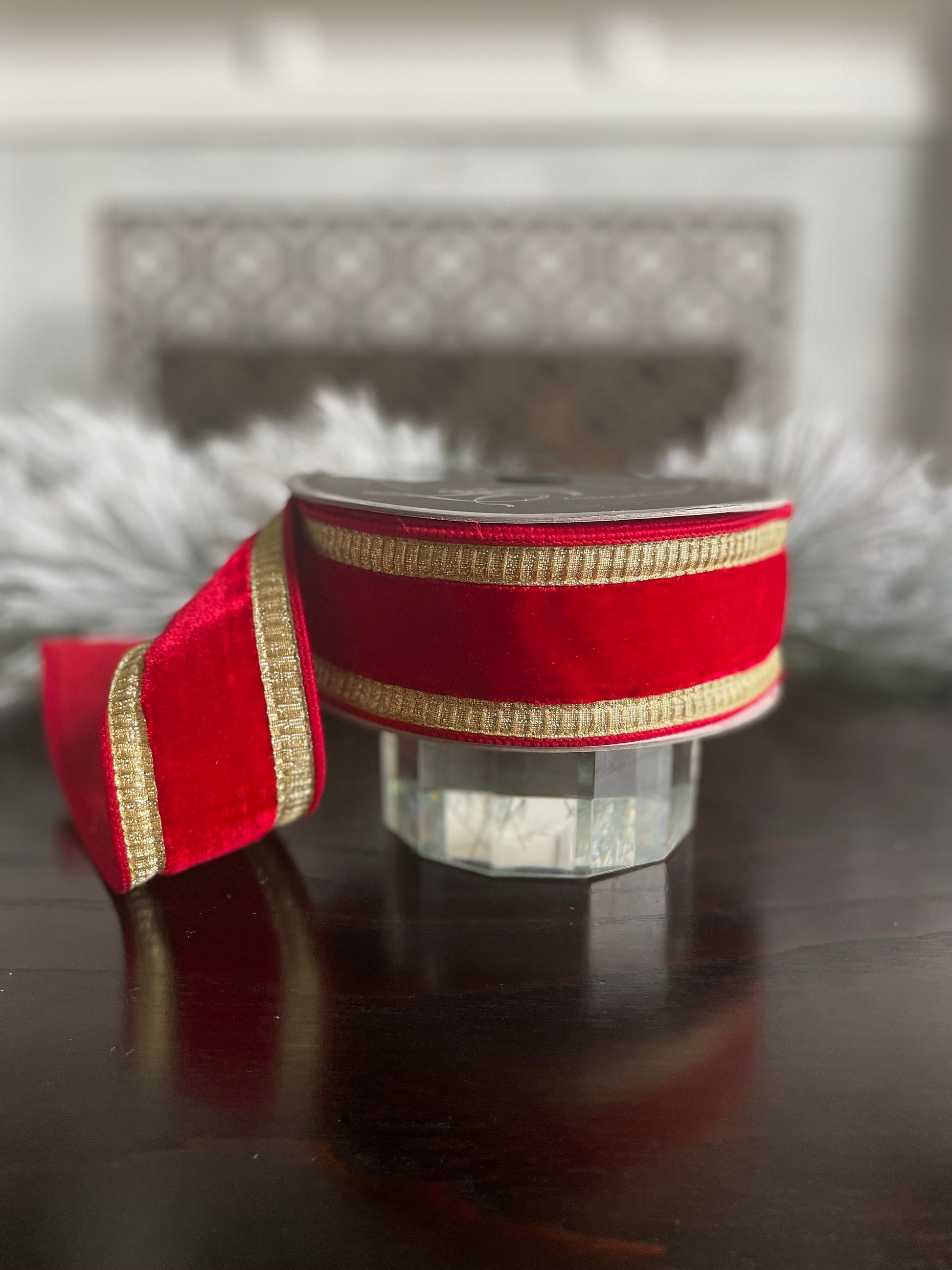 2.5” x 10 yds. Designer pleated borders velvet red and gold ribbon. Wired. Farrisilk.