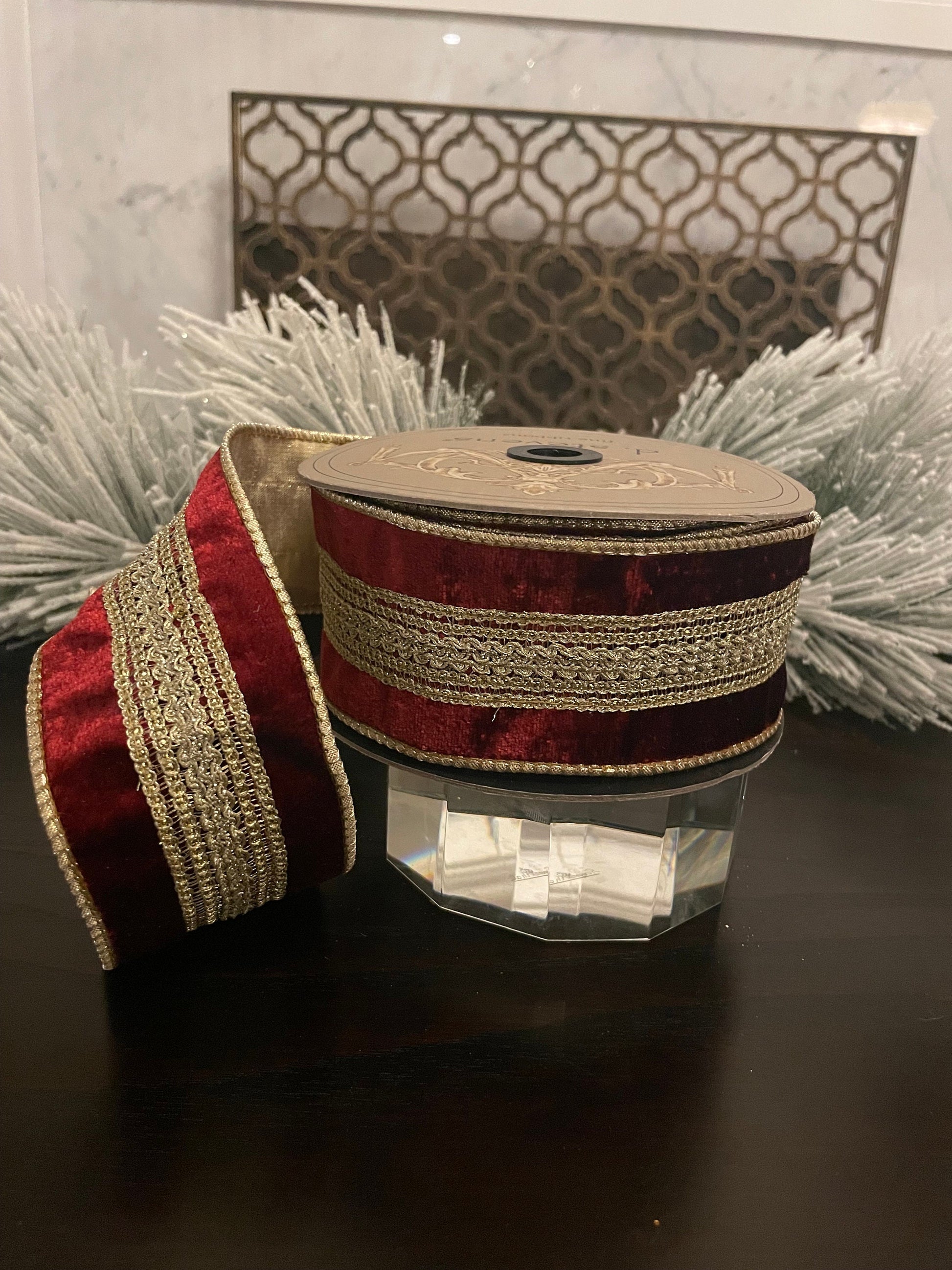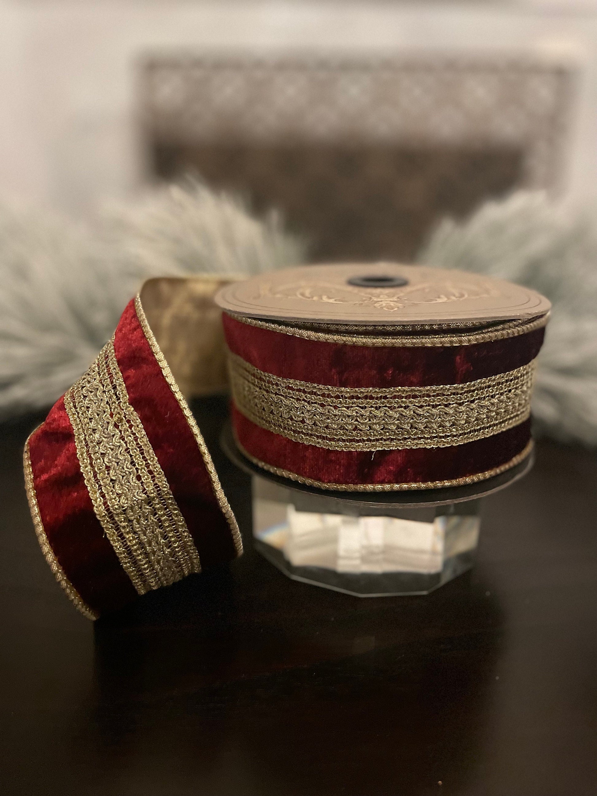 2.5” x 10 yds Designer ribbon velvet verona burgundy with gold trim . Wired. D. Stevens.