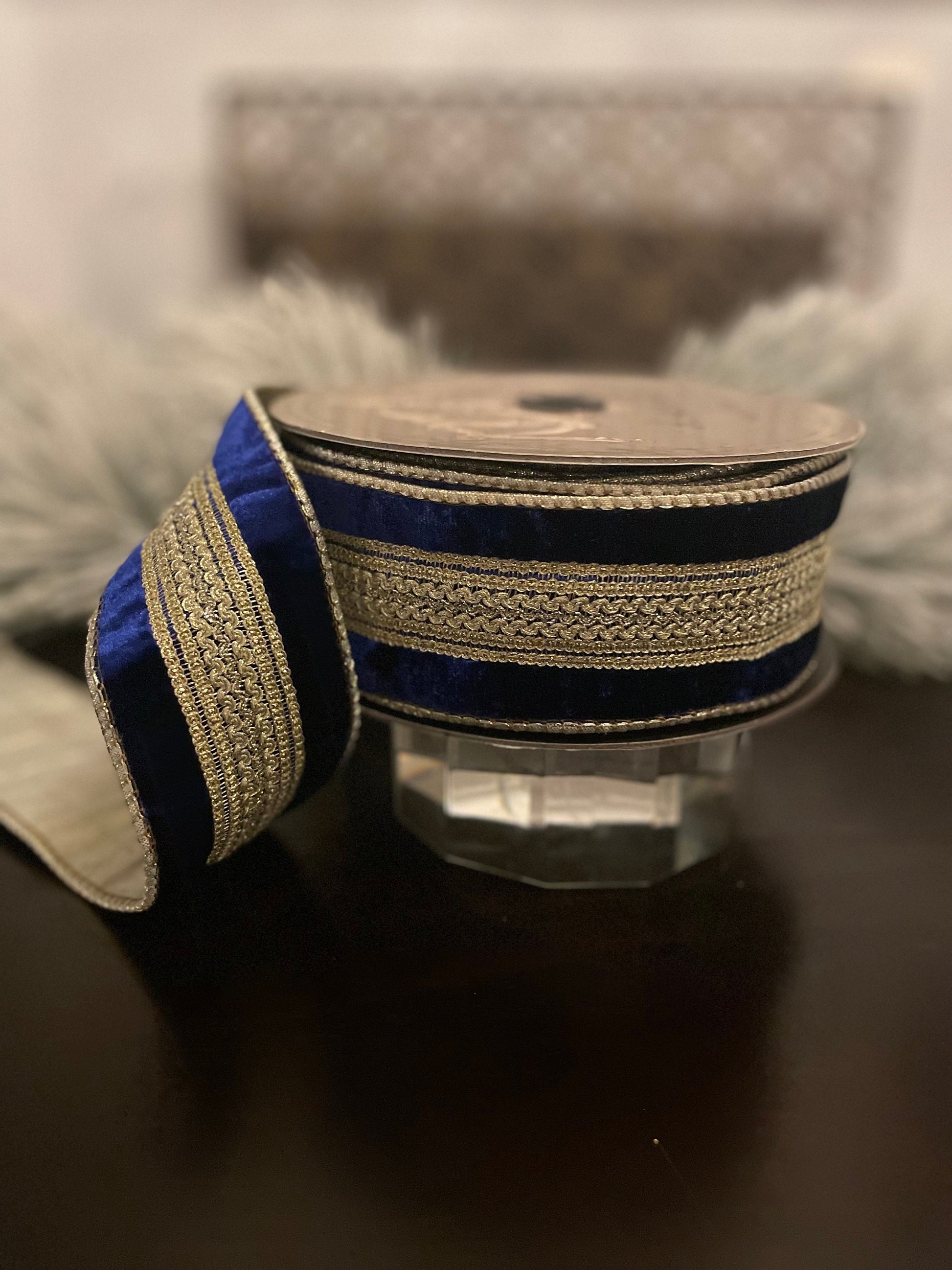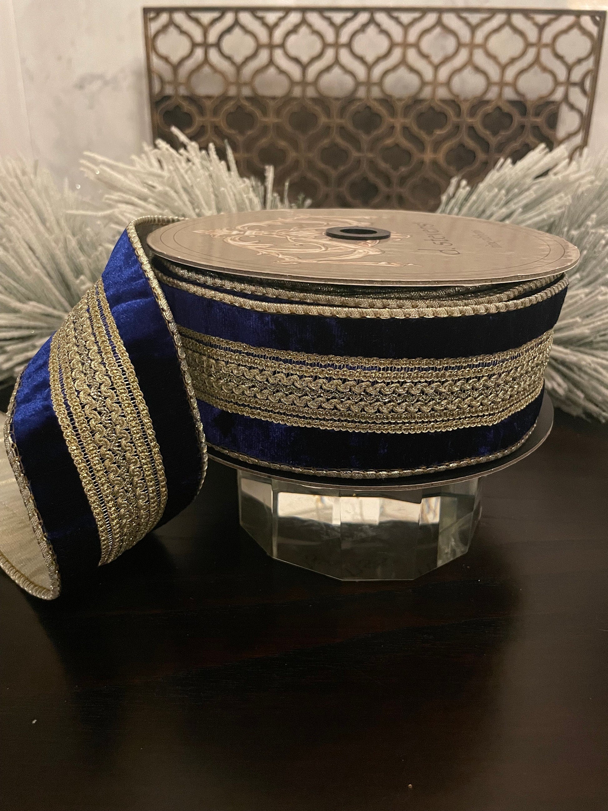 2.5” x 10 yds Designer ribbon velvet verona cobalt with gold trim . Wired. D. Stevens.