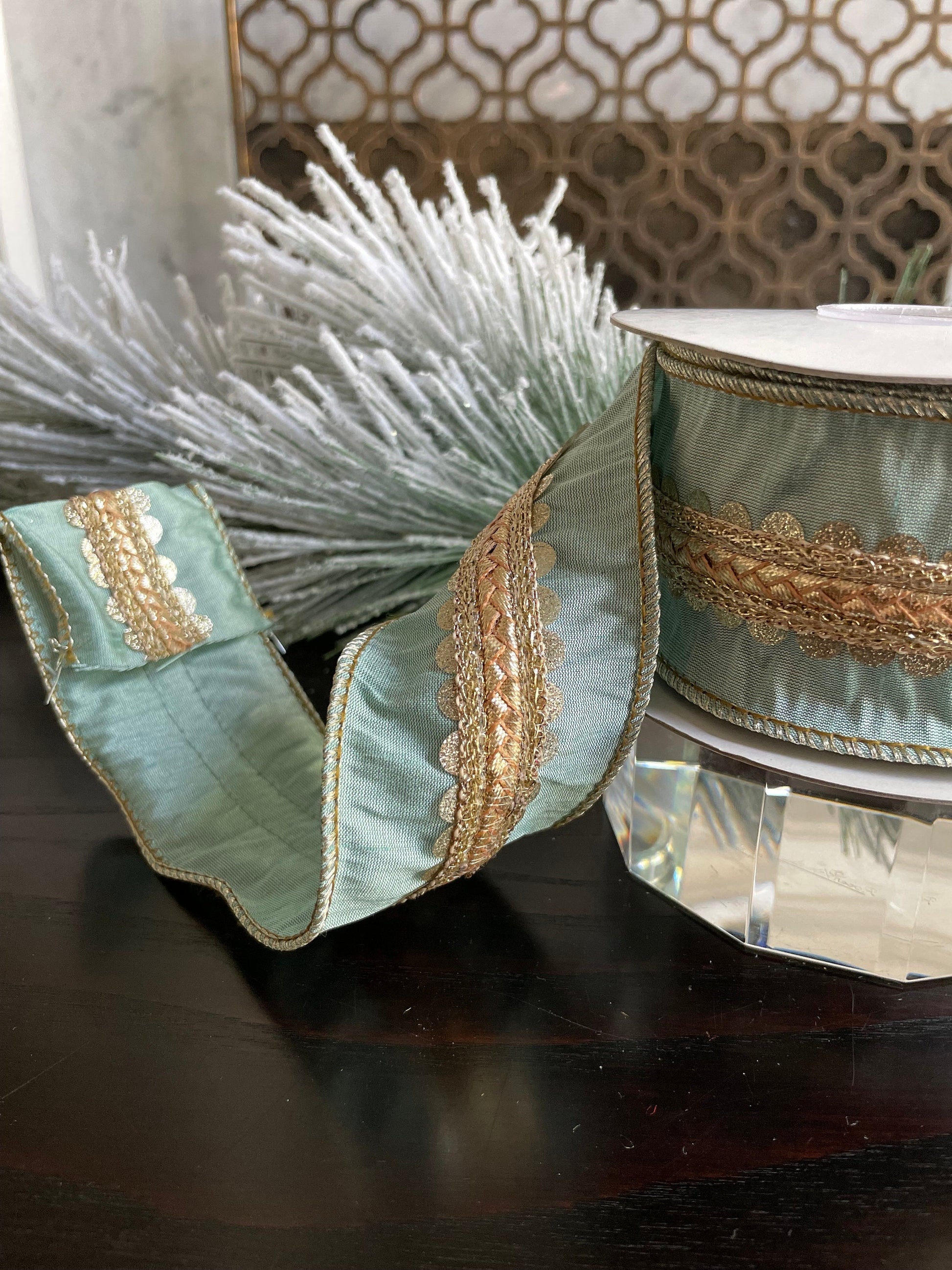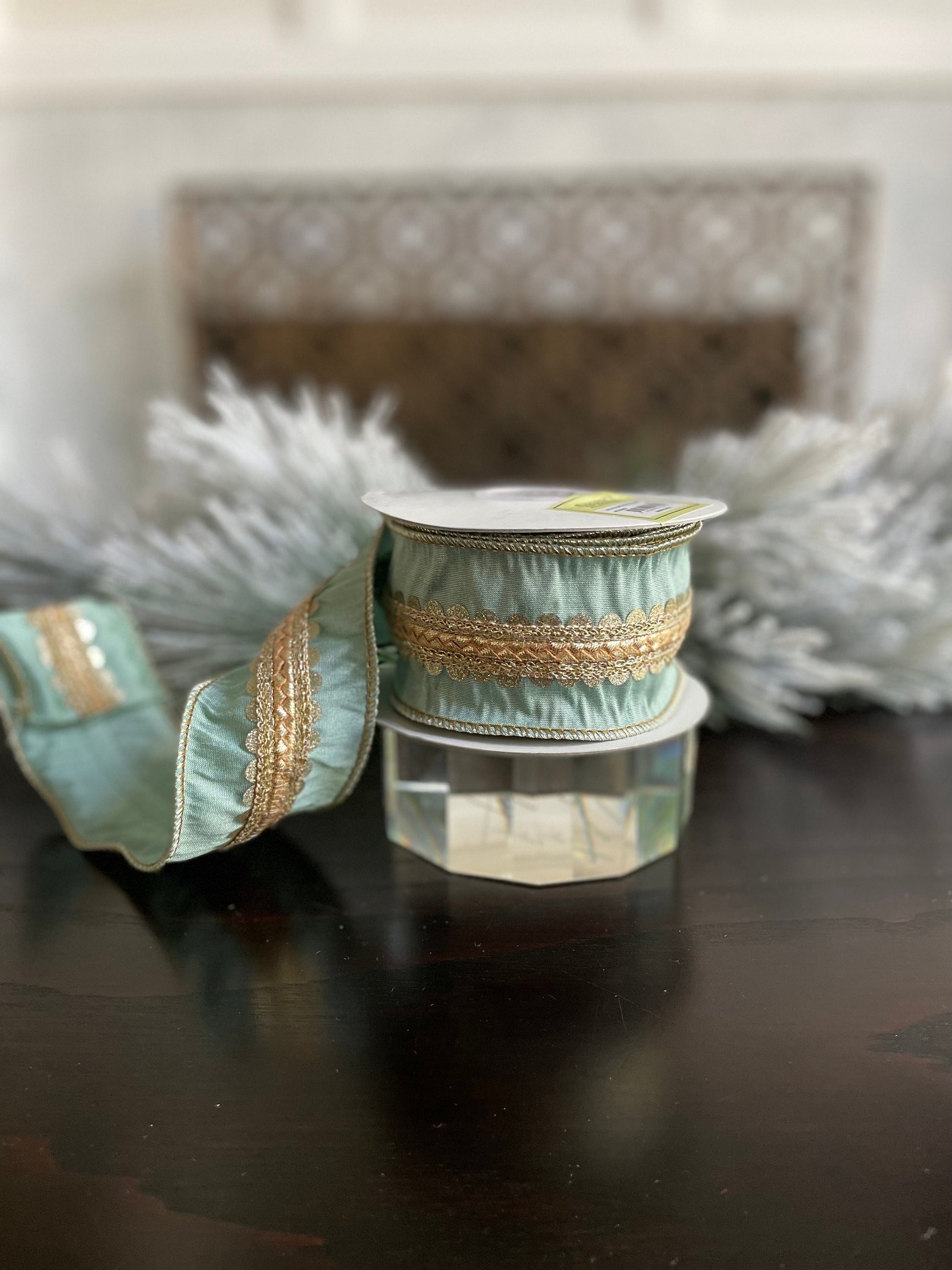 2.5” x 5 yds Designer aqua and light gold scalloped braid dupion ribbon. Wired. Regency.