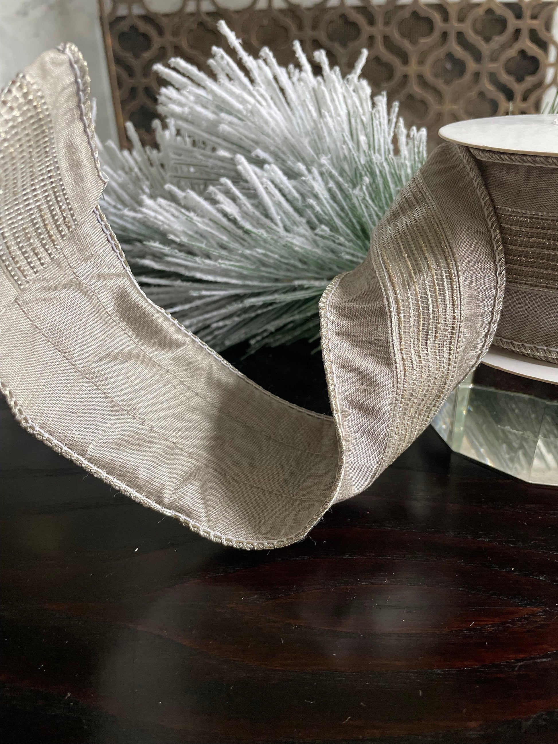 2.5” x 5 yds Designer platinum and light gold stripe trim dupion ribbon. Wired. Regency.