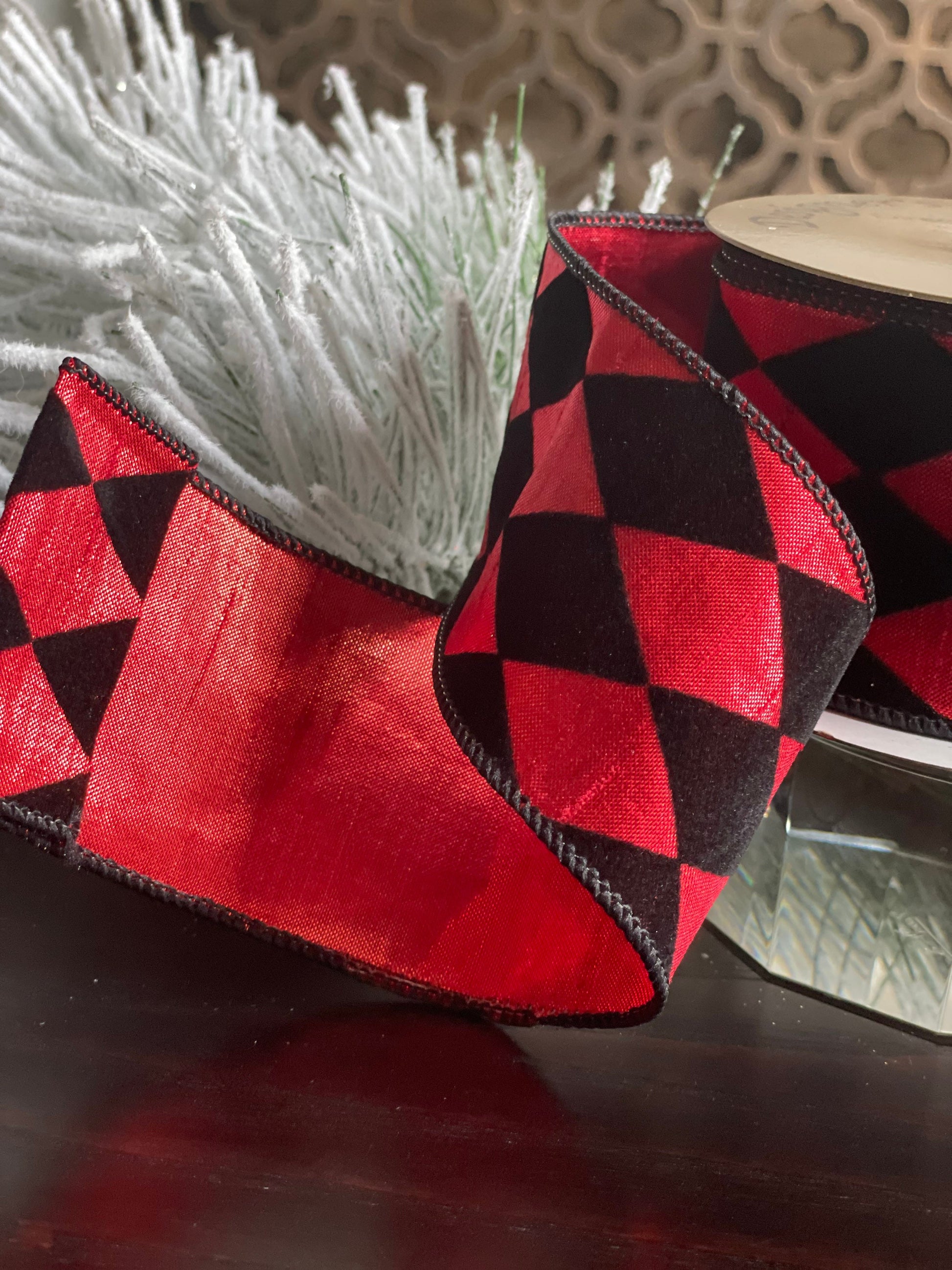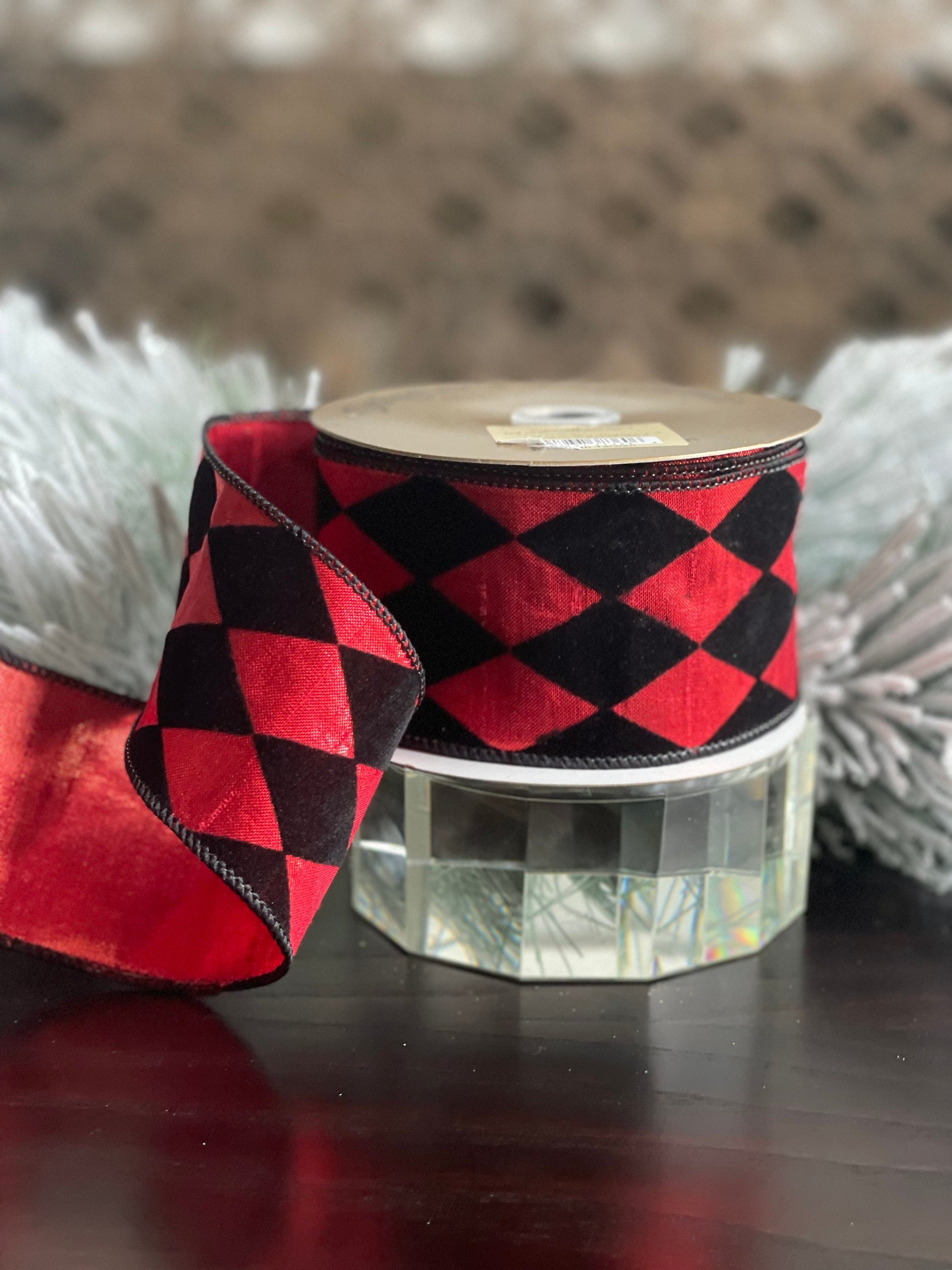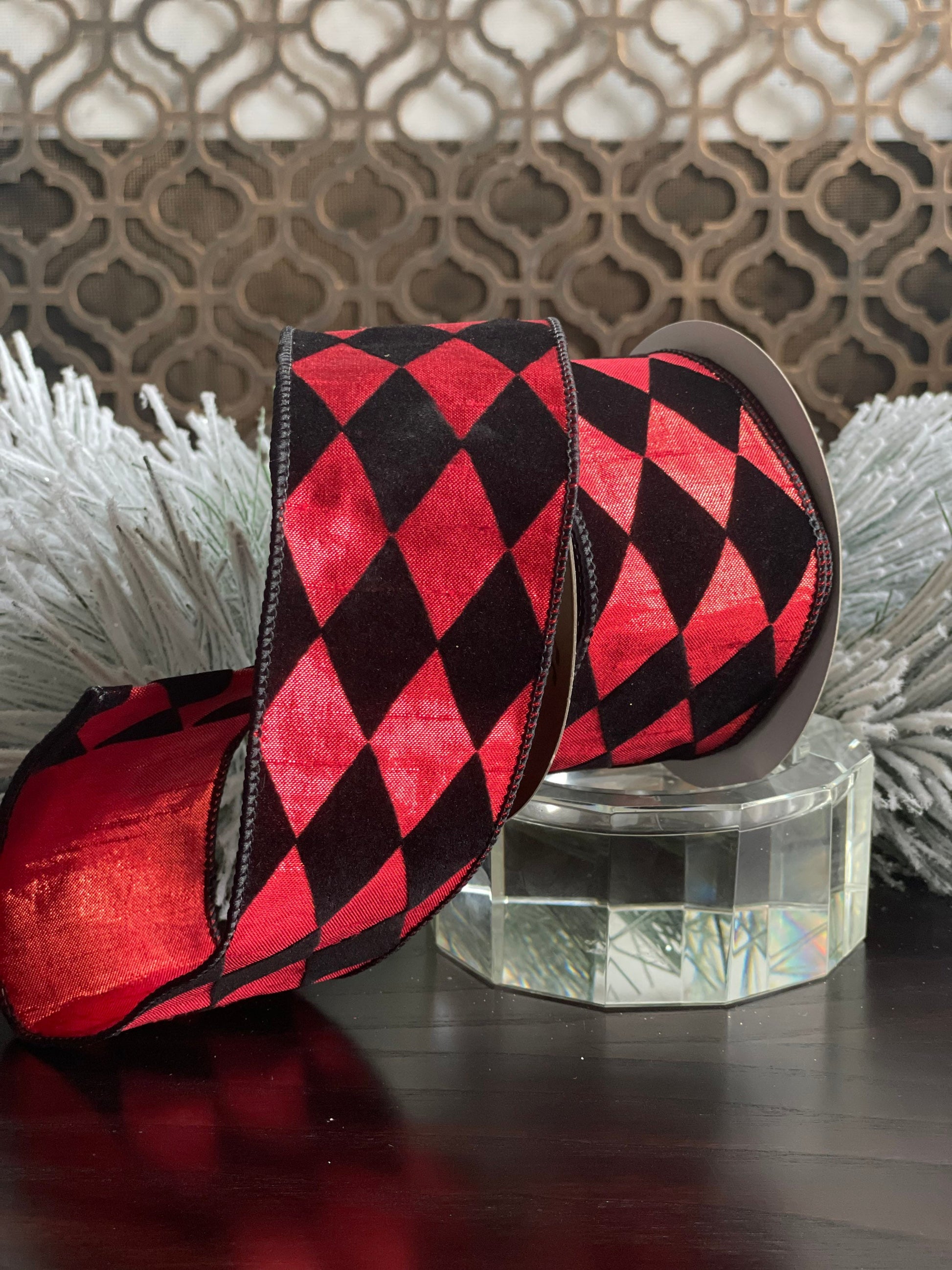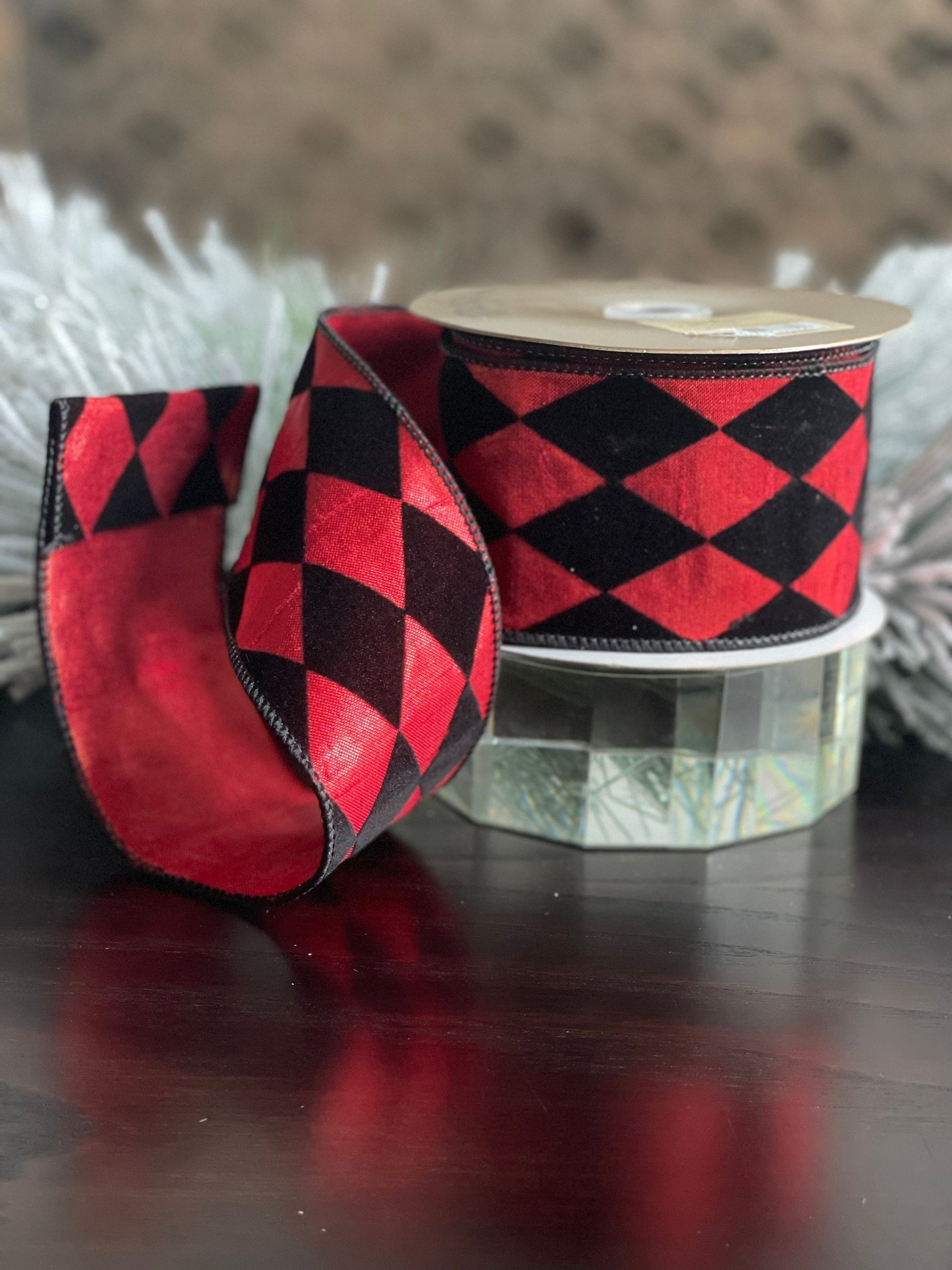 2.5x10" yds. diamond ribbon red and black. Black velvet diamonds.