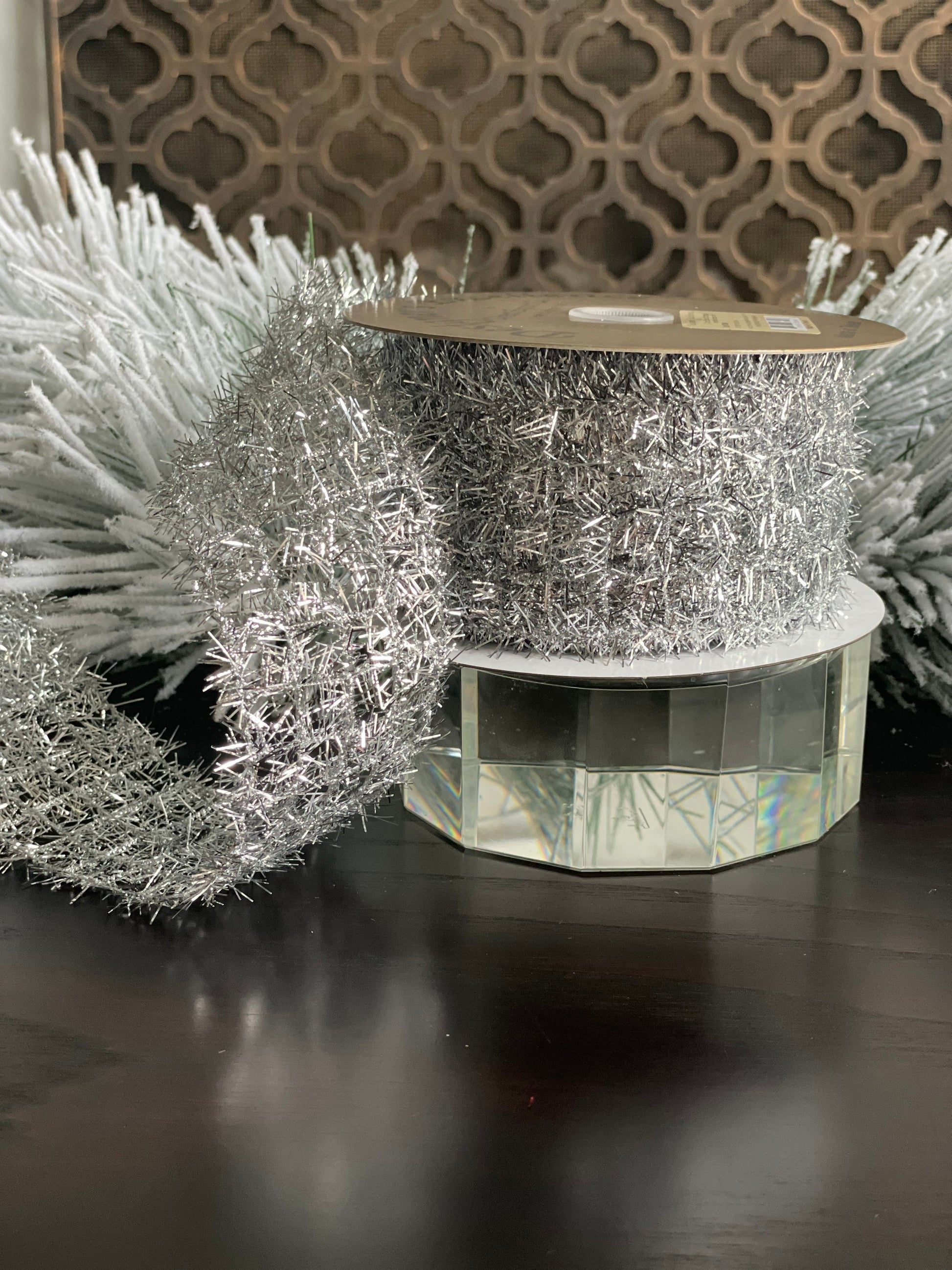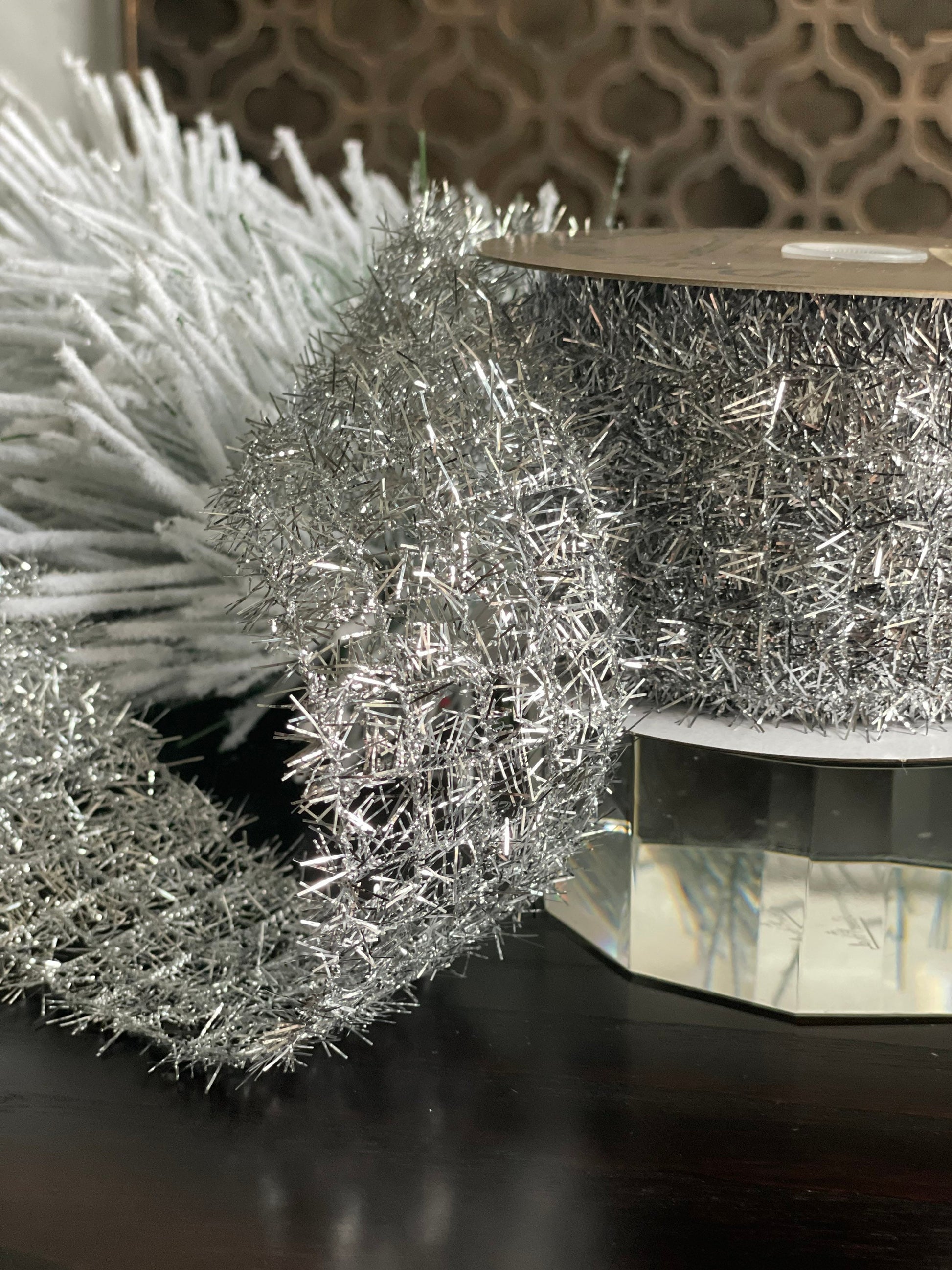 2.5X10" yds. Silver tinsel ribbon. Wired