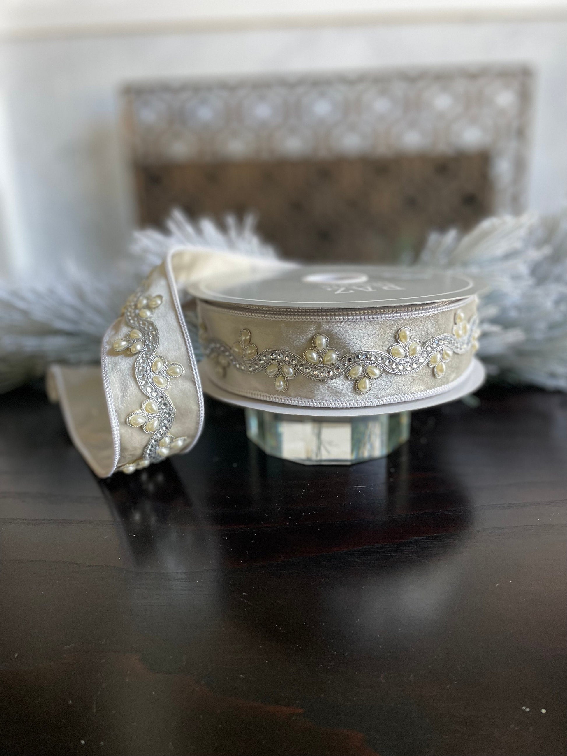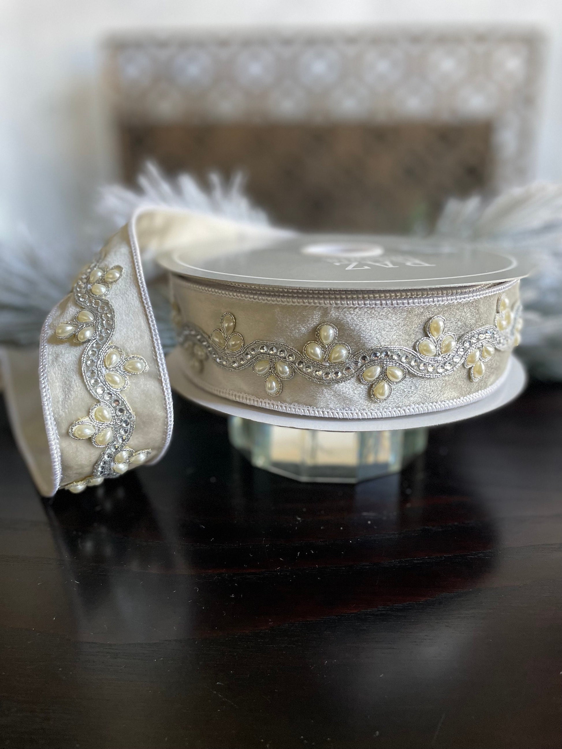 2” x 10 yds. Designer jeweled ivory velvet wired ribbon. Raz.
