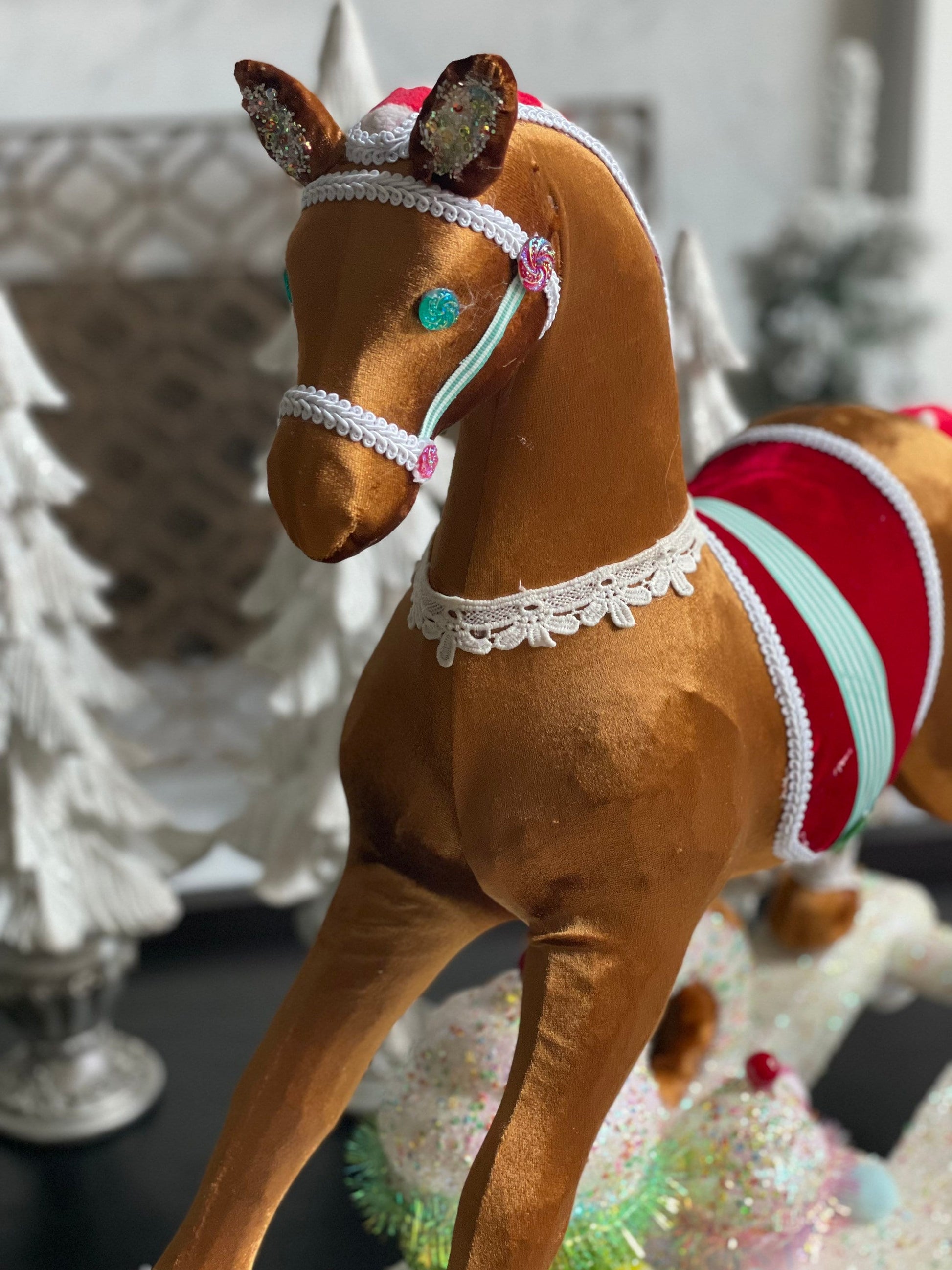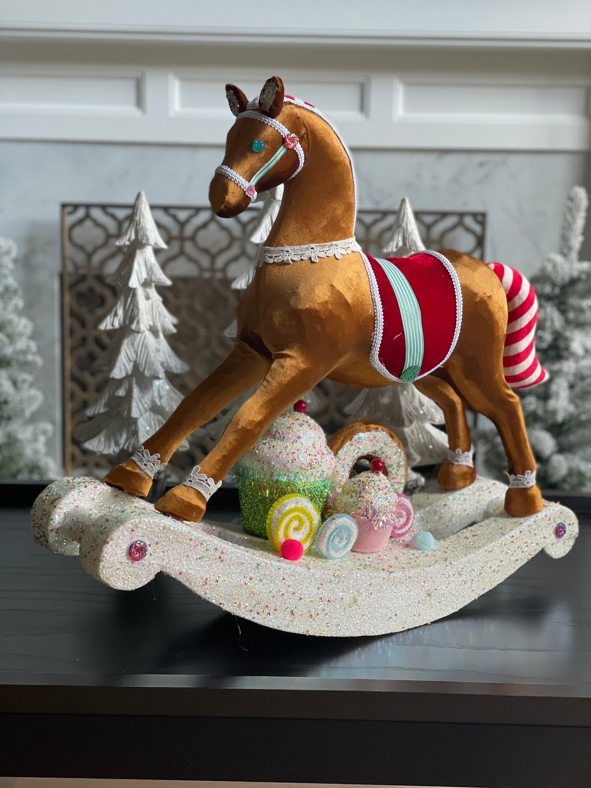 23”Hx 27” W. Rocking horse with cupcakes and donuts. One rocking horse. Christmas multi color. Lightweight.