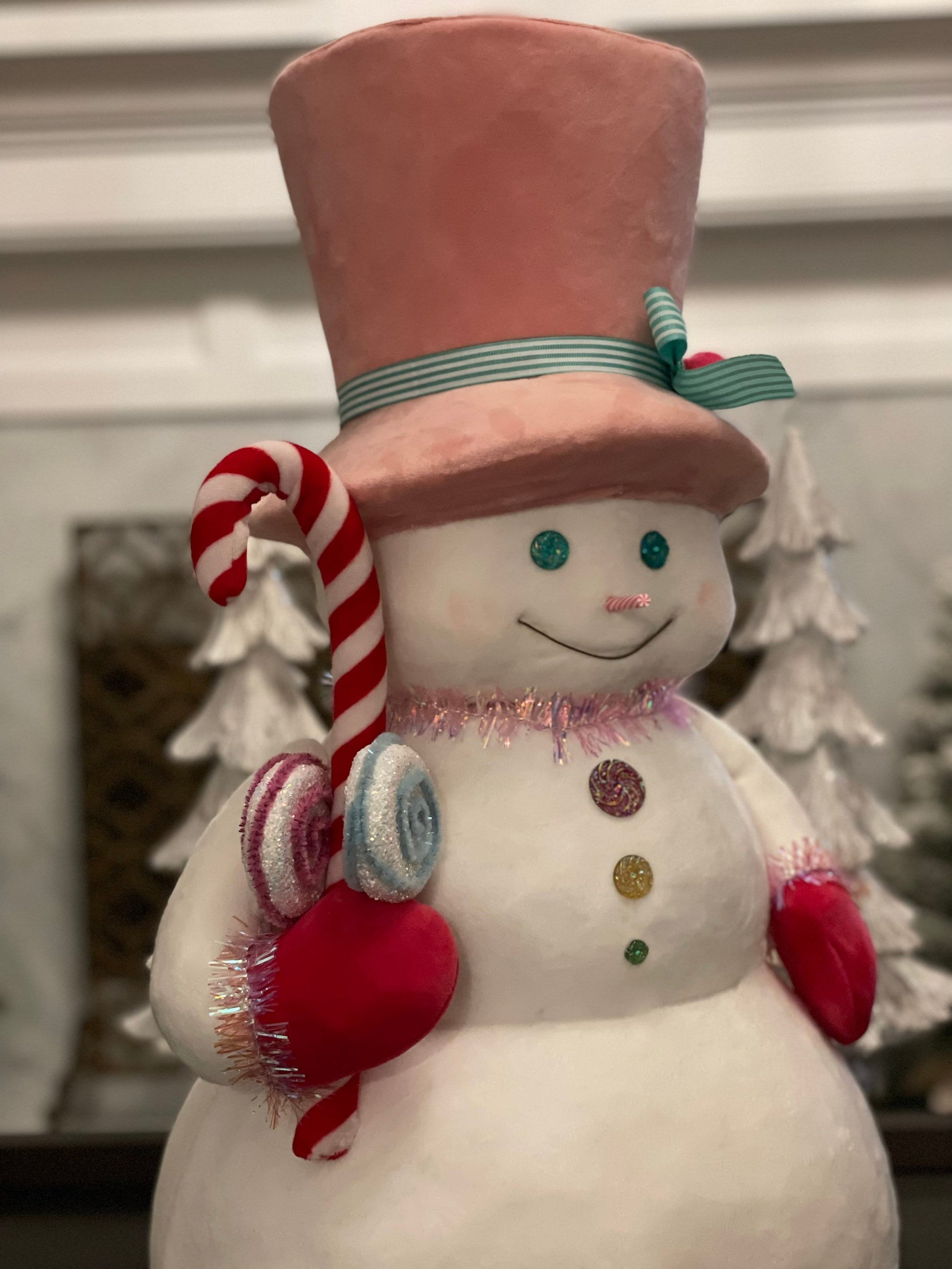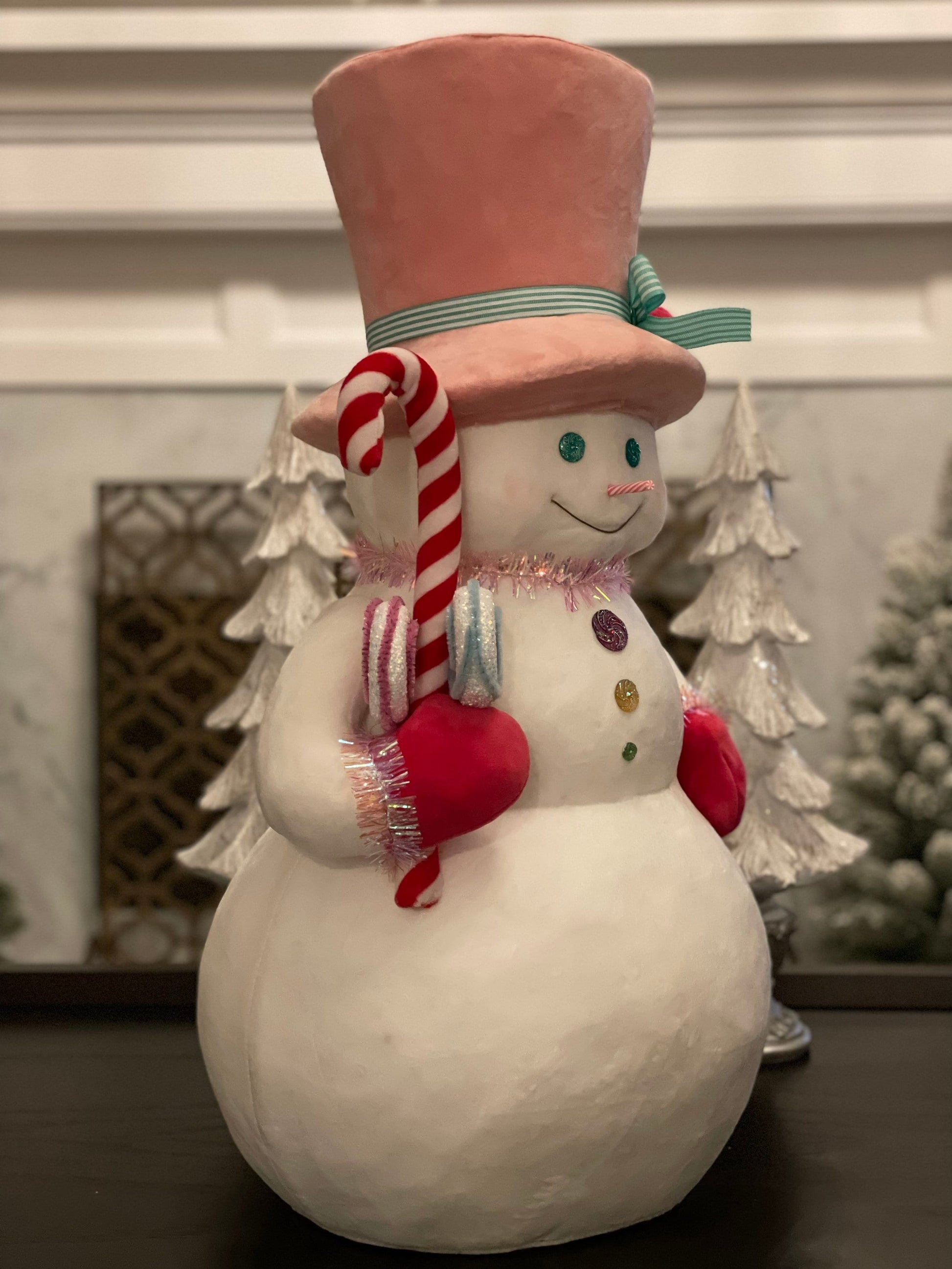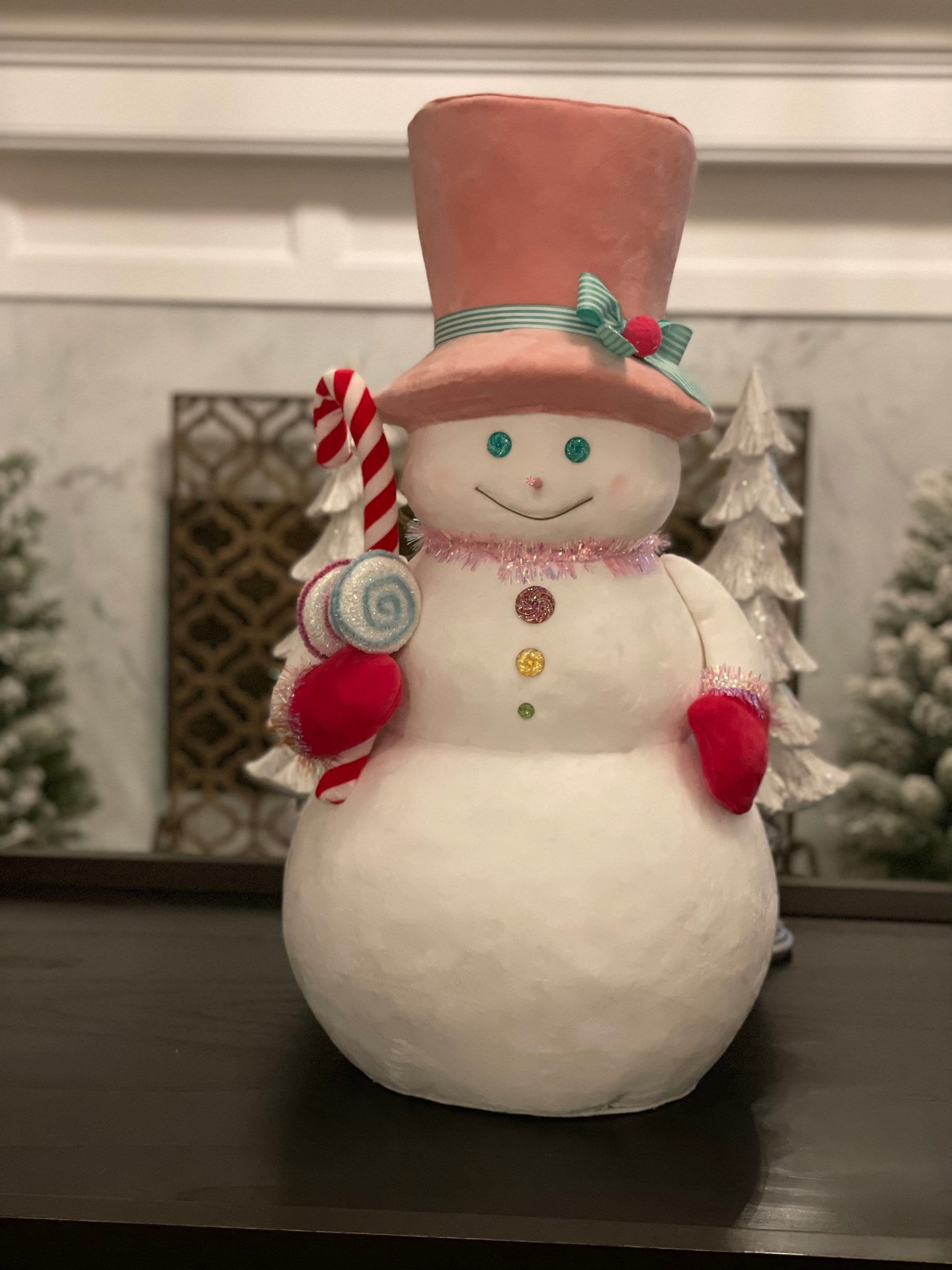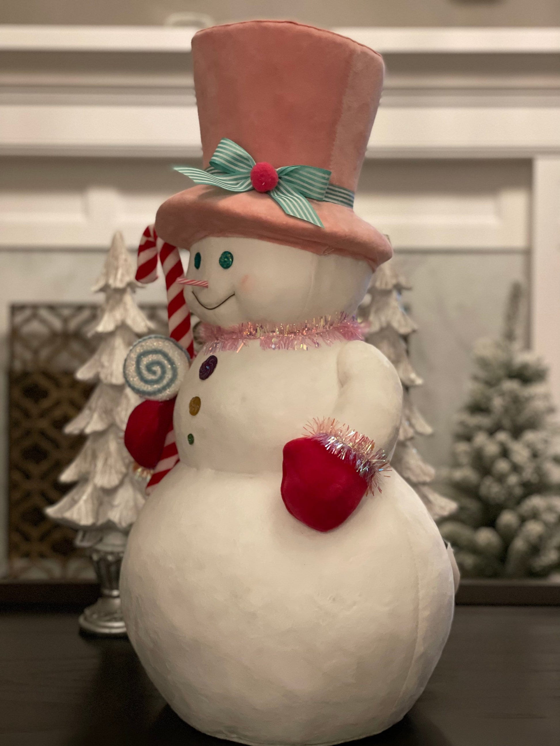 24”h x 13.4” w Snowman with pink hat holding a candy cane. Christmas. Ornament. Tabletop. Display.
