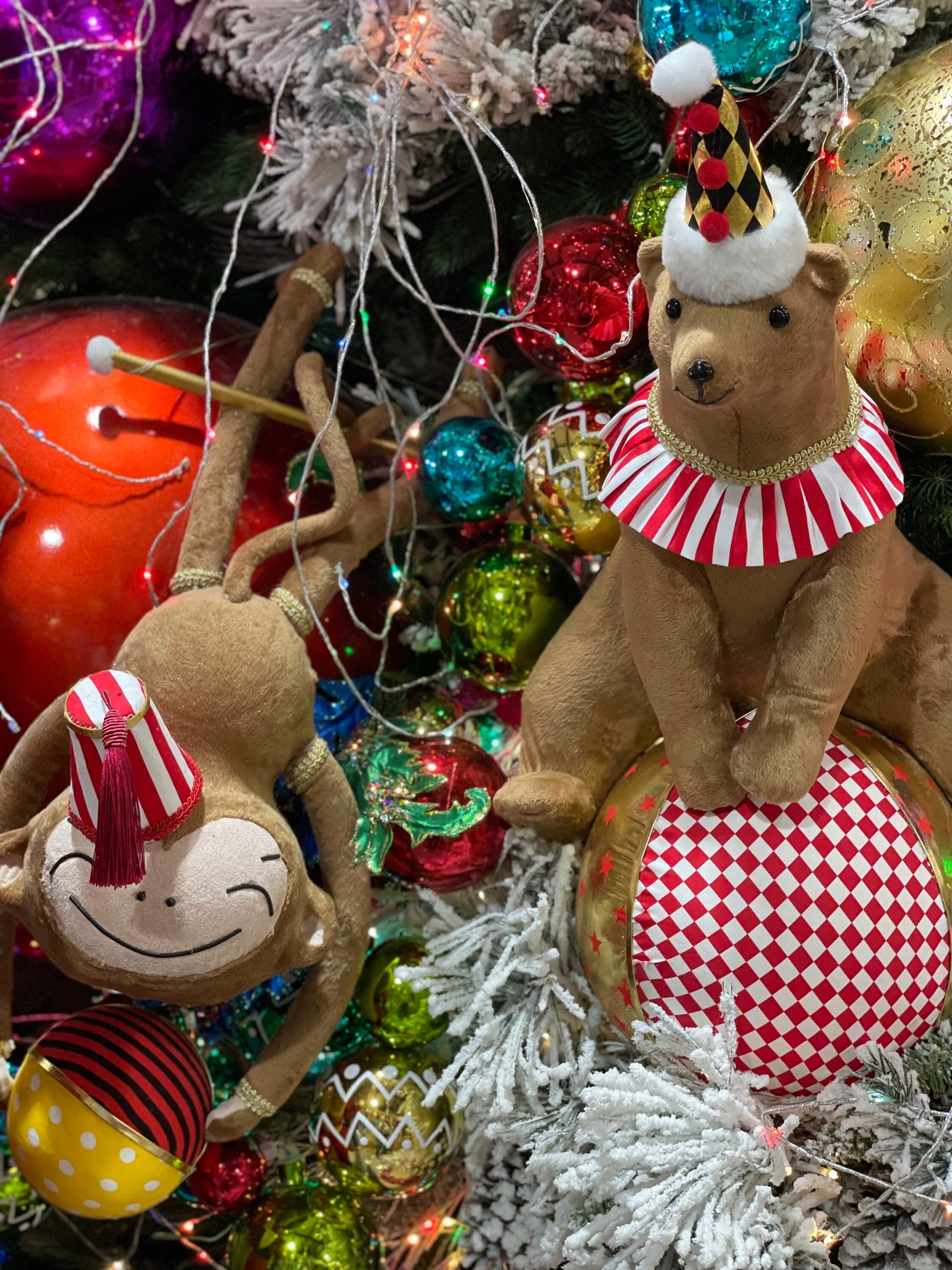 24 inch Monkey hanging with ball ornament. Lace embellishments. Circus. Christmas.