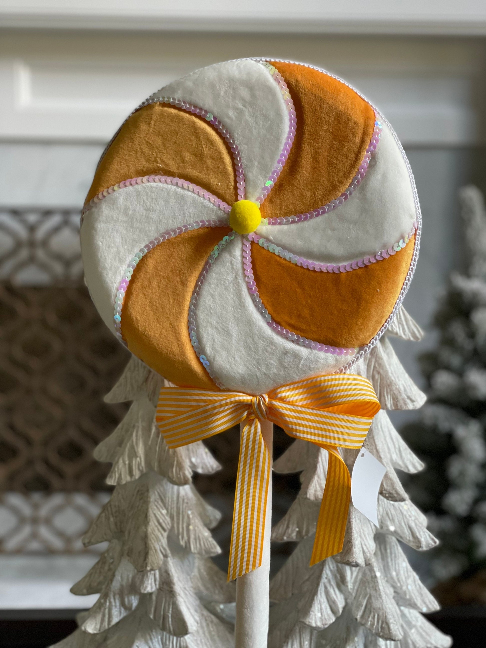 Lollipop velvet 25 inch tall and 10” diameter. Yellow and white. Very light weight. It is a beautiful ornament. You can use it for a Christmas candy theme in your tree, wreath, garland or anywhere you like.
