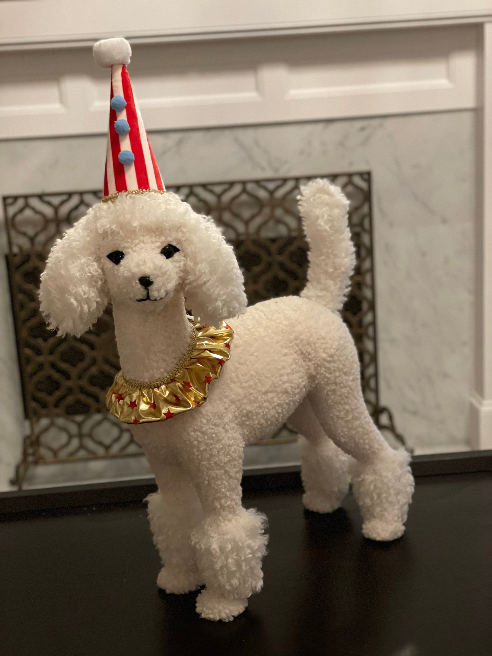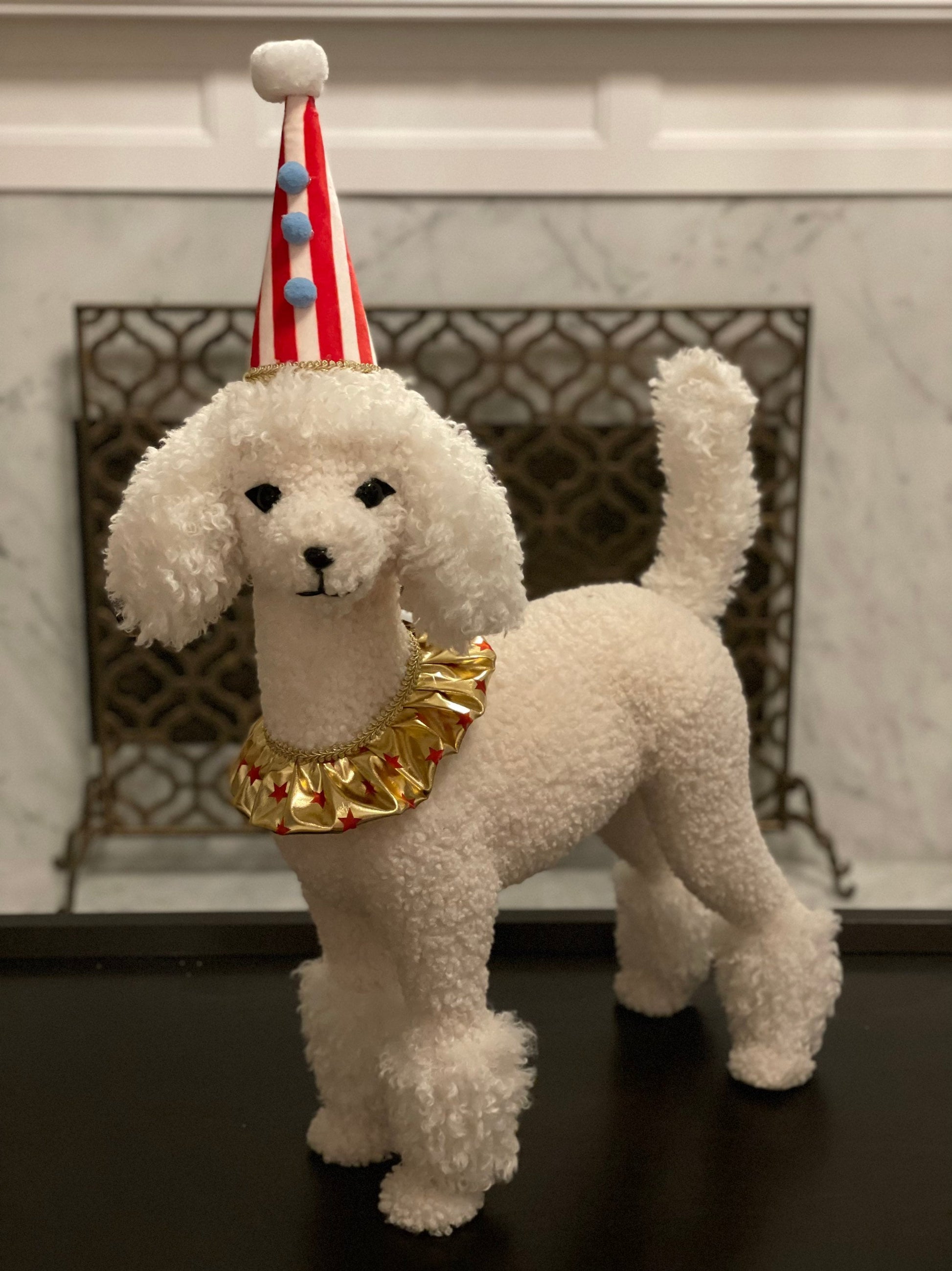31 inch Circus poodle ornament/tabletop. Lace and party hat embellishments. Circus. Christmas. Animal party. Lightweight. Perfect for a circus birthday party. Christmas ornament. Kids bedroom or playroom decor. Perfect present for dog lover. Poodle lovers.