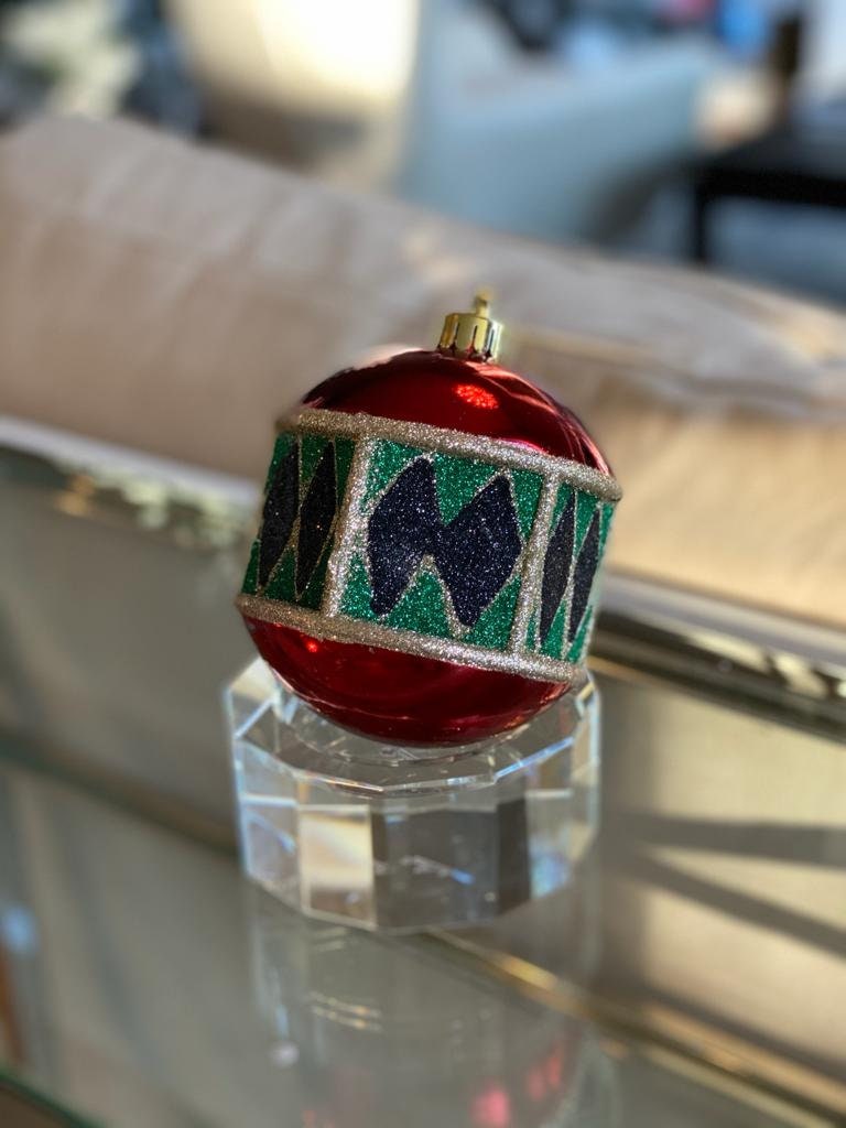 4.7” vp harlequin ball ornament 3 pcs. red,green,gold,black