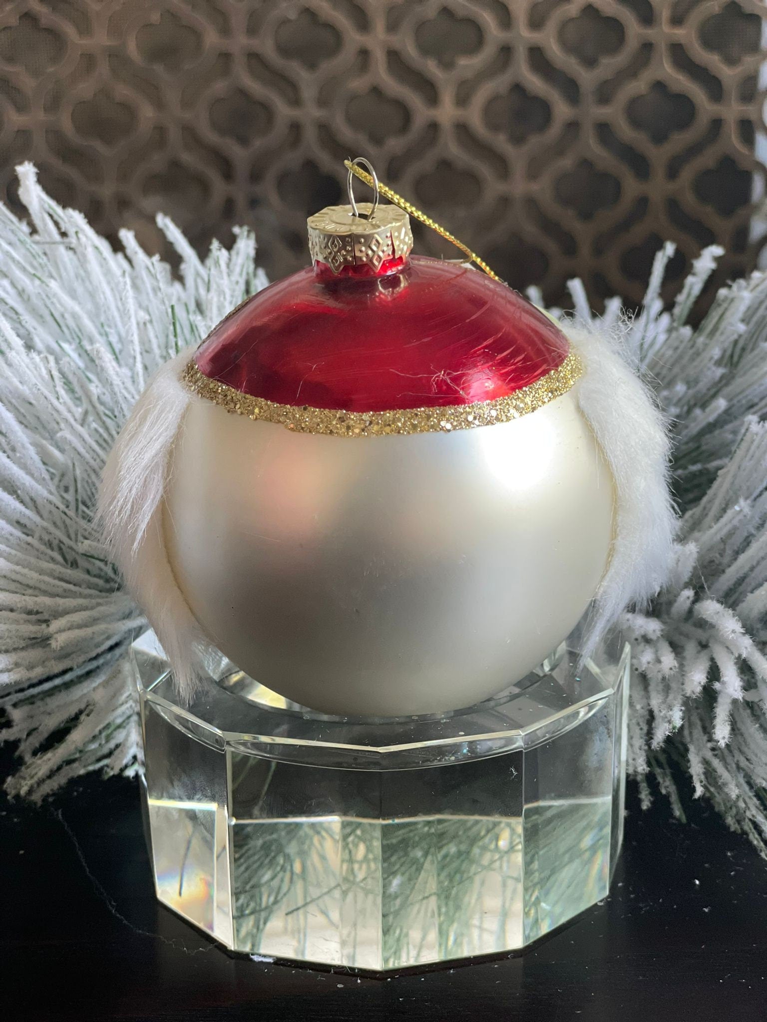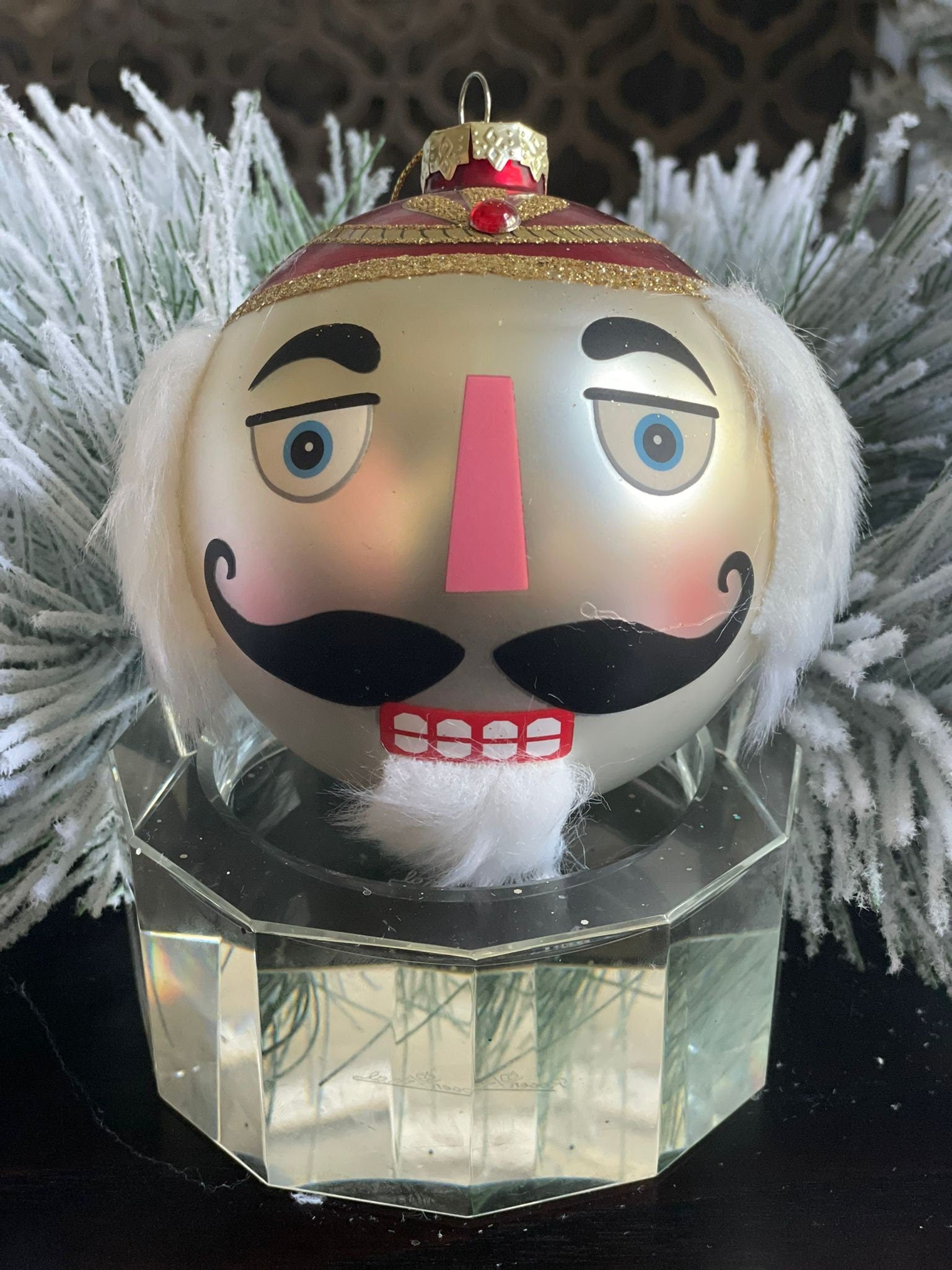4" Glass nutcracker ball ornament multi.* He has a jewel in his front and fabric hair.