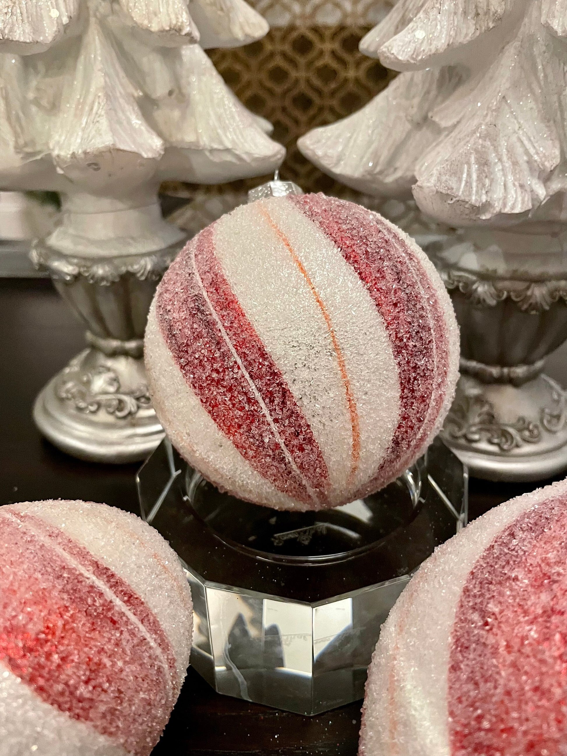 4” Peppermint stripe frosted glass ornaments set of 3. Ball, onion and finial. Perfect for your Christmas candy theme.