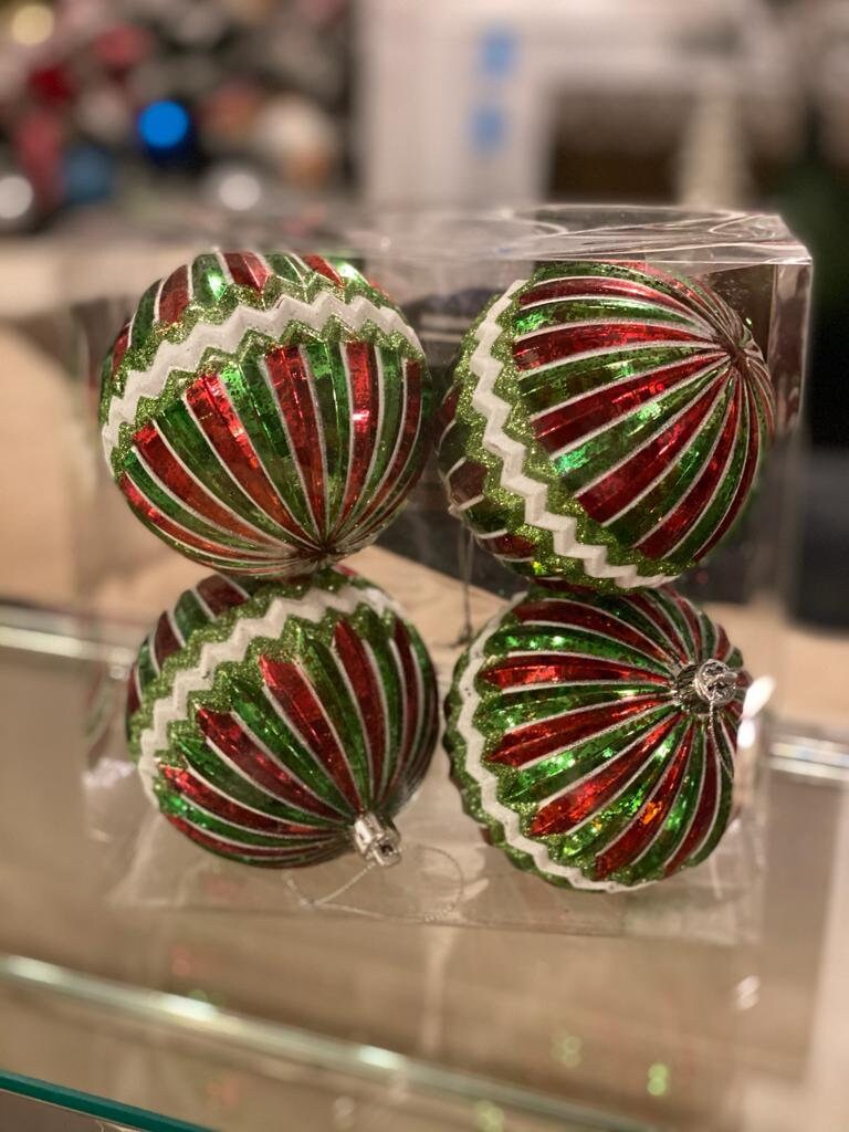 4” shatterproof Mercury ringed w/zigzag stripe ball candy set of 4 green, red and white