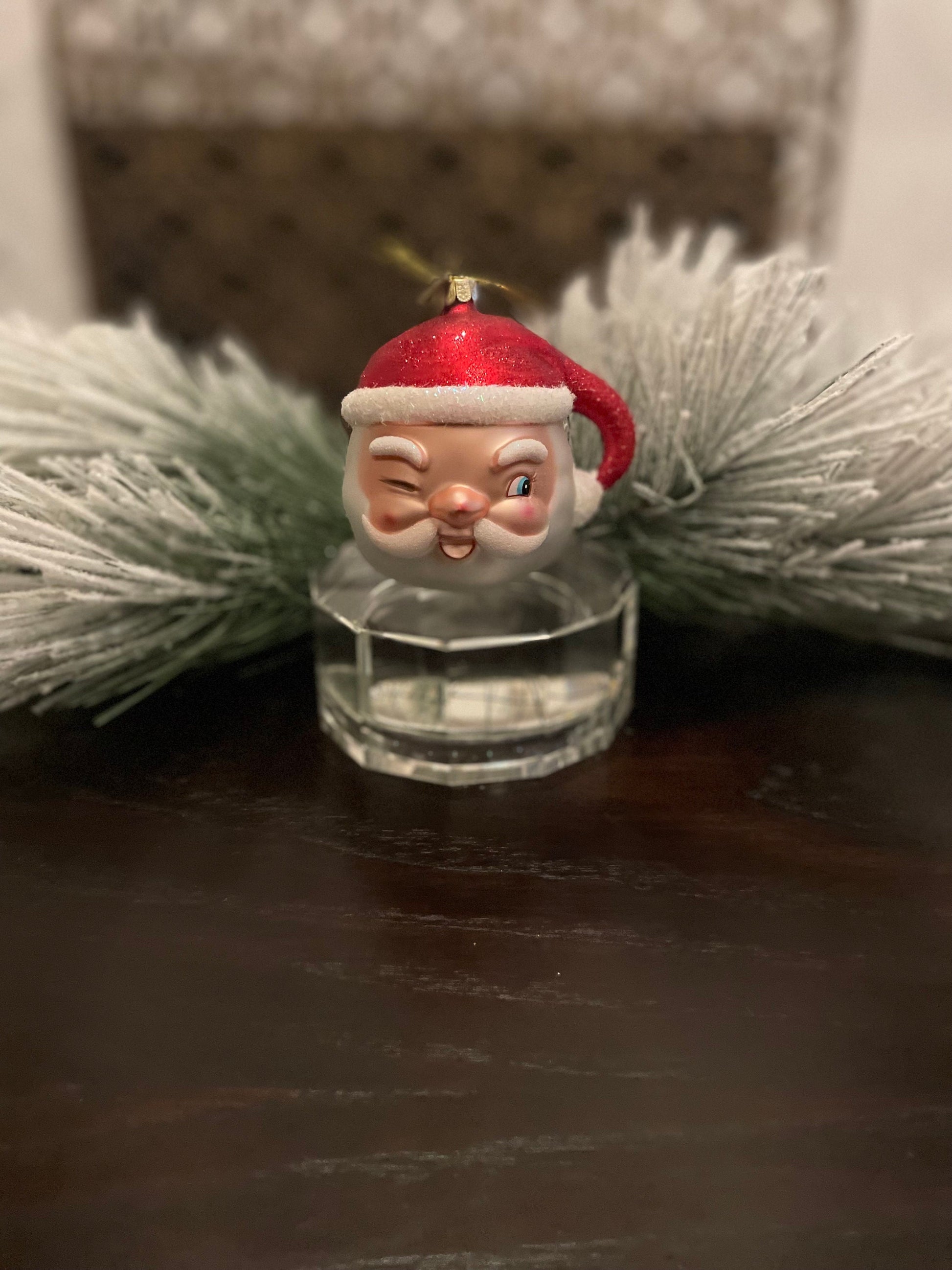 4" Winking Santa ornament. Glass.