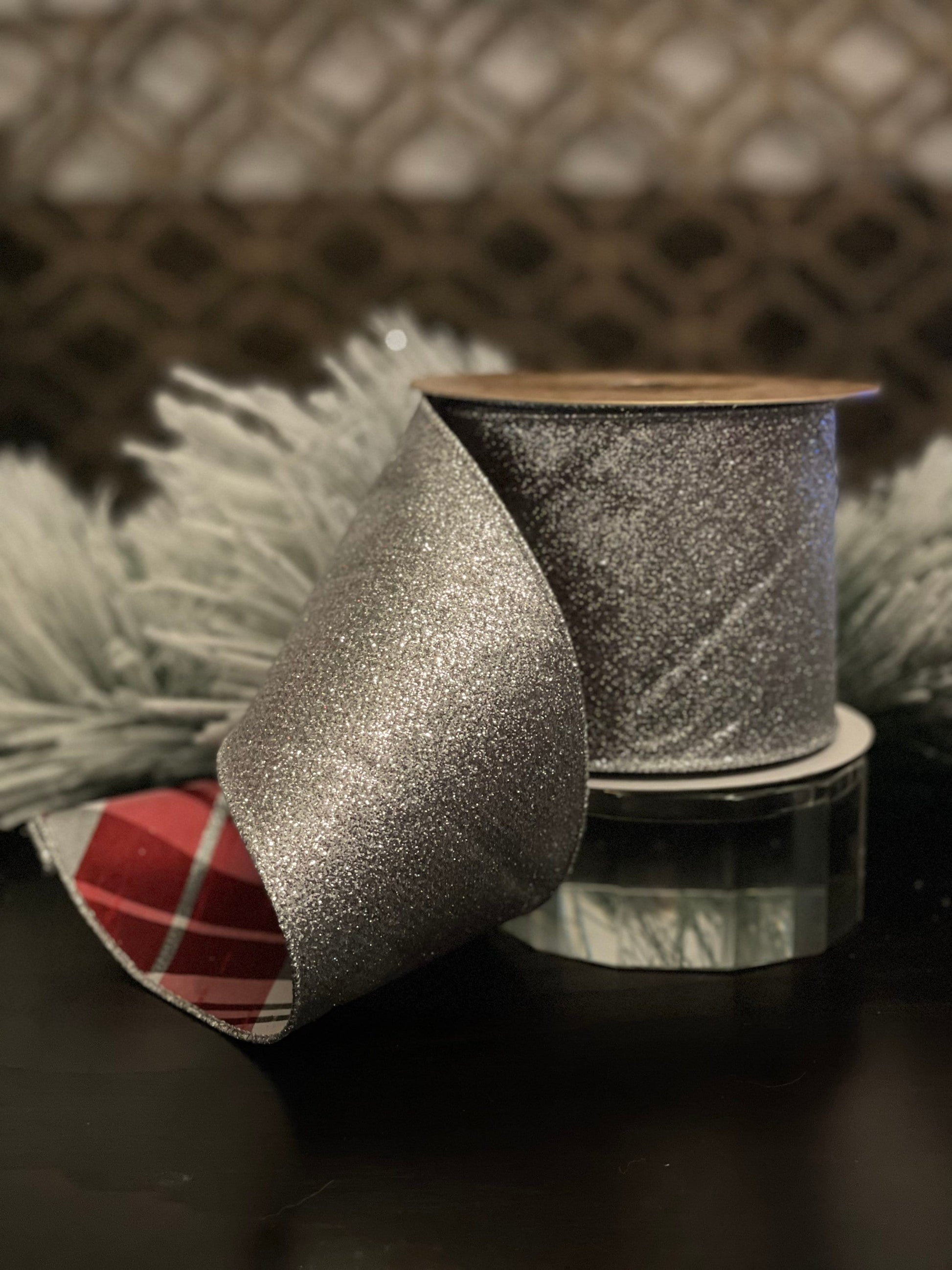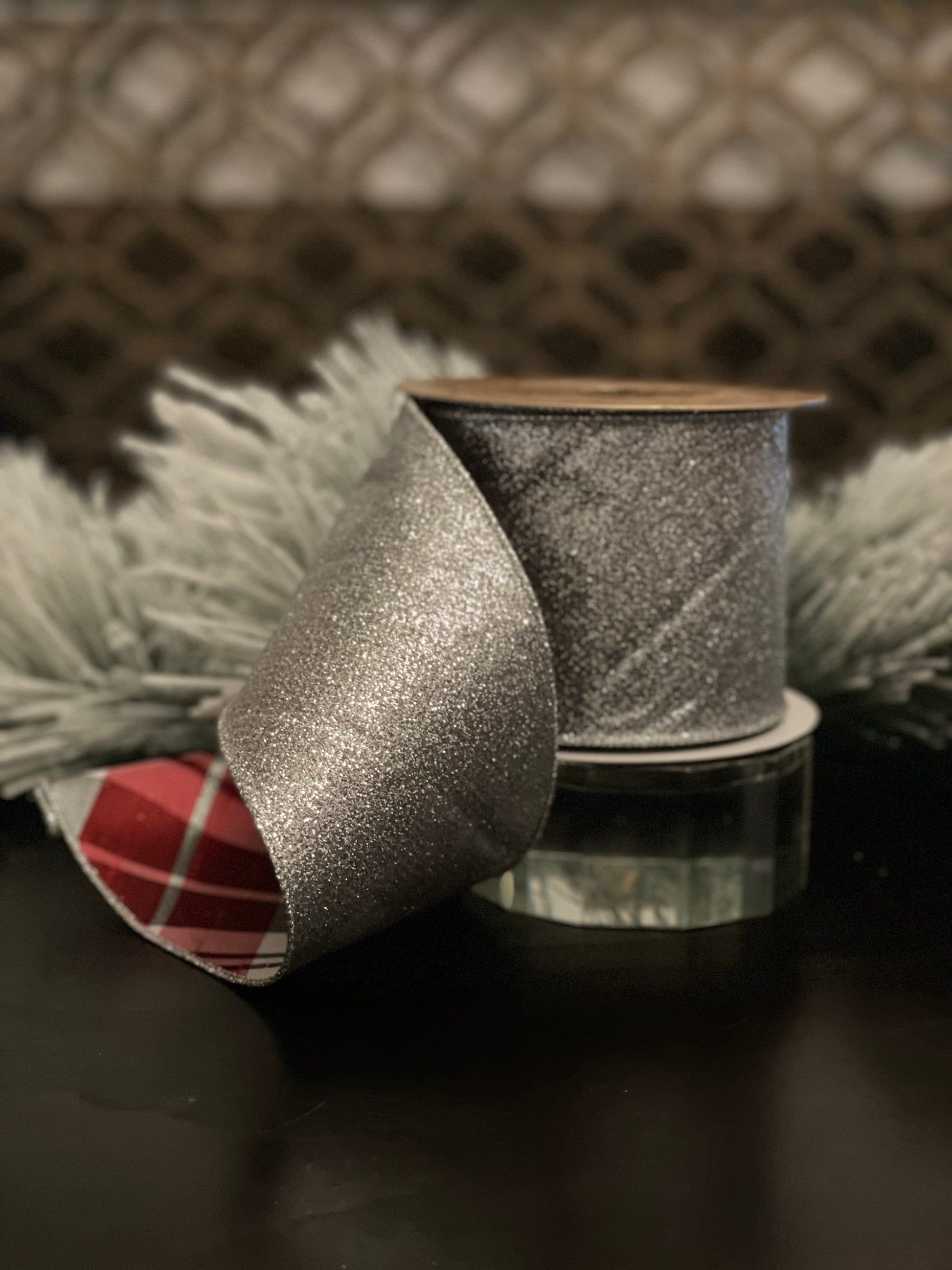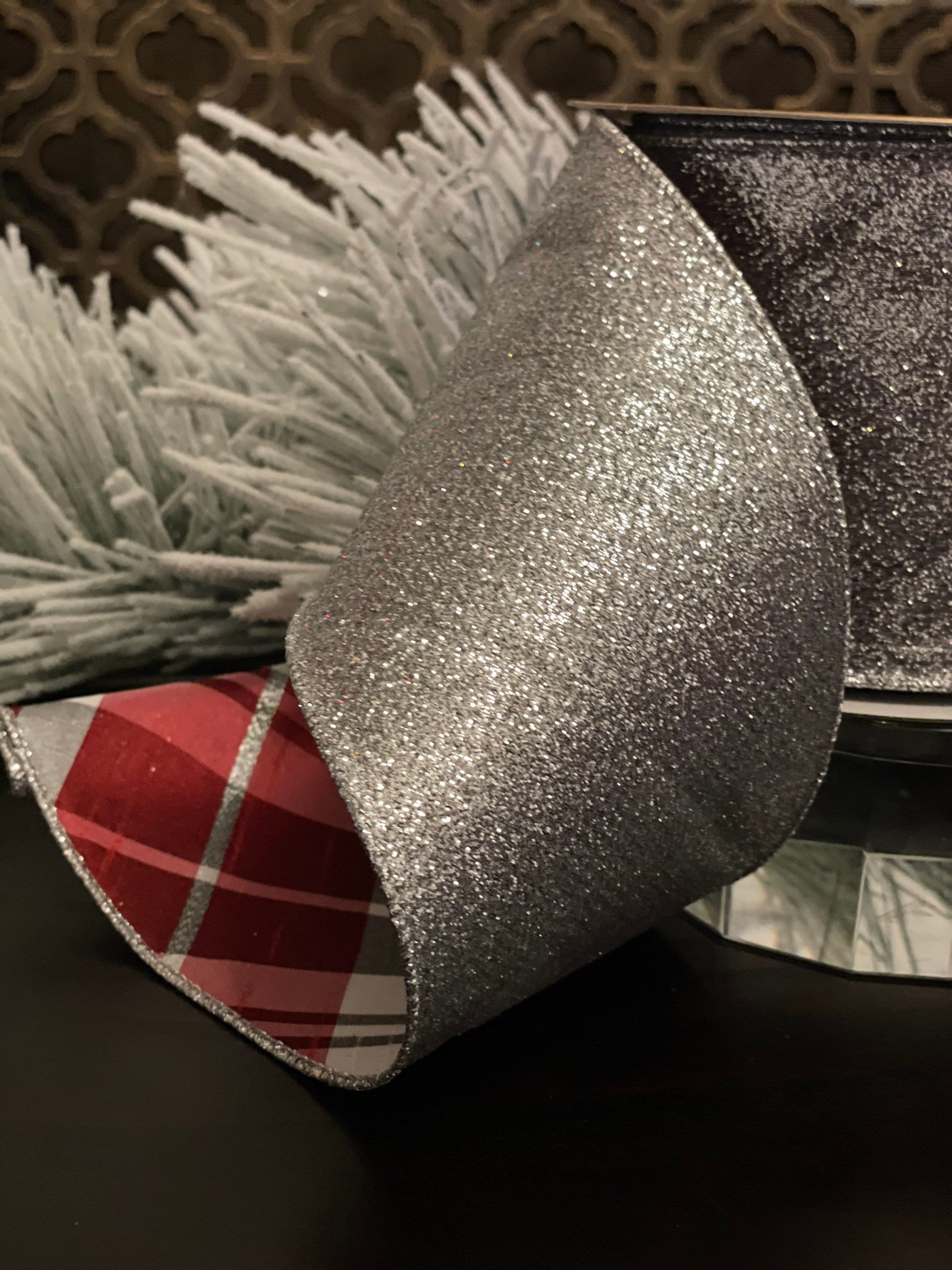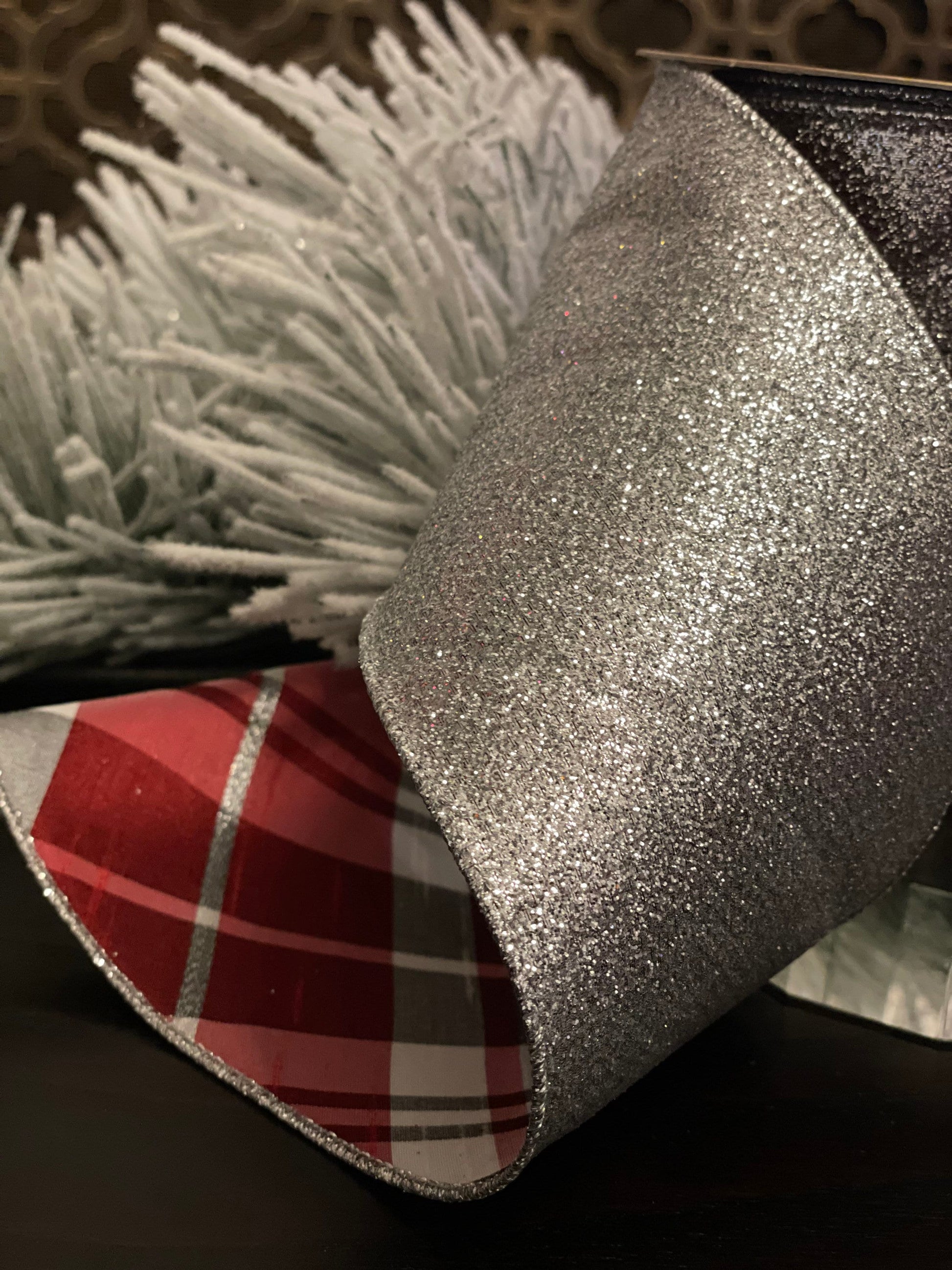 4" X 10 Yards Plaid on the bias. Red and silver. Glitter. Farrisilk. Wired.