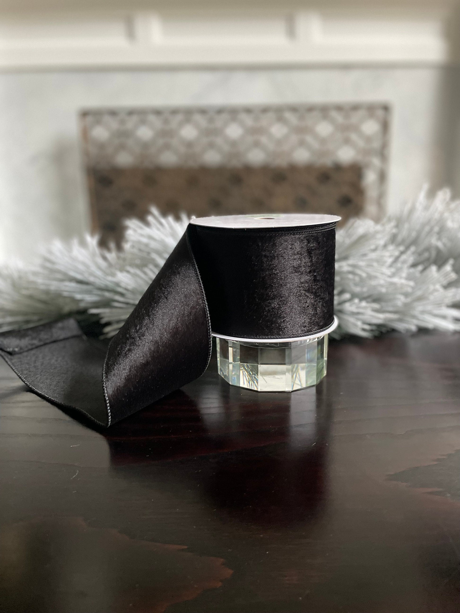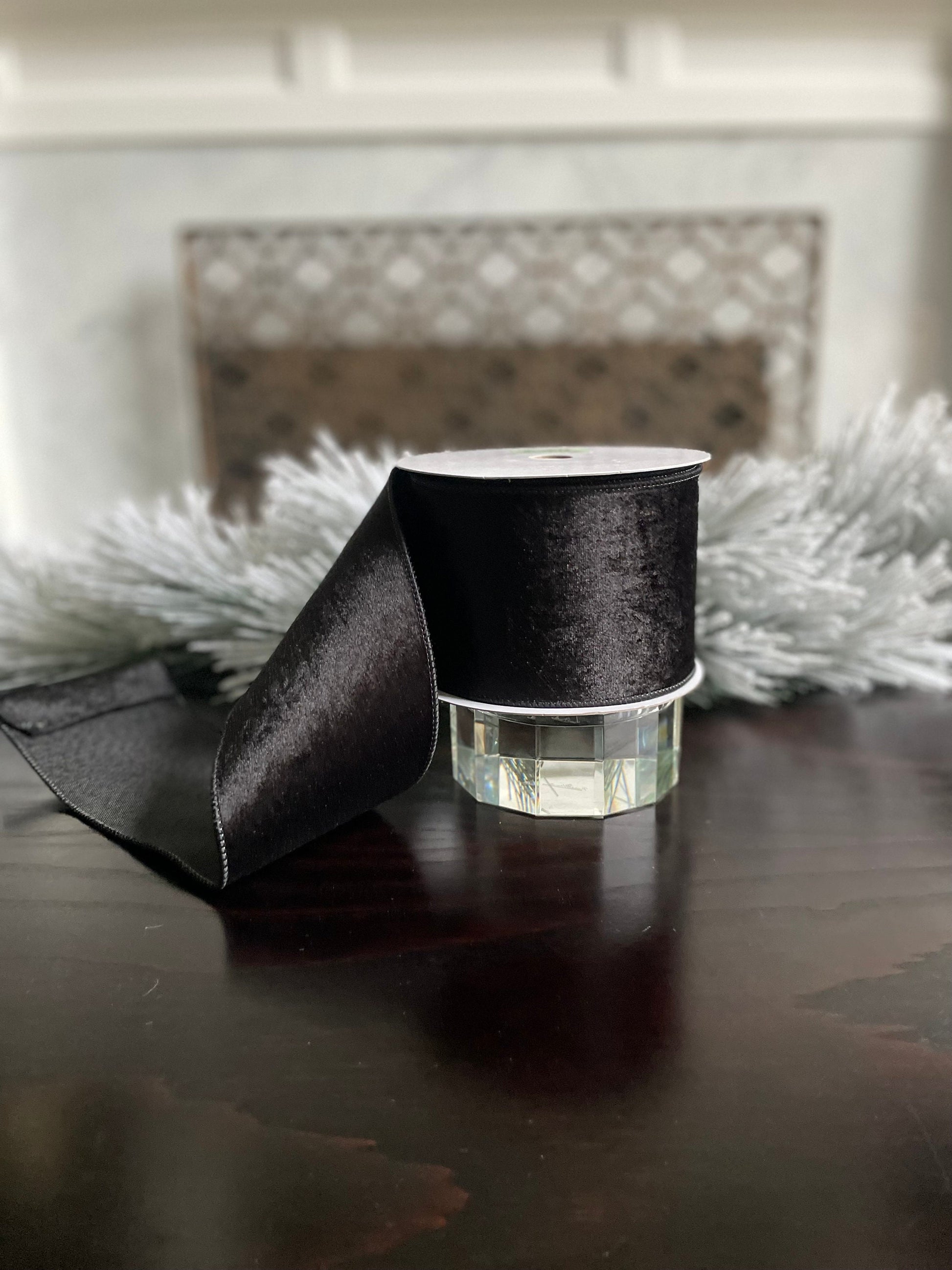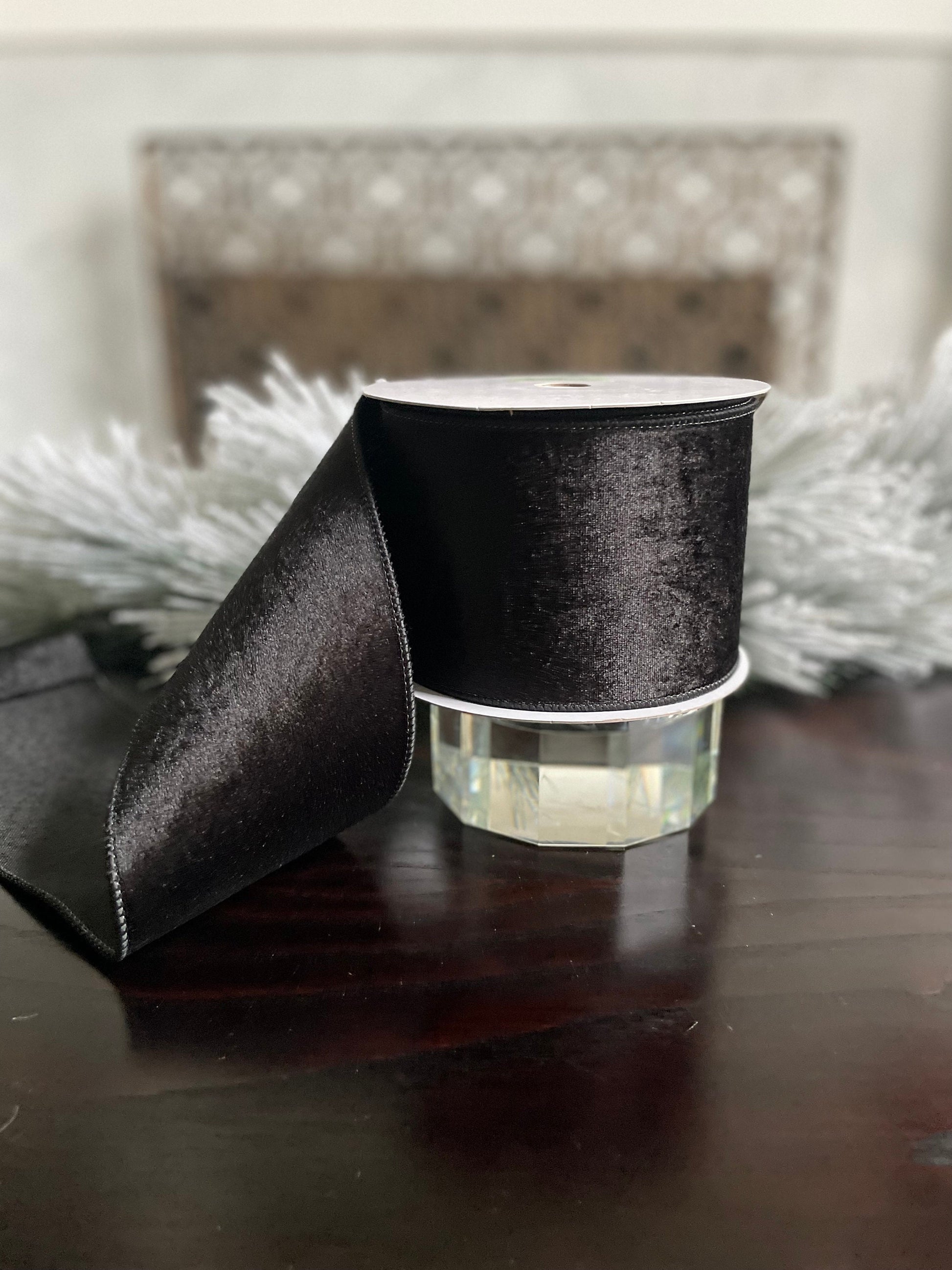 4” x 10 yds. Black velvet with dupion back ribbon. Wired. Regency.