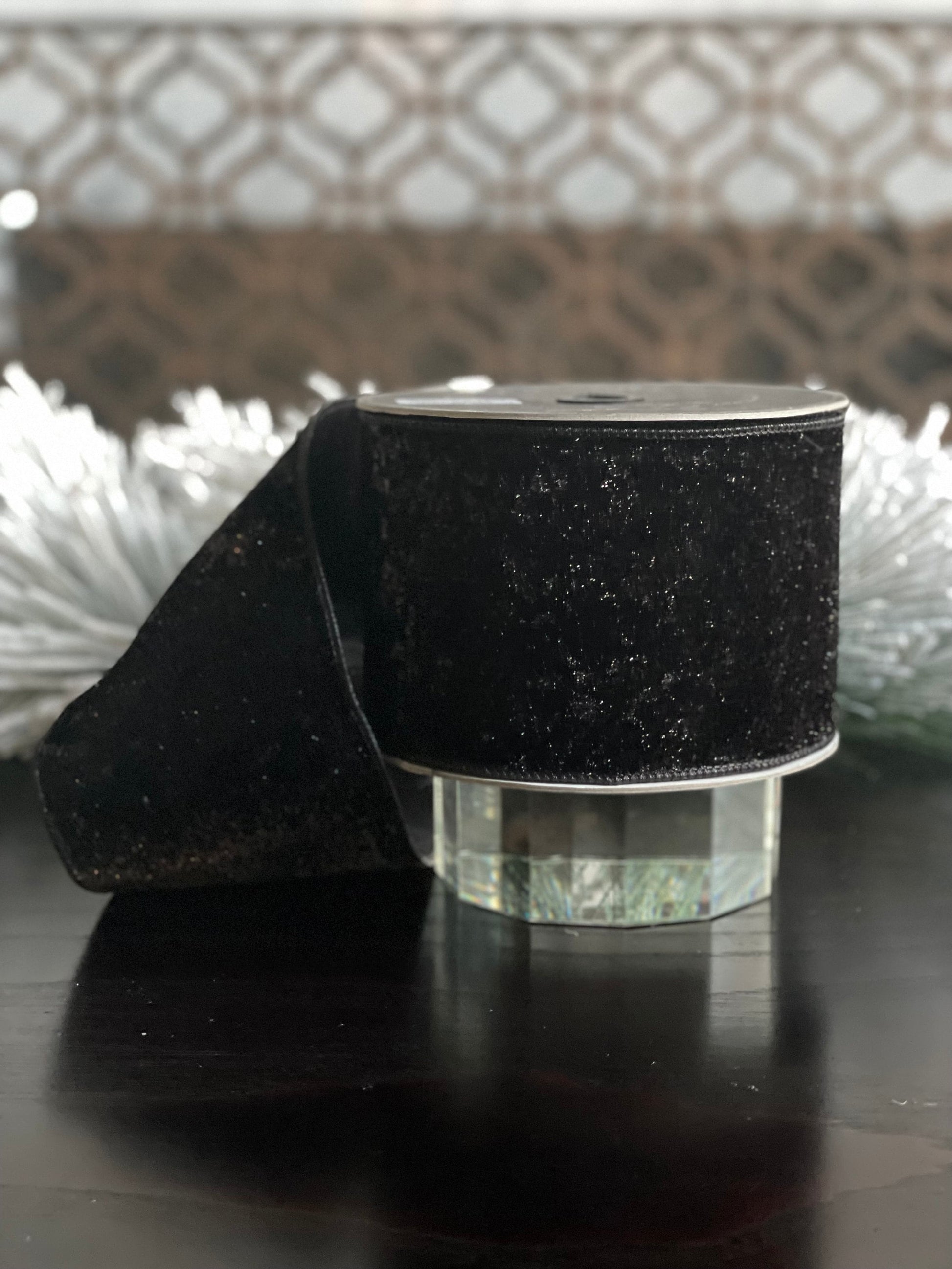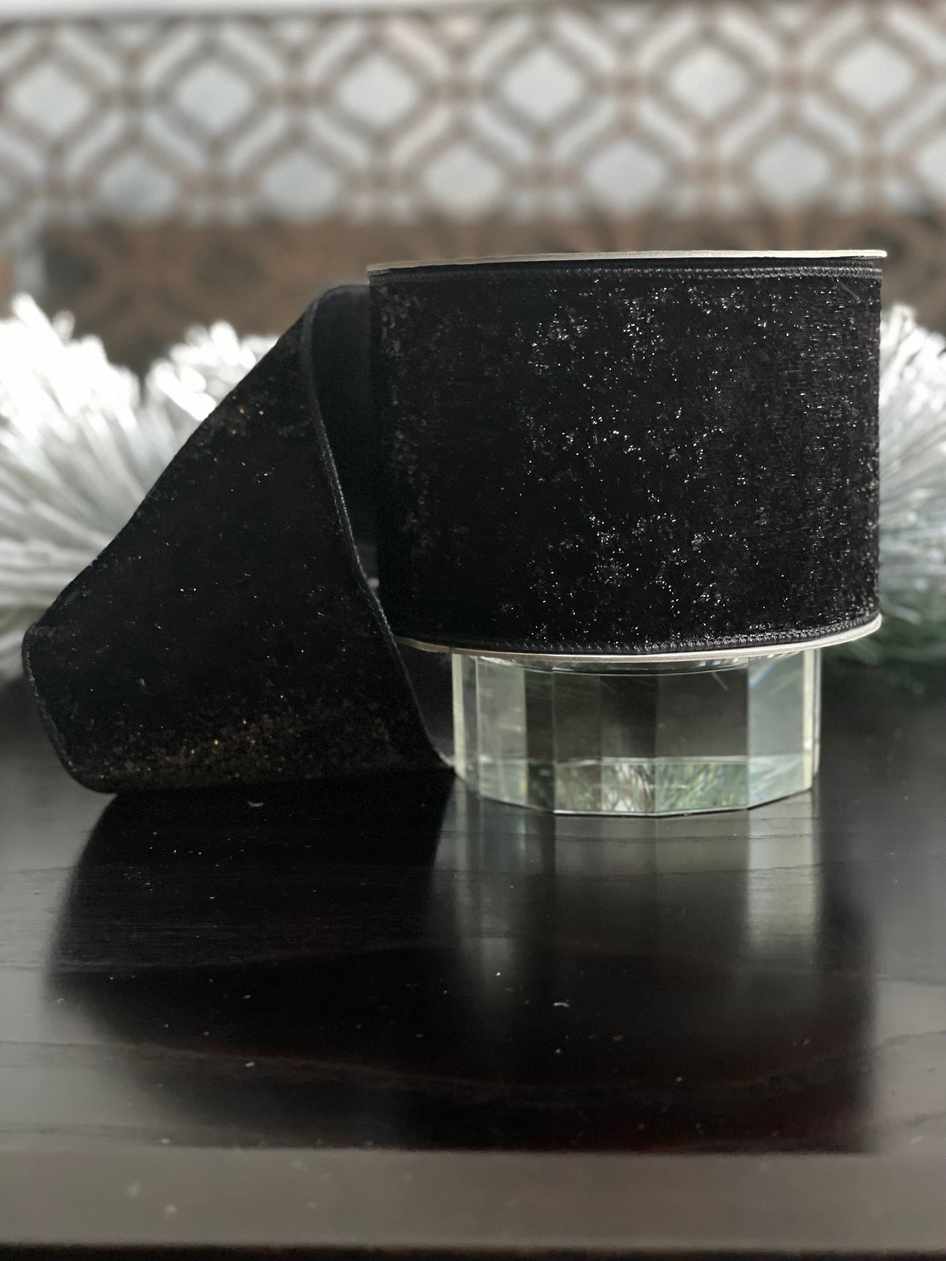 Designer lame velvet black ribbon. 4”x 10 yards. Wired. Farrisilk.